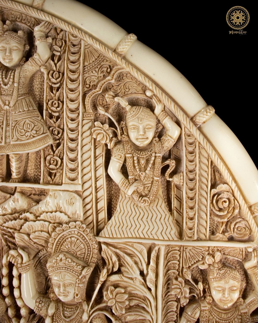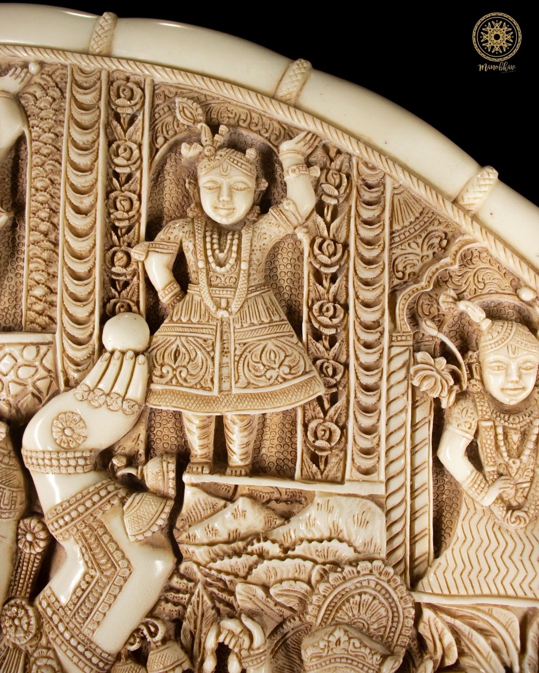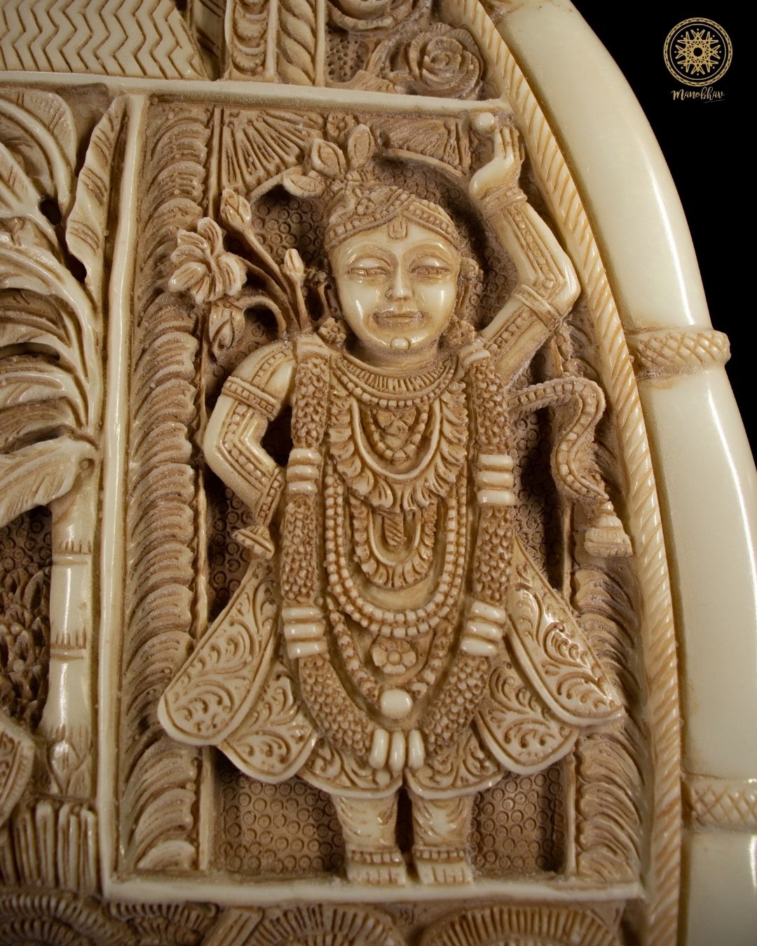 Inspired by traditional Nathdwara art, this Shrinathji wall hanging features detailed carvings and a beautiful visual representation of Lord Krishna as Shrinathji. The fine craftsmanship ensures a vintage, antique appeal, making it an classic religious wall art that combines spirituality with artistic beauty.