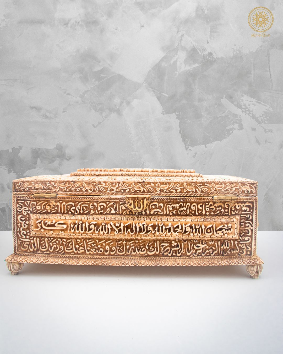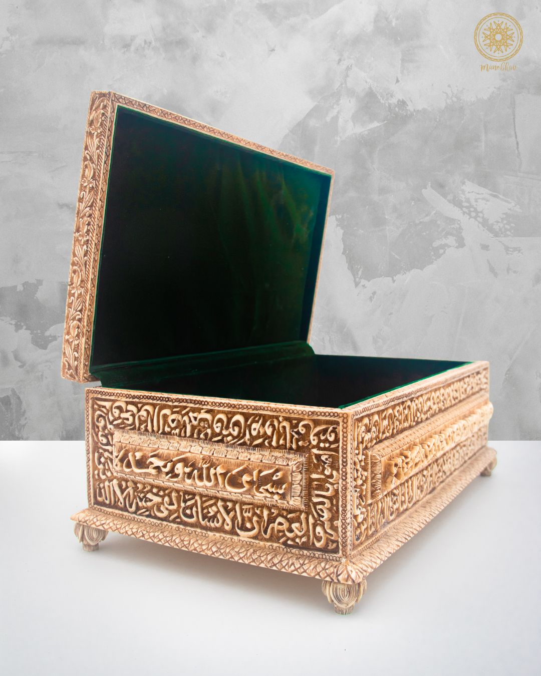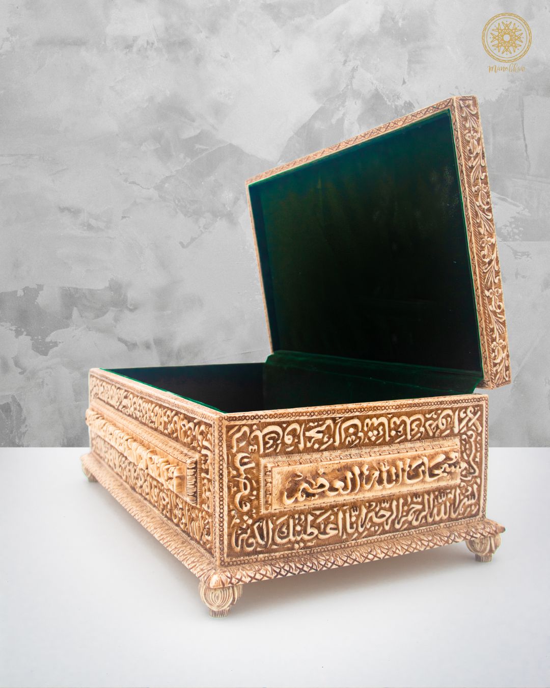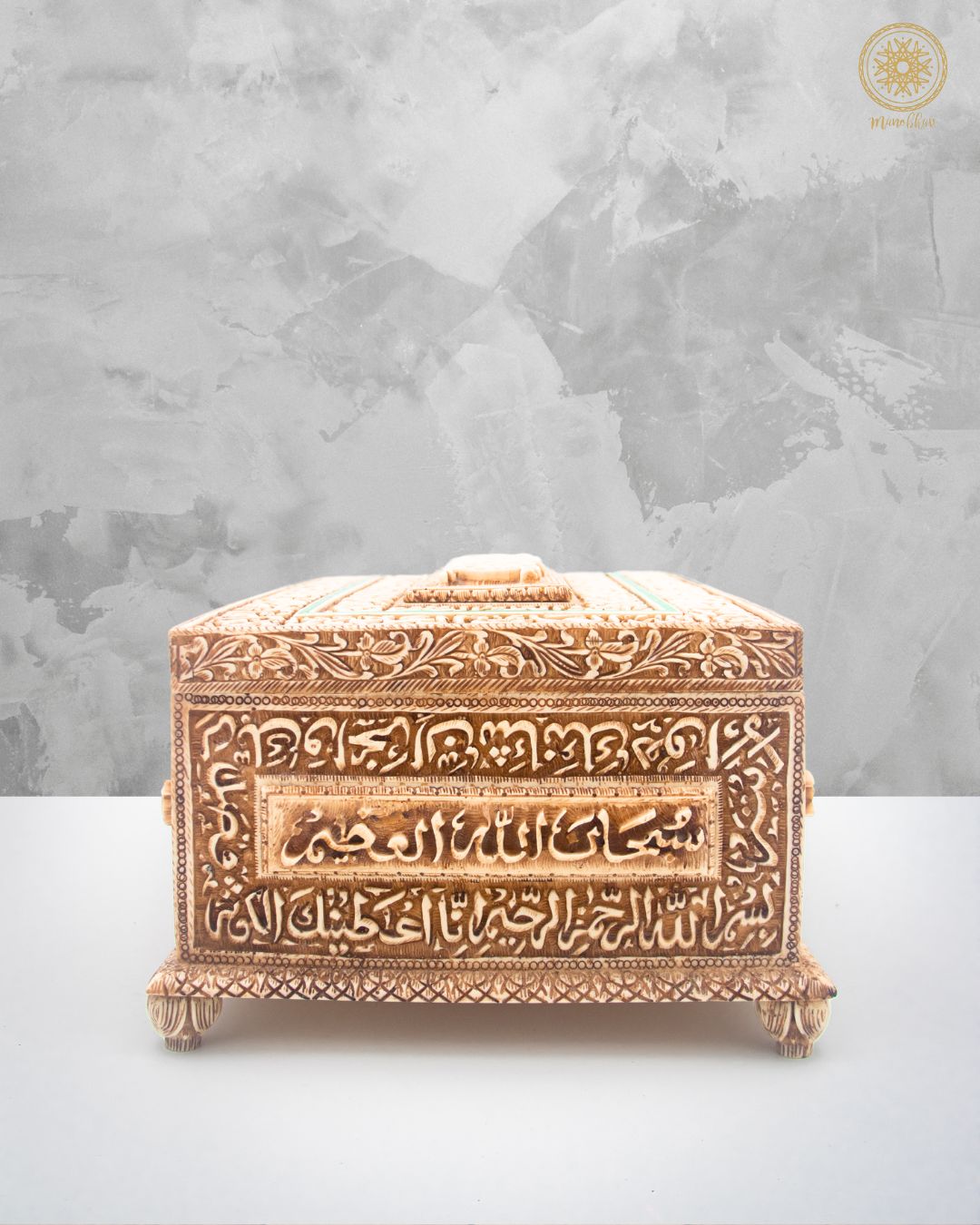 Erleben Sie unsere Vintage-Schmuckschatulle, ein seltenes Stück, das Luxus und Kunstfertigkeit vereint. Diese einzigartige Schmuckschatulle ist mit detaillierten arabischen Schnitzereien verziert und mit Malachit geschmückt, was sie von anderen Schatullen unterscheidet. Alle Ihre beliebtesten Schmuckstücke finden bequem darin Platz und können dort aufbewahrt werden, einschließlich eines Schmuckkästchens für die hängenden Ketten. Diese antike Schmuckschatulle ist aus hochwertigen Materialien hergestellt und mit exquisiter Handarbeit gefertigt, was Ihrem Interieur einen Hauch von Klasse und Stil verleiht. Sie dient zur sicheren Aufbewahrung von Schmuck und kann auch als schöne Schmuckverpackung verwendet werden. In dieser Schmucktruhe können Ohrringe oder Ringe oder sogar Armbänder aufbewahrt werden, denn sie ist die ideale Schmuckschatulle für jedes Durcheinander. Dieses moderne Schmuckaufbewahrungsstück versetzt Sie zurück in die Zeit großer Tradition und komplizierter Handwerkskunst.