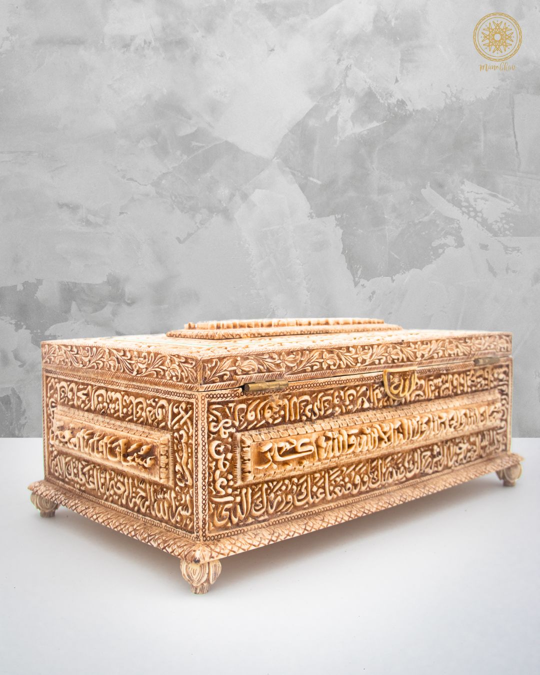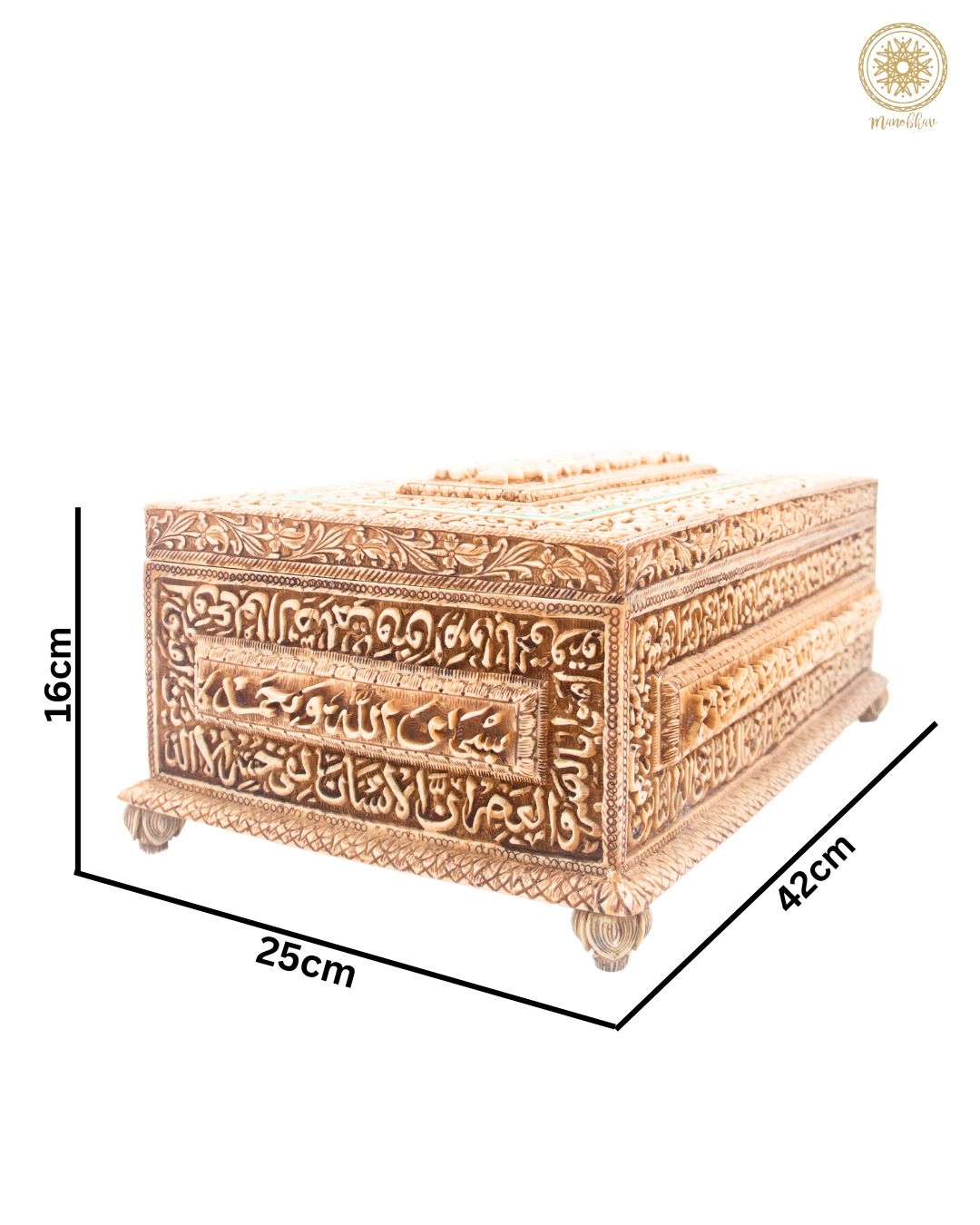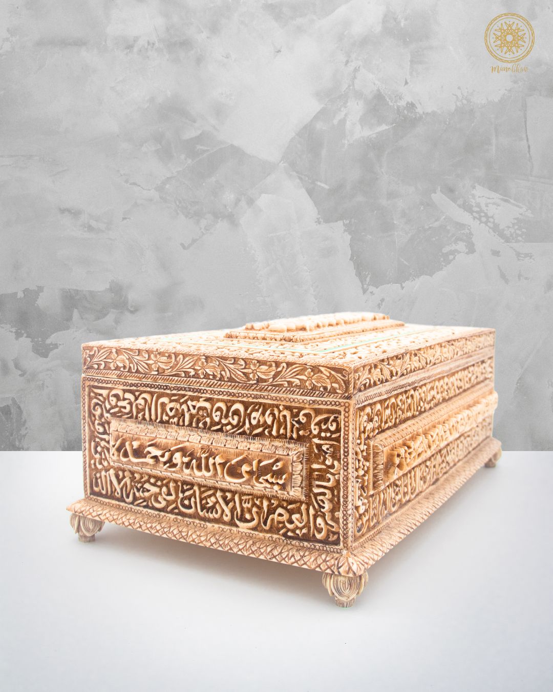 Erleben Sie unsere Vintage-Schmuckschatulle, ein seltenes Stück, das Luxus und Kunstfertigkeit vereint. Diese einzigartige Schmuckschatulle ist mit detaillierten arabischen Schnitzereien verziert und mit Malachit geschmückt, was sie von anderen Schatullen unterscheidet. Alle Ihre beliebtesten Schmuckstücke finden bequem darin Platz und können dort aufbewahrt werden, einschließlich eines Schmuckkästchens für die hängenden Ketten. Diese antike Schmuckschatulle ist aus hochwertigen Materialien hergestellt und mit exquisiter Handarbeit gefertigt, was Ihrem Interieur einen Hauch von Klasse und Stil verleiht. Sie dient zur sicheren Aufbewahrung von Schmuck und kann auch als schöne Schmuckverpackung verwendet werden. In dieser Schmucktruhe können Ohrringe oder Ringe oder sogar Armbänder aufbewahrt werden, denn sie ist die ideale Schmuckschatulle für jedes Durcheinander. Dieses moderne Schmuckaufbewahrungsstück versetzt Sie zurück in die Zeit großer Tradition und komplizierter Handwerkskunst.