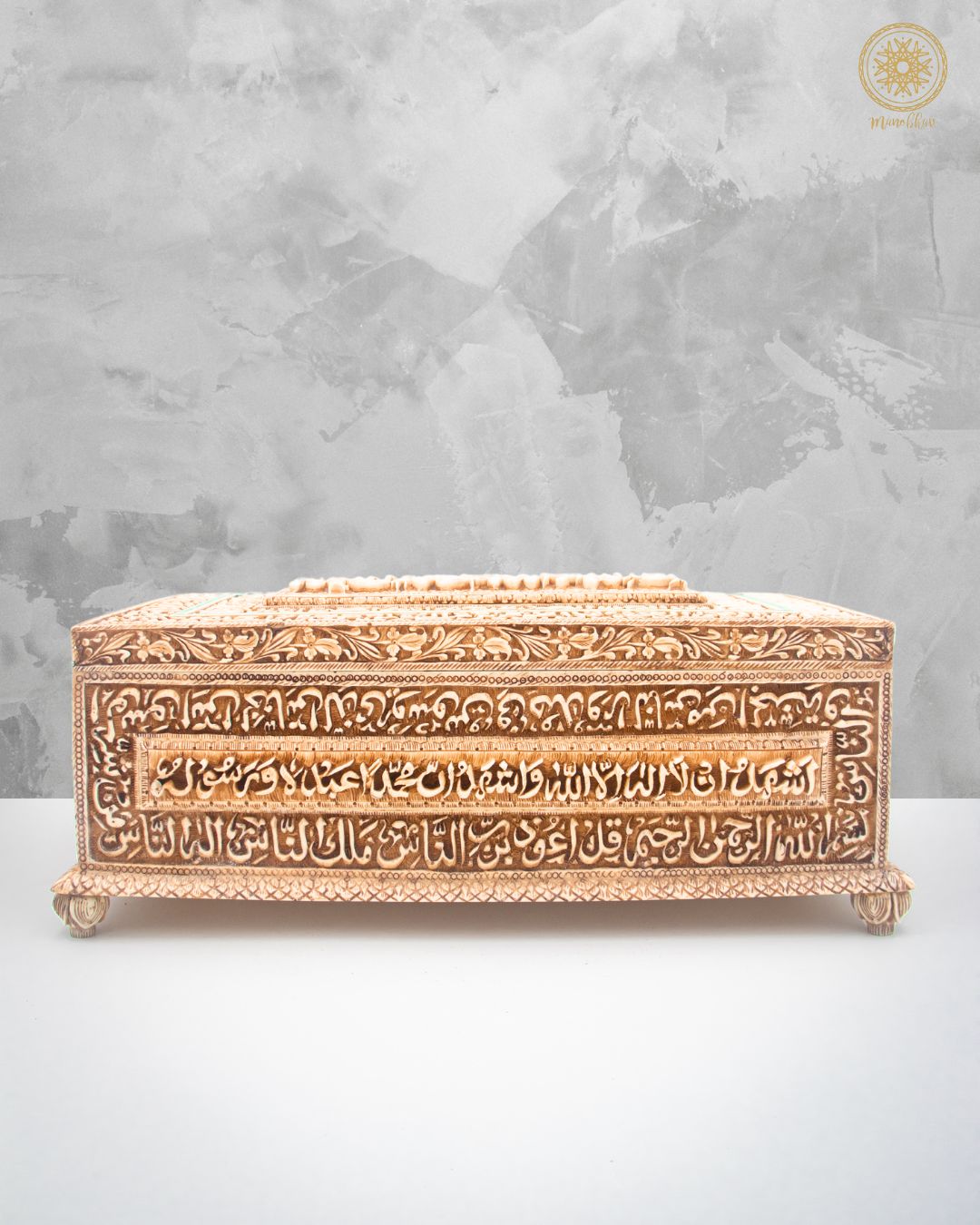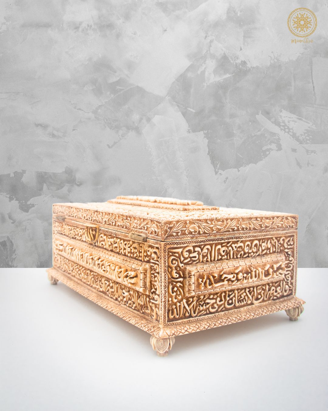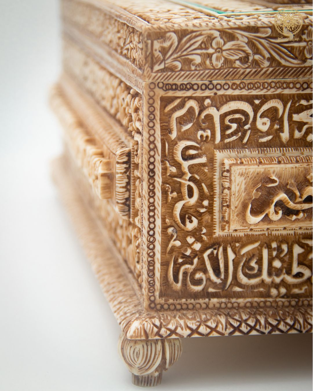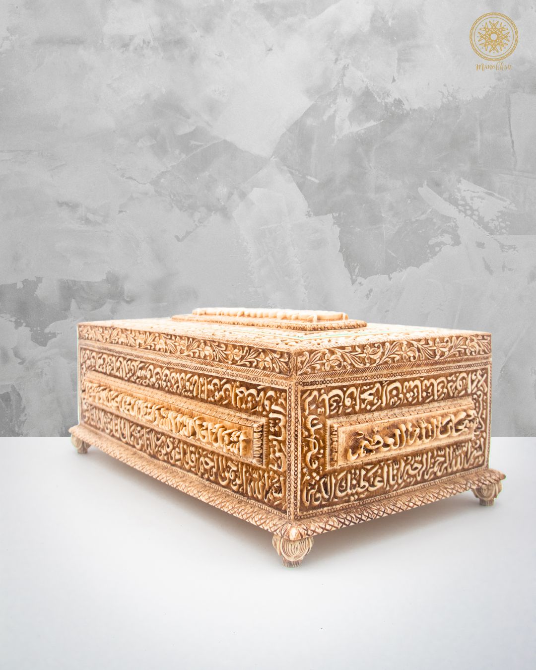 Erleben Sie unsere Vintage-Schmuckschatulle, ein seltenes Stück, das Luxus und Kunstfertigkeit vereint. Diese einzigartige Schmuckschatulle ist mit detaillierten arabischen Schnitzereien verziert und mit Malachit geschmückt, was sie von anderen Schatullen unterscheidet. Alle Ihre beliebtesten Schmuckstücke finden bequem darin Platz und können dort aufbewahrt werden, einschließlich eines Schmuckkästchens für die hängenden Ketten. Diese antike Schmuckschatulle ist aus hochwertigen Materialien hergestellt und mit exquisiter Handarbeit gefertigt, was Ihrem Interieur einen Hauch von Klasse und Stil verleiht. Sie dient zur sicheren Aufbewahrung von Schmuck und kann auch als schöne Schmuckverpackung verwendet werden. In dieser Schmucktruhe können Ohrringe oder Ringe oder sogar Armbänder aufbewahrt werden, denn sie ist die ideale Schmuckschatulle für jedes Durcheinander. Dieses moderne Schmuckaufbewahrungsstück versetzt Sie zurück in die Zeit großer Tradition und komplizierter Handwerkskunst.