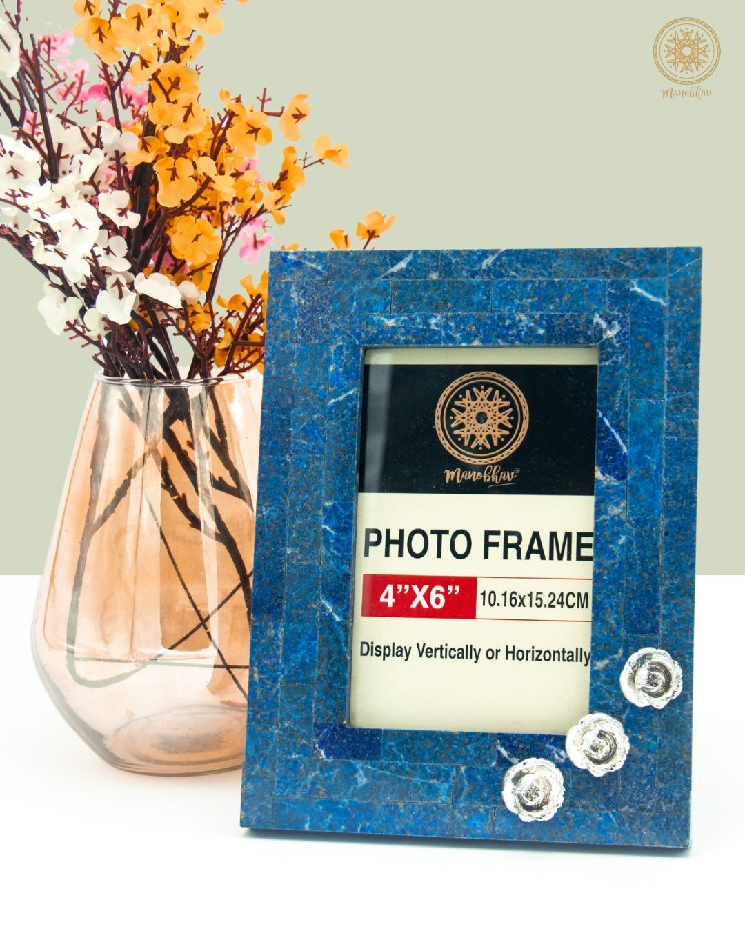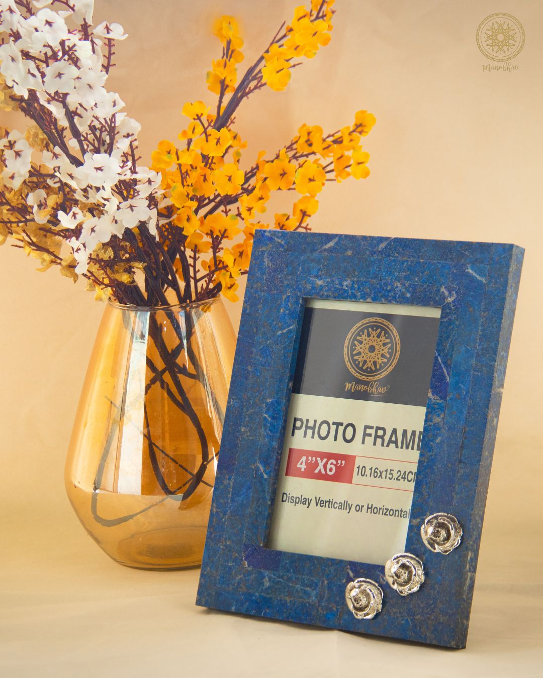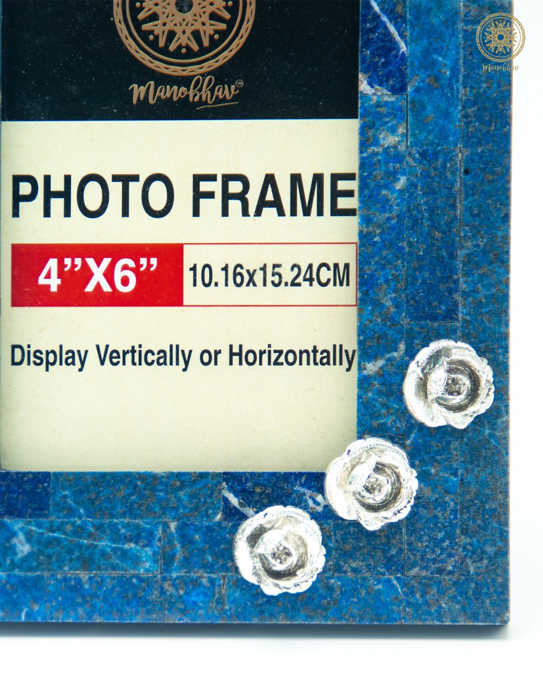 Der blaue Lapislazuli-Rahmen ist perfekt für ein 4 x 6 Zoll großes Bild und besteht aus Lapislazuli-Stein mit silbernen Rosen, die jedes Foto in ein Kunstwerk verwandeln.