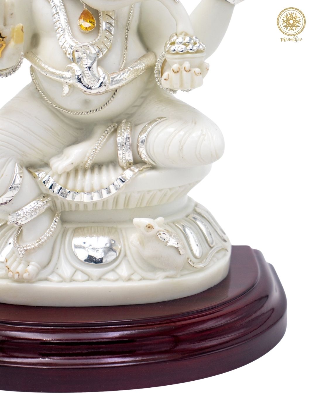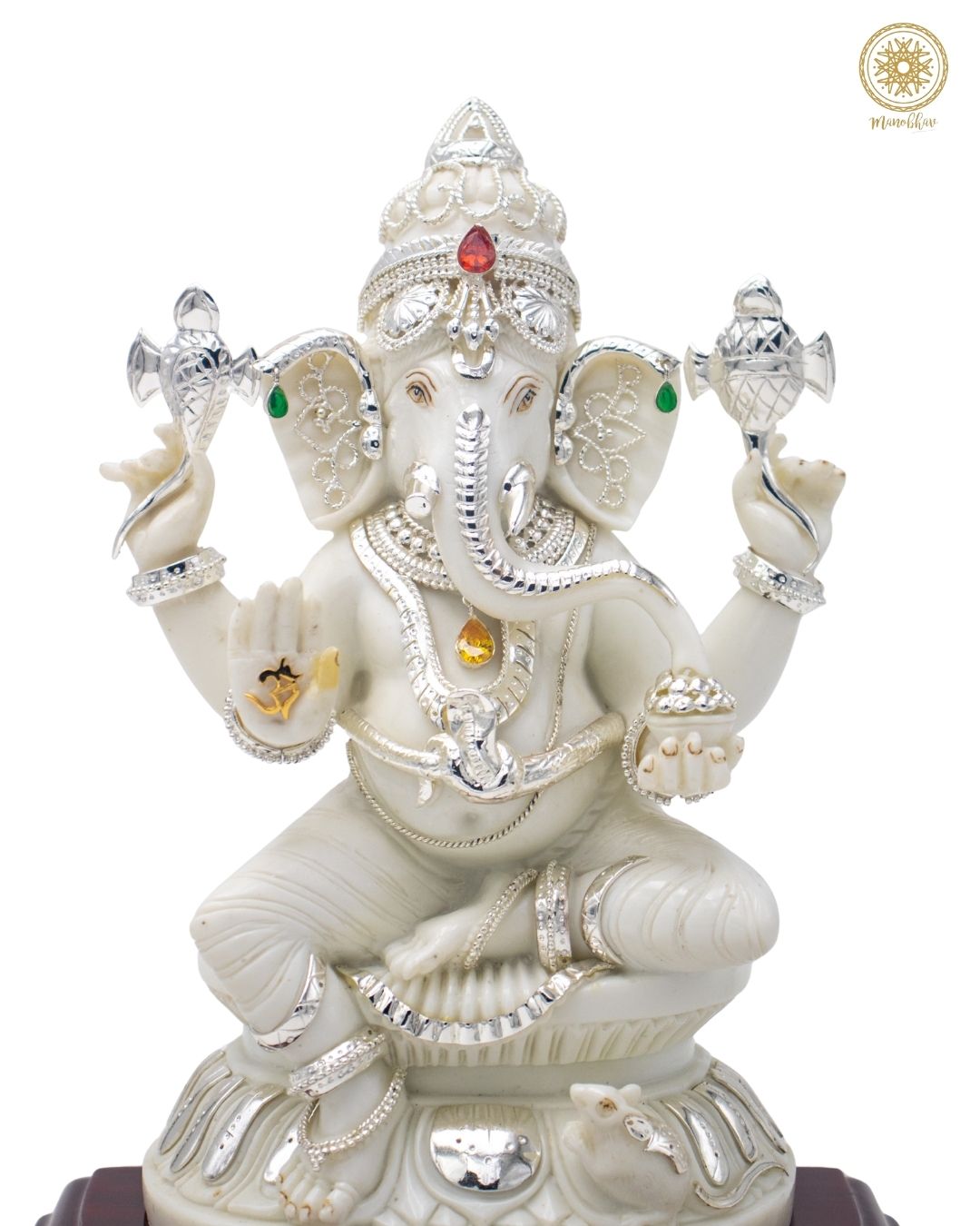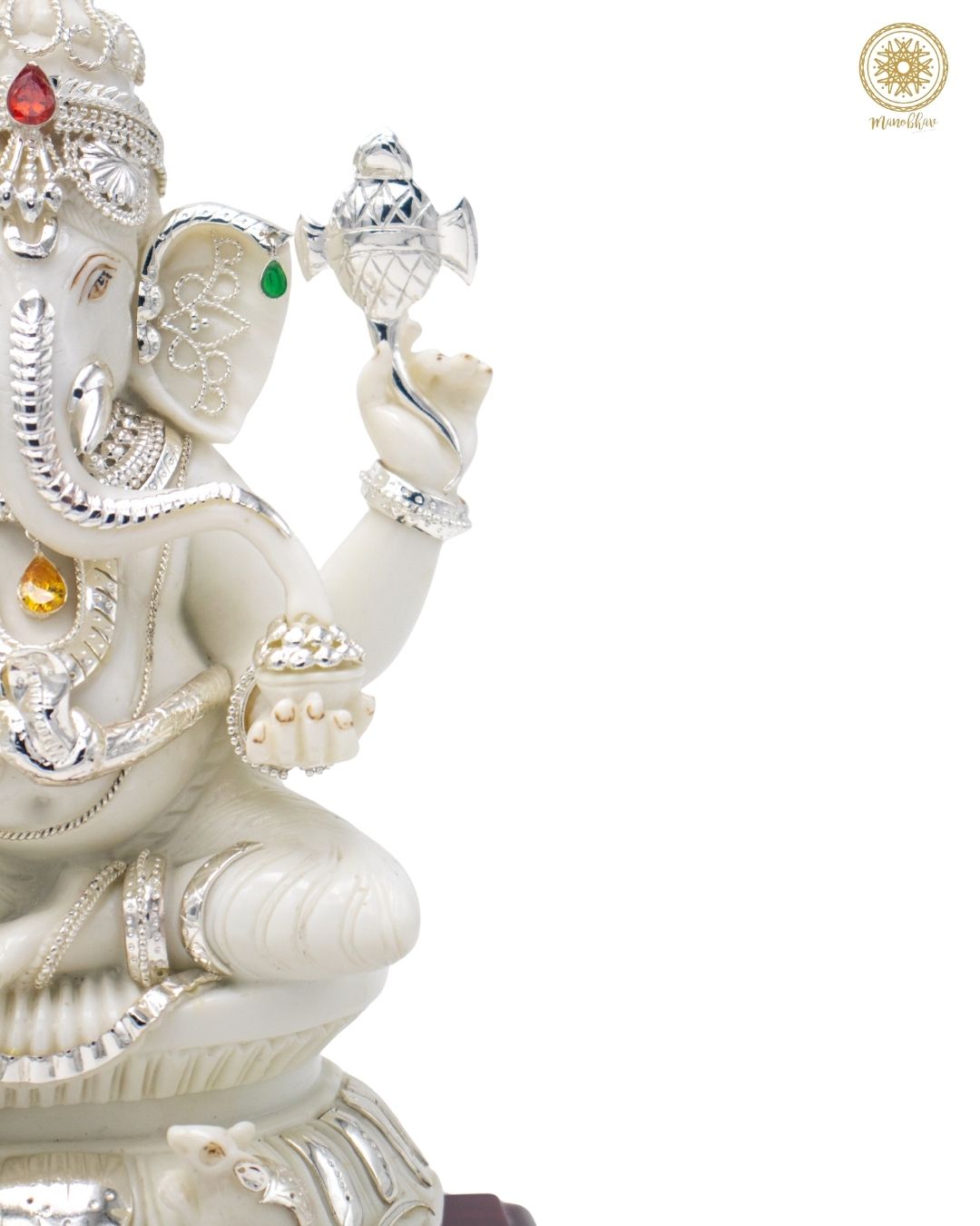 This beautiful idol of Lord Ganesha is carefully made with marble dust and decorated with shining silver-plated jewelry. Lord Ganesha is known as the remover of obstacles and the god of wisdom, success, and new beginnings. In this idol, Ganesha is sitting calmly with a happy face, holding his favorite sweets and showing blessings with his hands. His silver ornaments sparkle, making him look divine and royal.