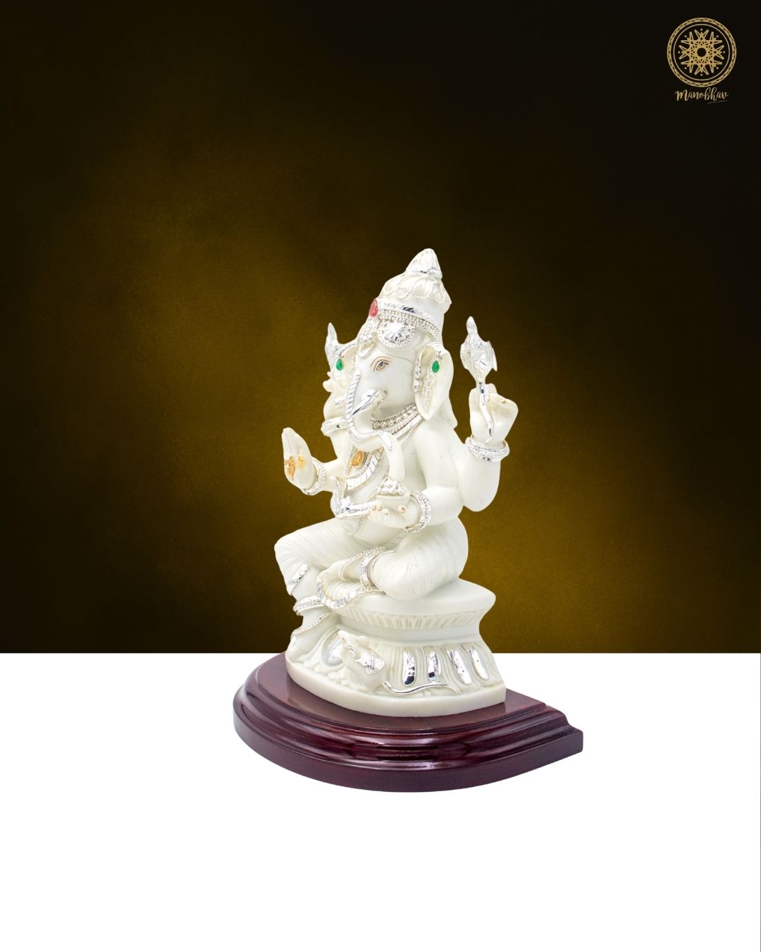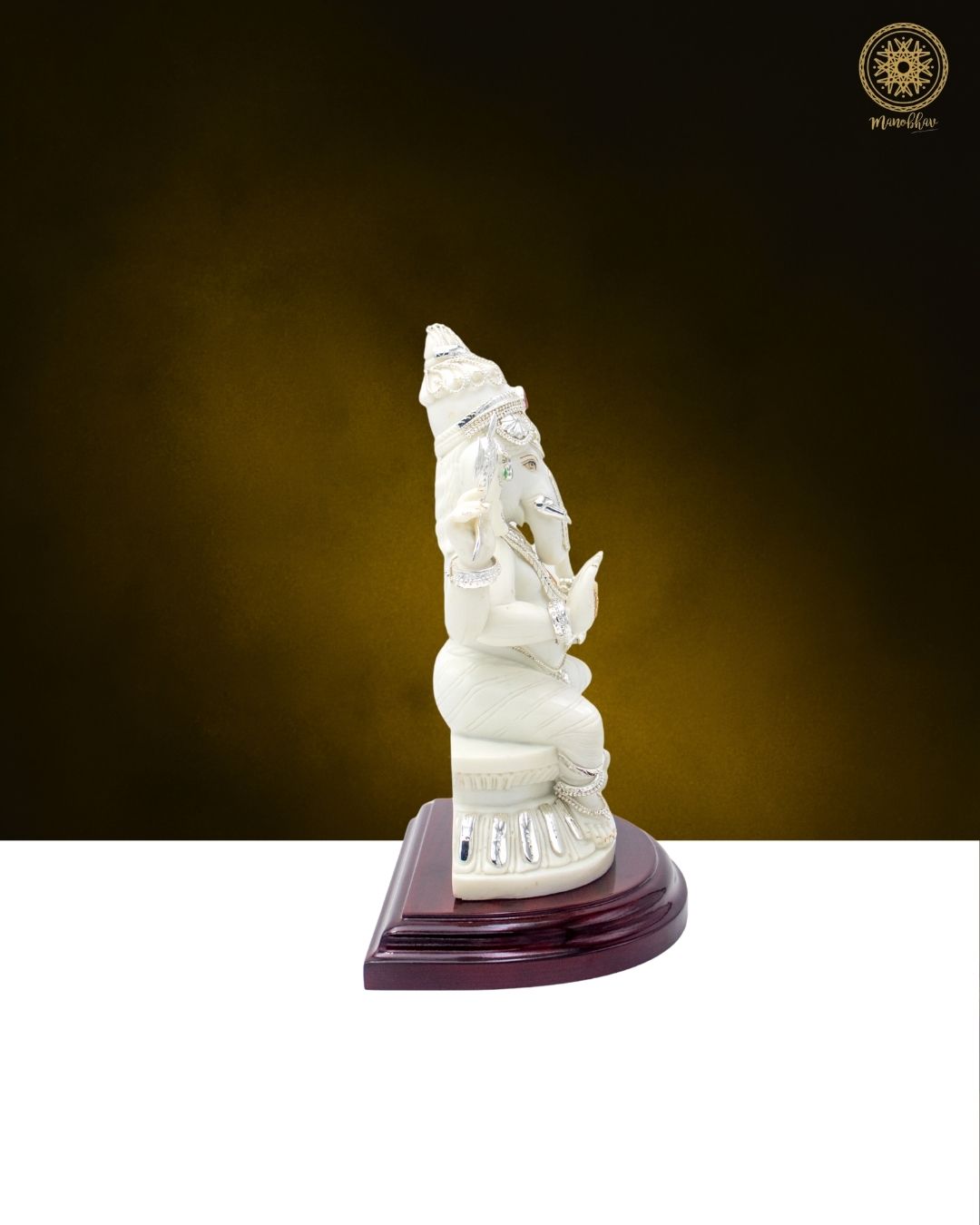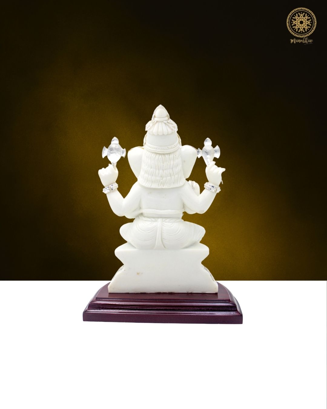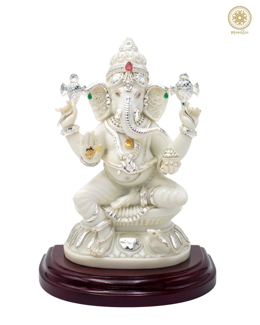 This beautiful idol of Lord Ganesha is carefully made with marble dust and decorated with shining silver-plated jewelry. Lord Ganesha is known as the remover of obstacles and the god of wisdom, success, and new beginnings. In this idol, Ganesha is sitting calmly with a happy face, holding his favorite sweets and showing blessings with his hands. His silver ornaments sparkle, making him look divine and royal.