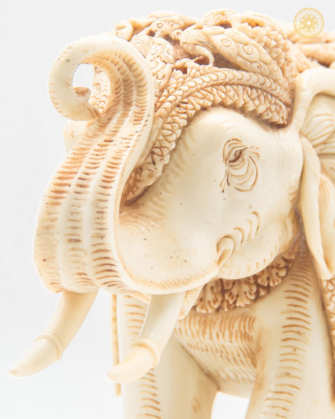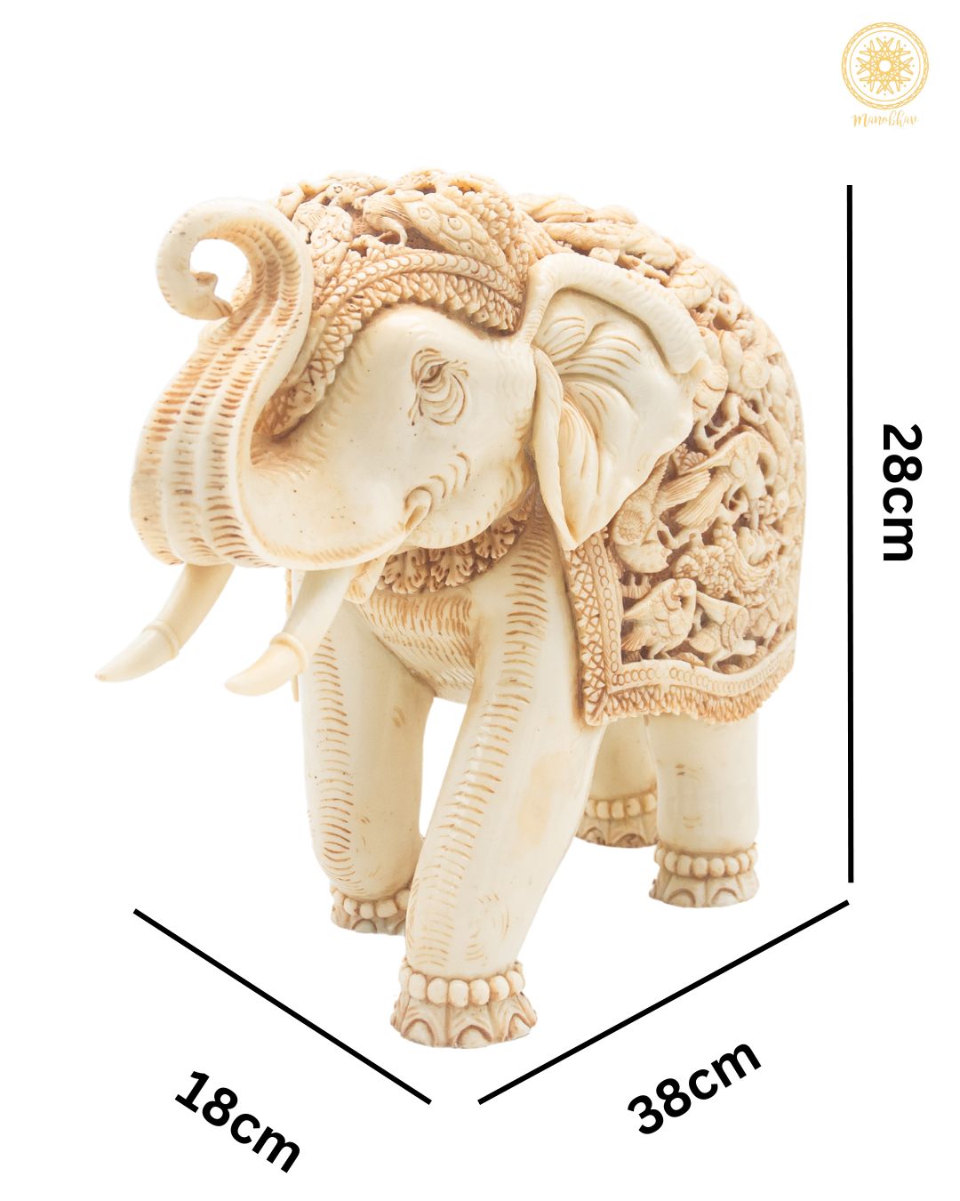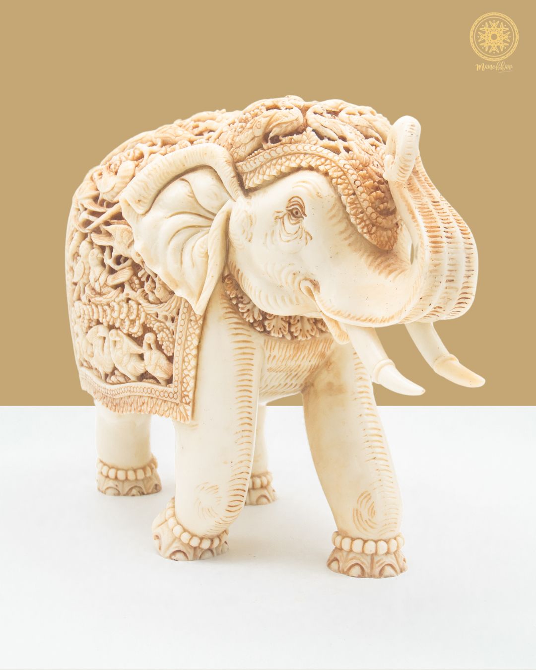Diese aufwendig geschnitzte Elefantenstatue aus Elfenbein ist ein Meisterwerk indischer Kunstfertigkeit und Handwerkskunst, von den filigranen Schnitzereien bis hin zur strukturierten Haltung. Jedes Detail dieser imposanten Kreatur wurde aufwendig von Hand aus hochwertigem Harz geschnitzt.