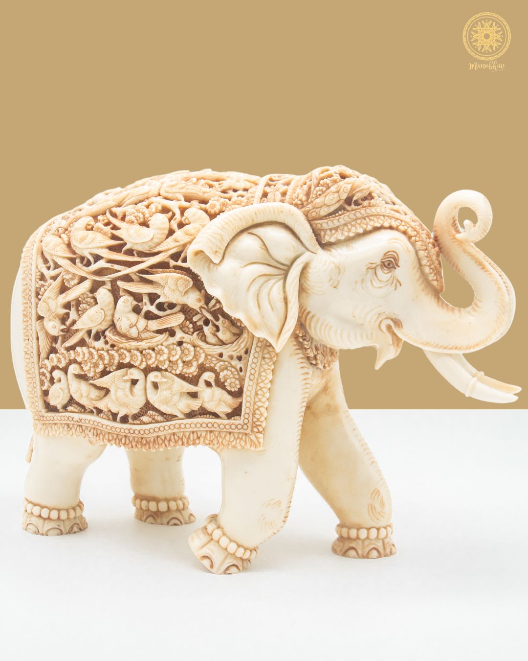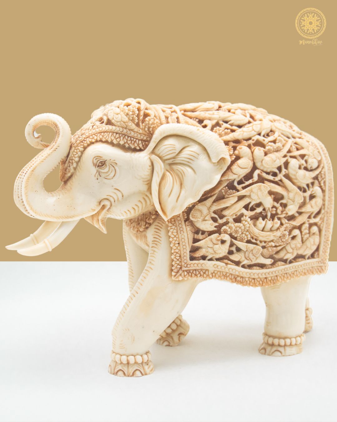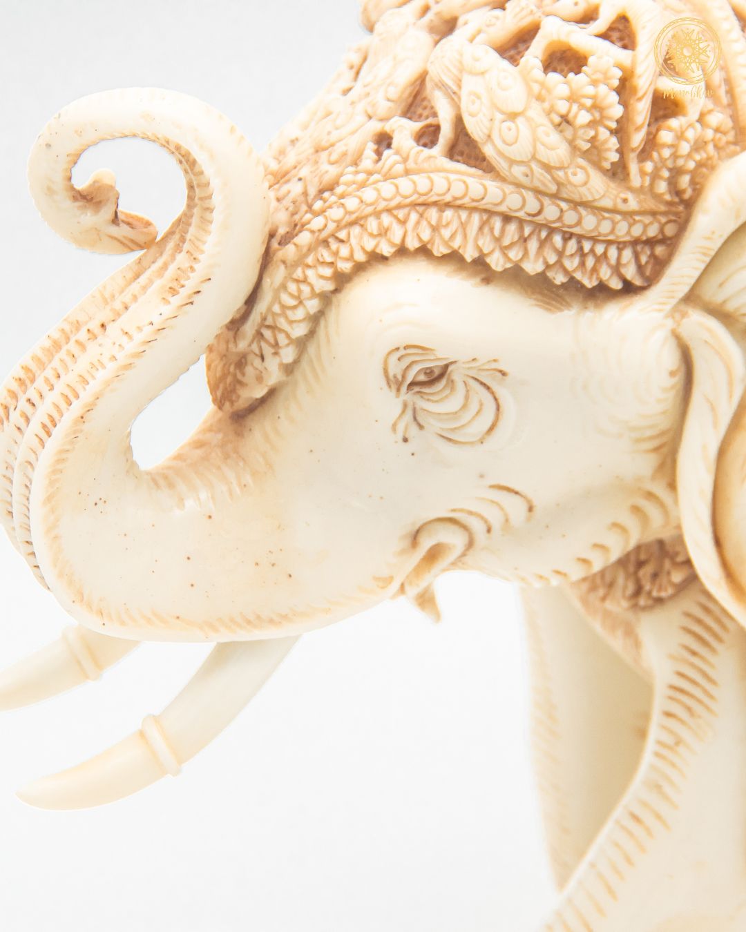 Diese aufwendig geschnitzte Elefantenstatue aus Elfenbein ist ein Meisterwerk indischer Kunstfertigkeit und Handwerkskunst, von den filigranen Schnitzereien bis hin zur strukturierten Haltung. Jedes Detail dieser imposanten Kreatur wurde aufwendig von Hand aus hochwertigem Harz geschnitzt.