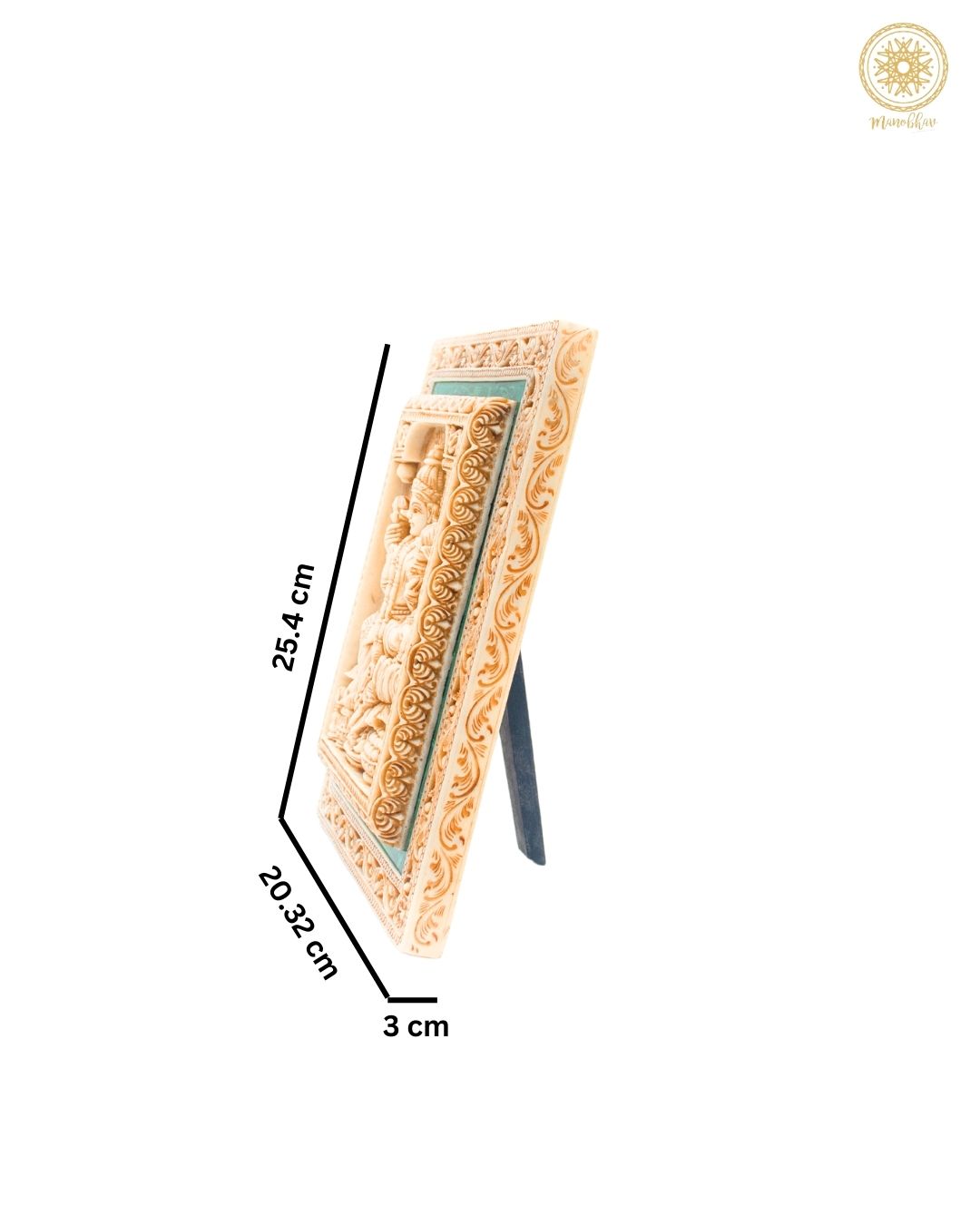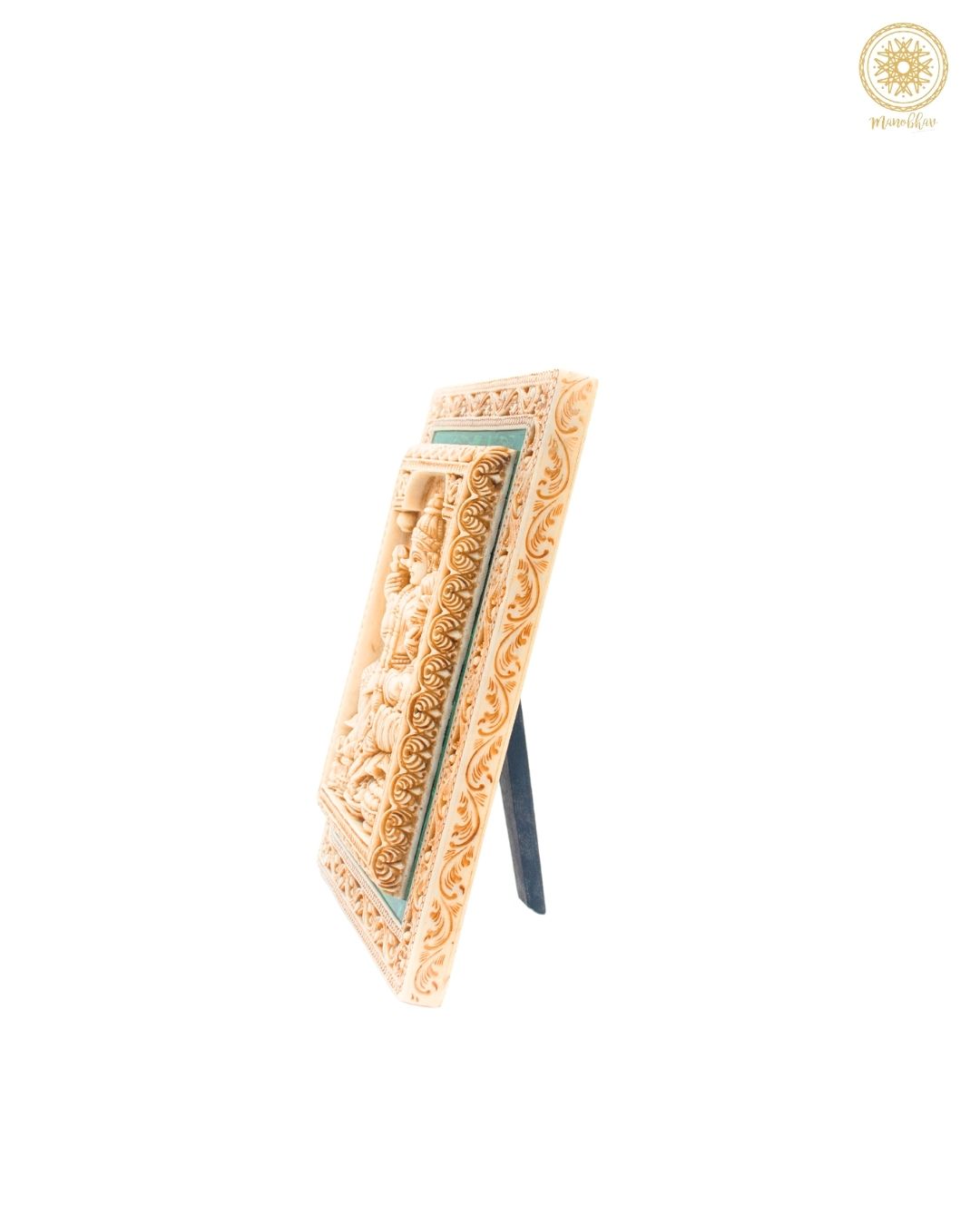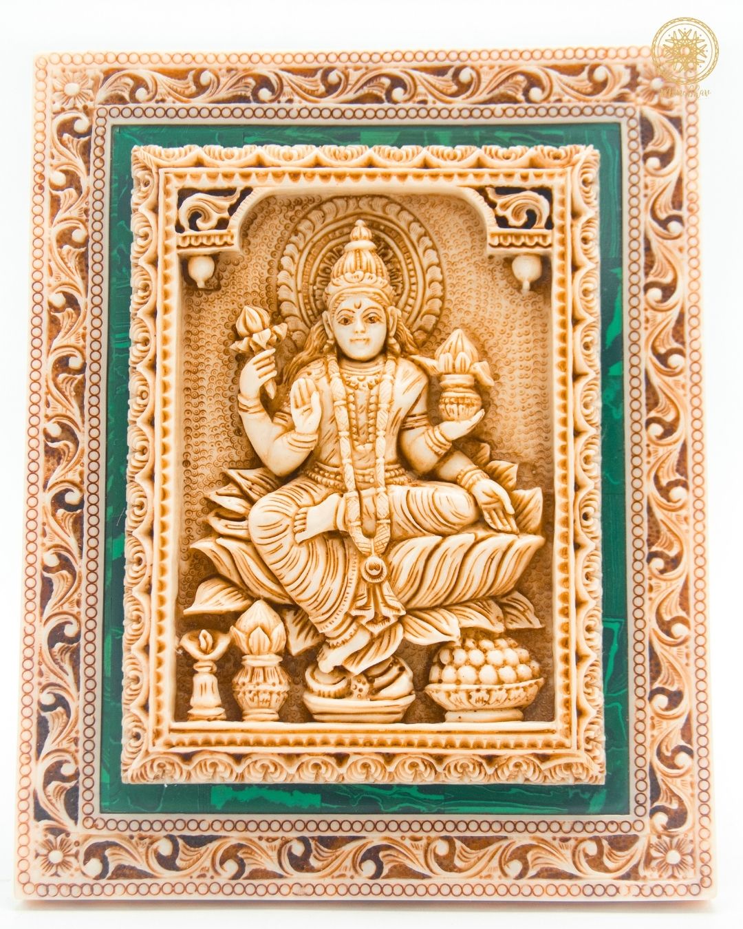 Dies ist ein seltenes Kunstwerk – eine einzigartig gestaltete, detaillierte Laxmi Ji Wandbehang für Ihr Zuhause, mit superfeinen Schnitzereien und einer Malachit-Einlage, die echtes Elfenbein imitiert. Einzigartiger Laxmi Ji Wandbehang für den Pooja-Raum. Dieses einzigartige Laxmi Ji Wandbild, das für einen Pooja-Raum gedacht ist, strahlt in jeder Umgebung Eleganz und kulturelles Erbe aus.