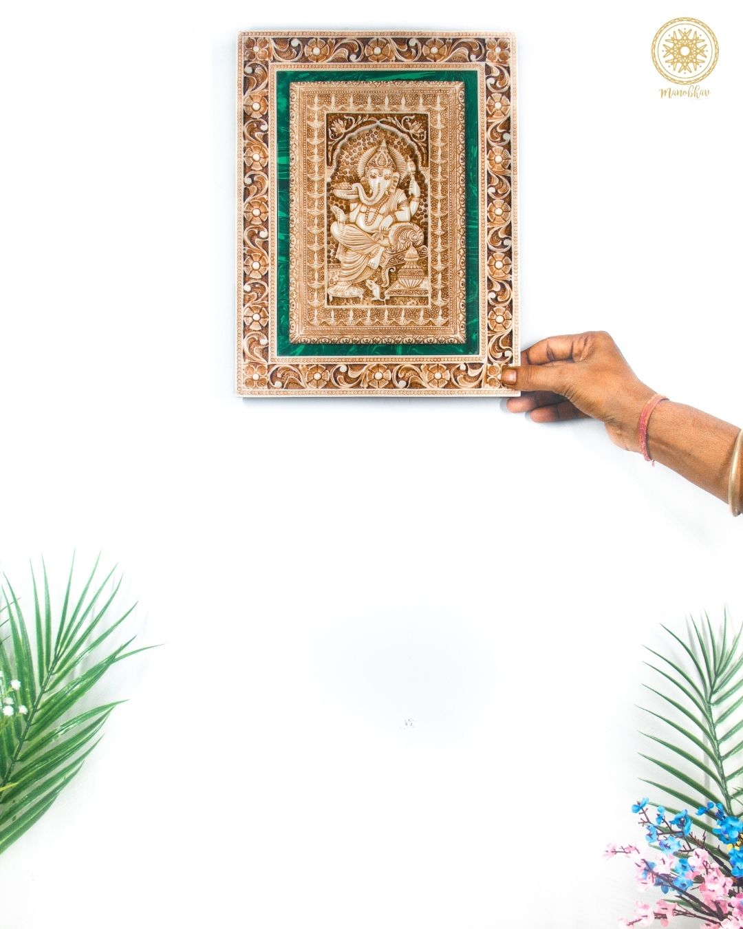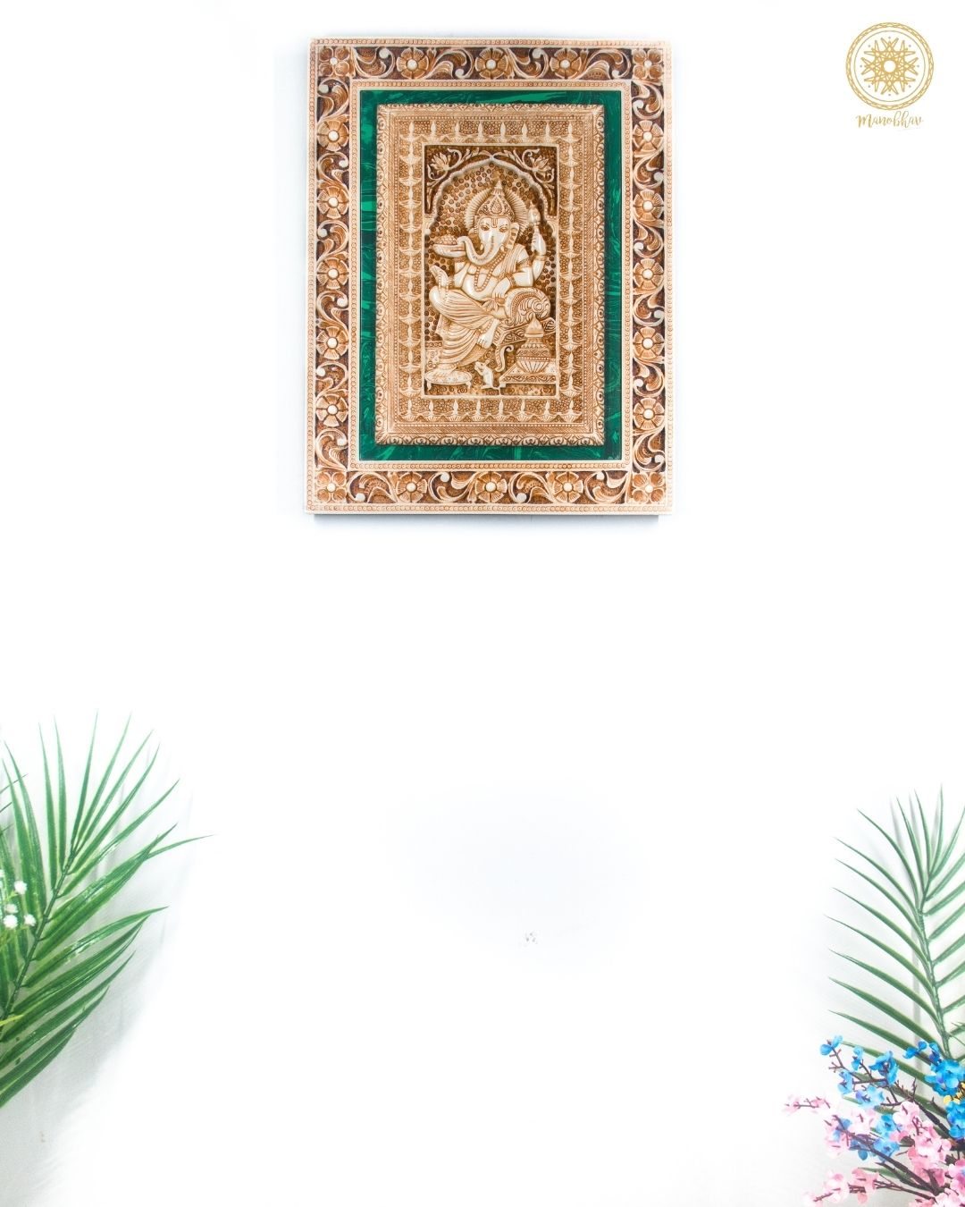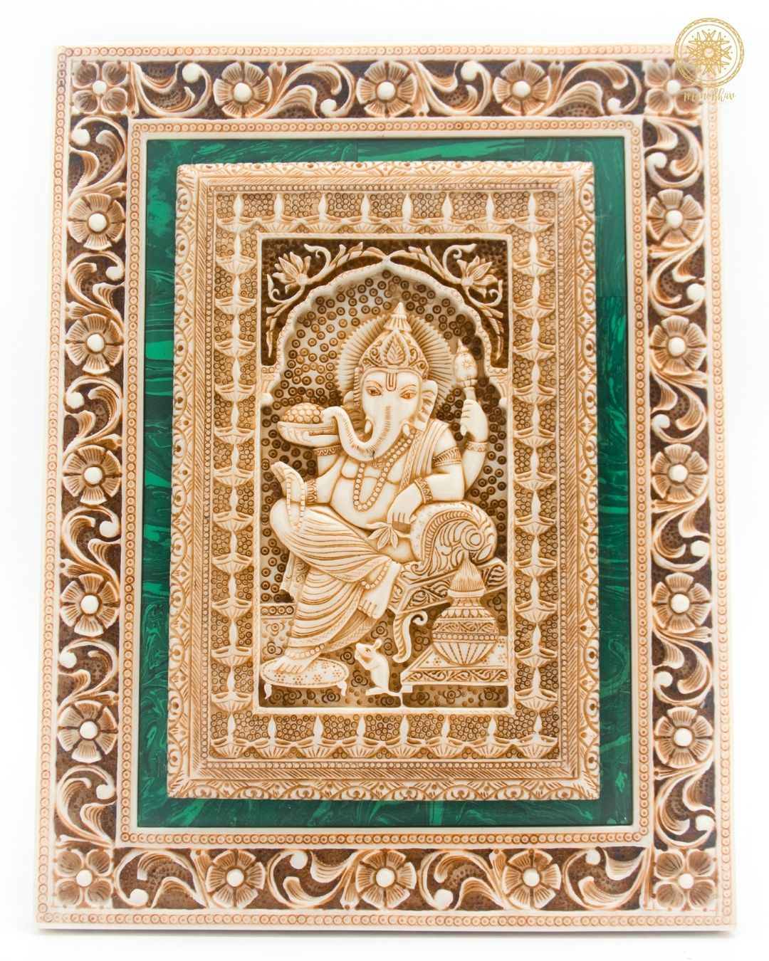 Verleihen Sie Ihrem Raum einen Hauch von ultimativer Eleganz mit dieser überaus exquisiten handgeschnitzten Wanddekoration von Lord Ganesh Ji. Lord Ganesh Ji, auch bekannt als der Meister der Weisheit und der Beseitiger von Hindernissen, ist in diesem Ganpati-Rahmen wunderschön und detailgetreu dargestellt.
