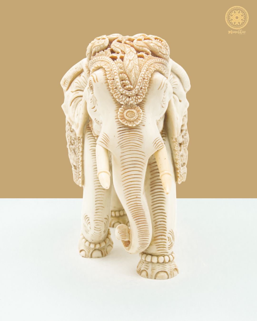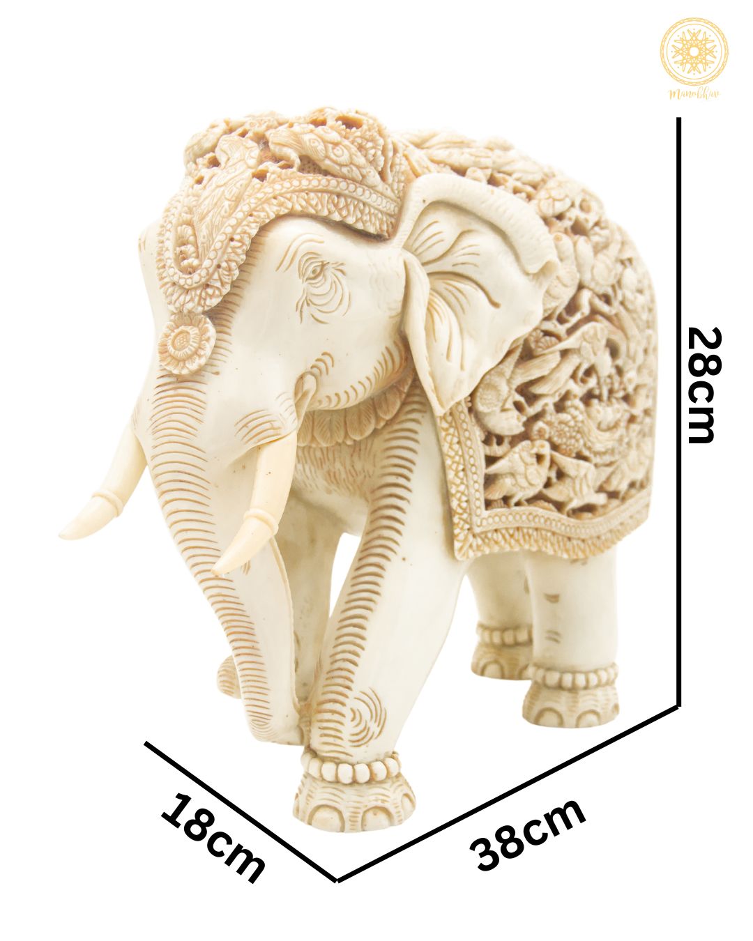 Diese Elefantenstatue aus Kunstharz stellt eine wunderschöne Kombination aus traditioneller indischer Kunst und zeitgenössischem Stil dar und ist ideal für alle, die ihren modernen Wohnräumen einen Hauch von kulturellem Erbe verleihen möchten. Sie ist aufwendig handgeschnitzt, um sicherzustellen, dass sie der Inneneinrichtung Eleganz und Authentizität verleiht. Ob für das Wohnzimmer, das Arbeitszimmer oder sogar als Geschenk.