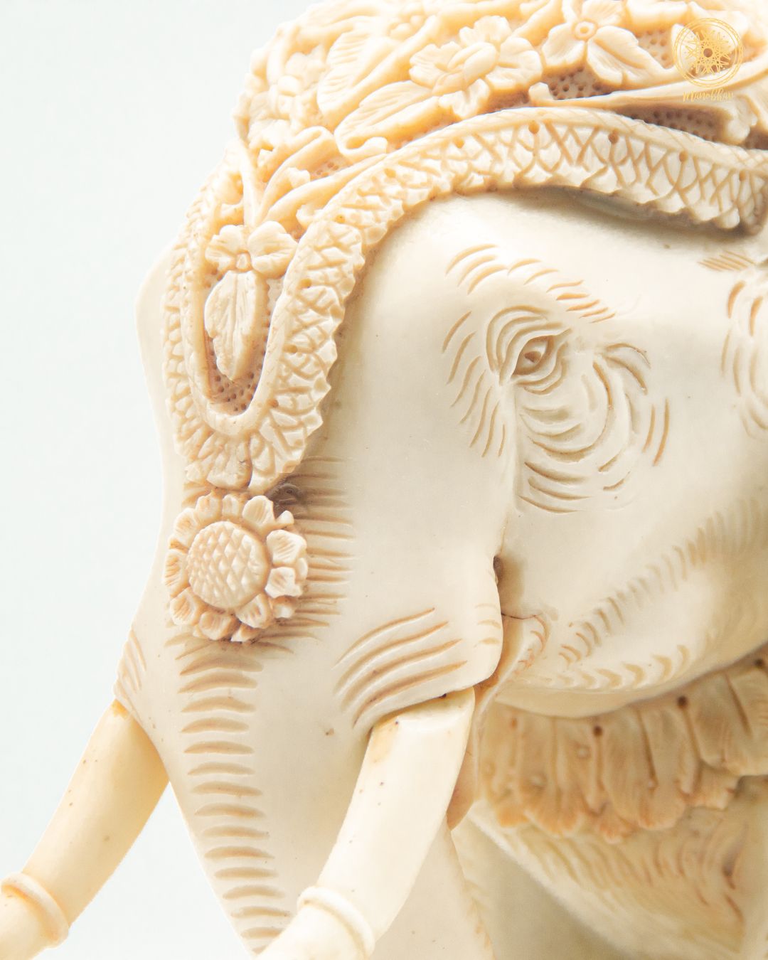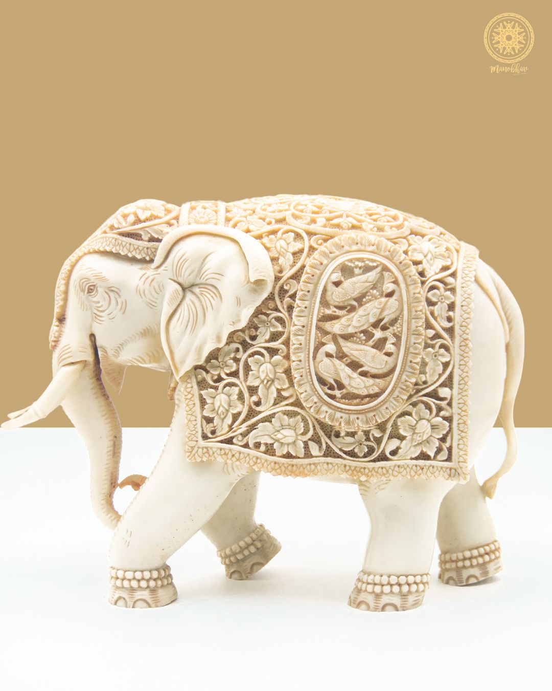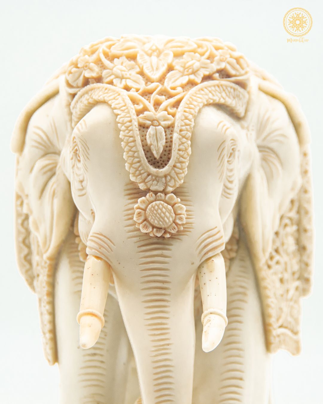 Die Elefantenstatue zeigt aufwendige Schnitzereien von Pfauen und Blumen in einem sehr alten Stil, der dem kulturellen und antiken Design entspricht. Obwohl es aus Harz besteht, sieht dieses wunderschöne Meisterwerk genau wie Elfenbein aus.