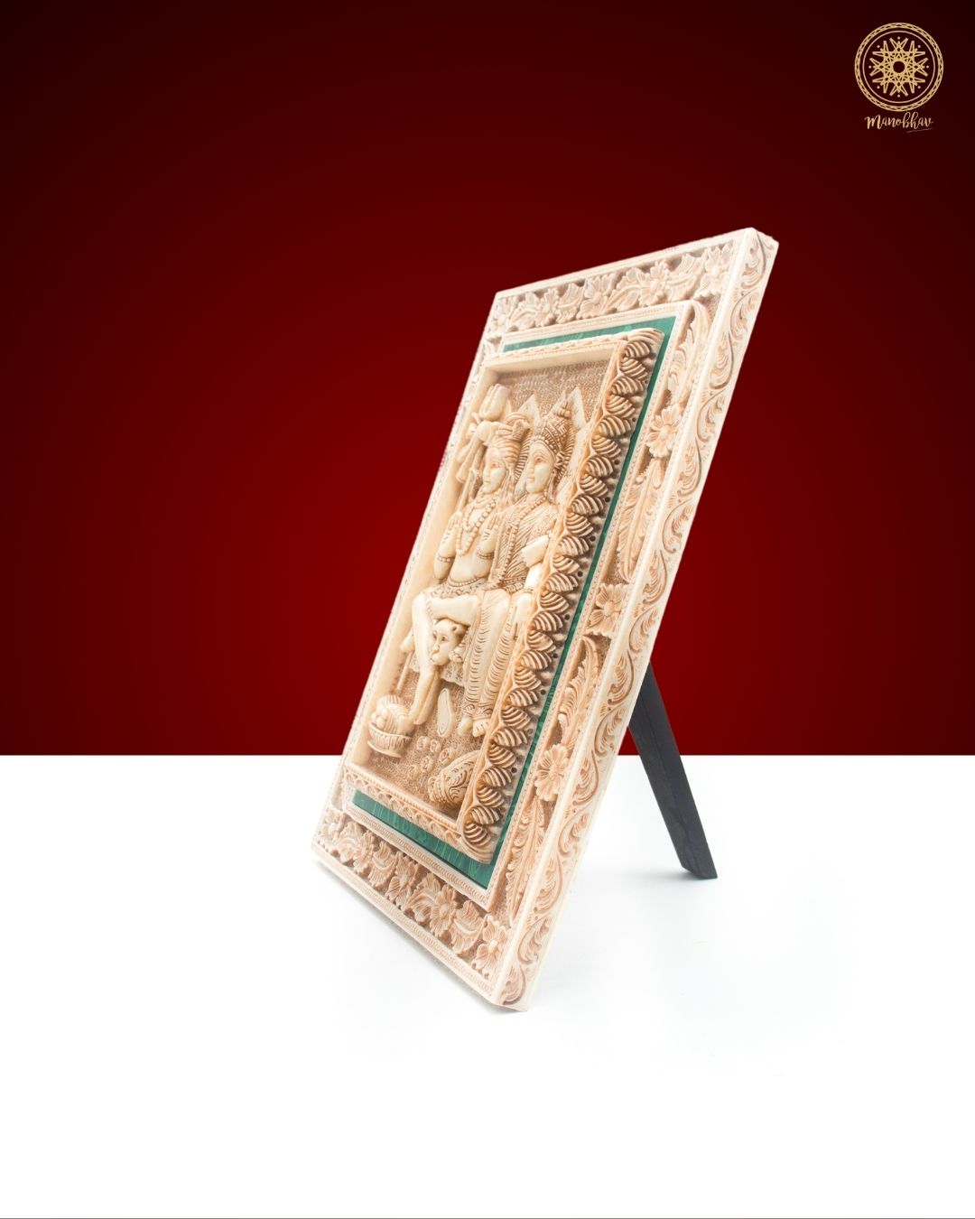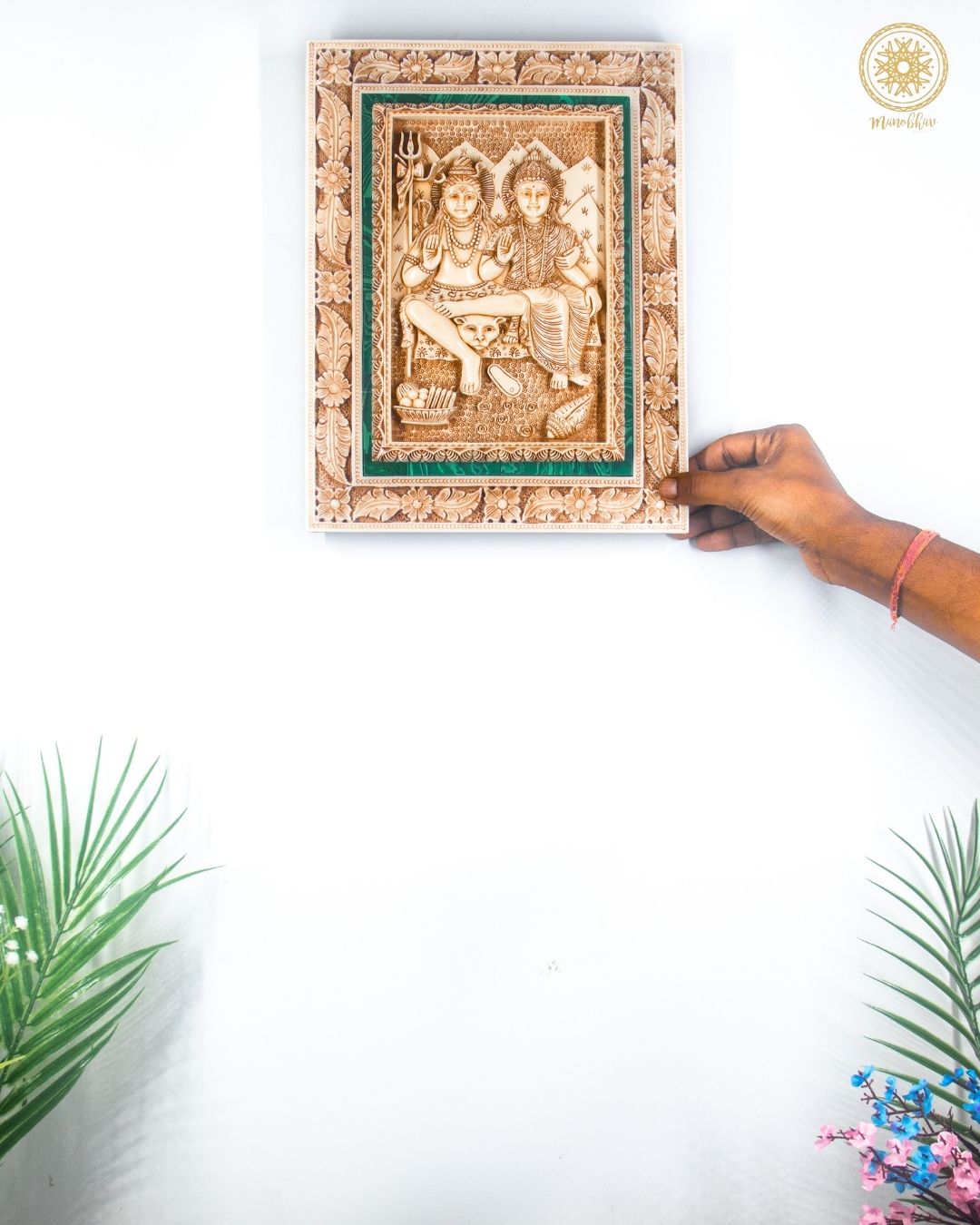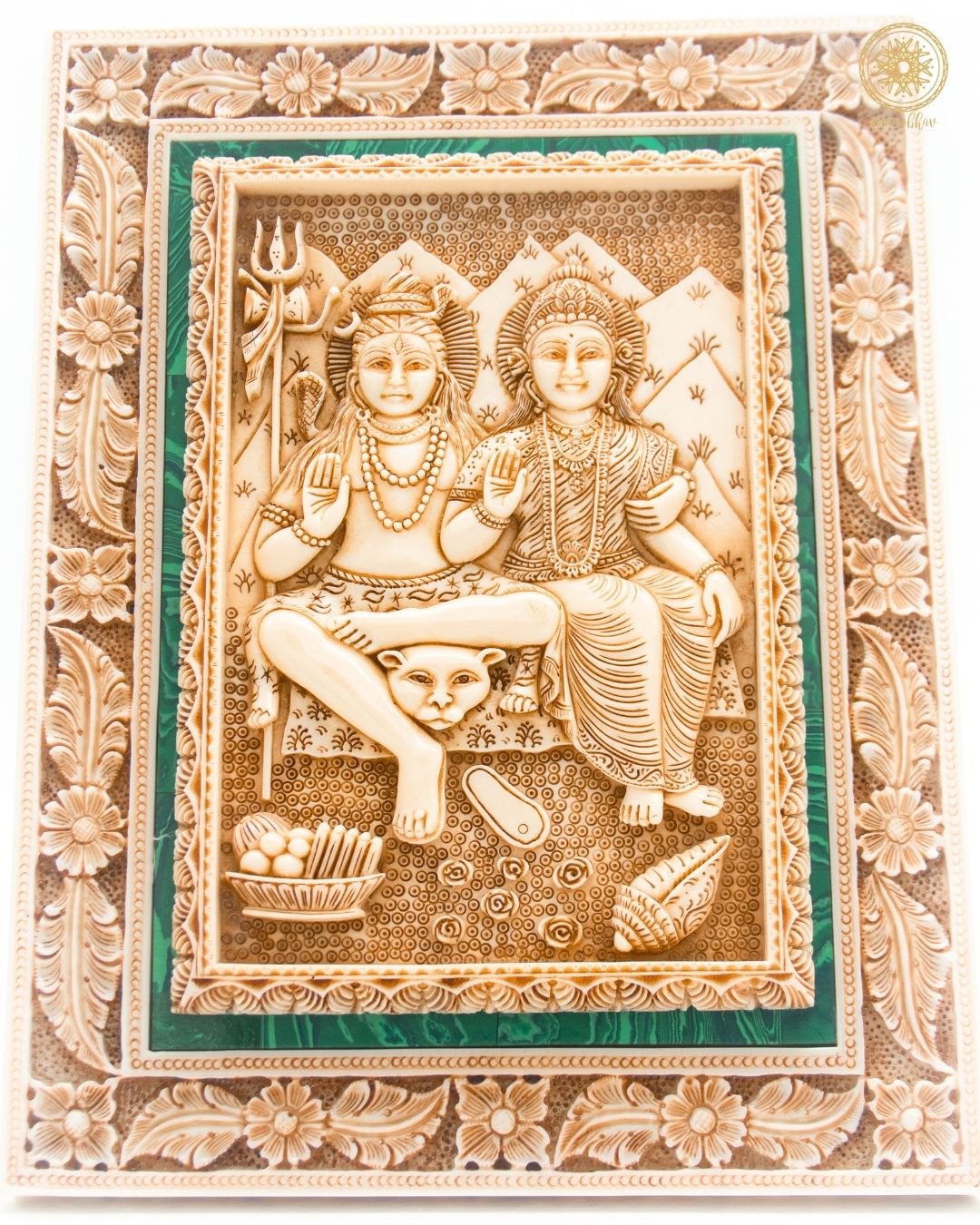 Dieses wunderschön handgefertigte Wandbehang verleiht Ihrem Zuhause oder Büro eine heilige Note. Der wunderschöne Malachitrahmen verleiht diesem göttlichen Paar, Shiva und Parvati, Luxus. Ihre ewige Verbindung symbolisiert Liebe, Harmonie und Kraft und macht ihn damit zum perfekten Stück für jeden Andachtsraum. Ob es Ihre Shiva-Parvati-Heimdekoration oder Ihre Galeriewandrahmen sein sollen, dieser handgefertigte Rahmen bringt Schönheit und verleiht Ihrer Einrichtung mit der spirituellen Bedeutung und Eleganz der Kunst ein Gefühl der Aufwertung. Dieser Wandbehang kann zu besonderen Anlässen verschenkt werden und wird in jeder Umgebung ein Gefühl ewigen Friedens und Positivität erzeugen.