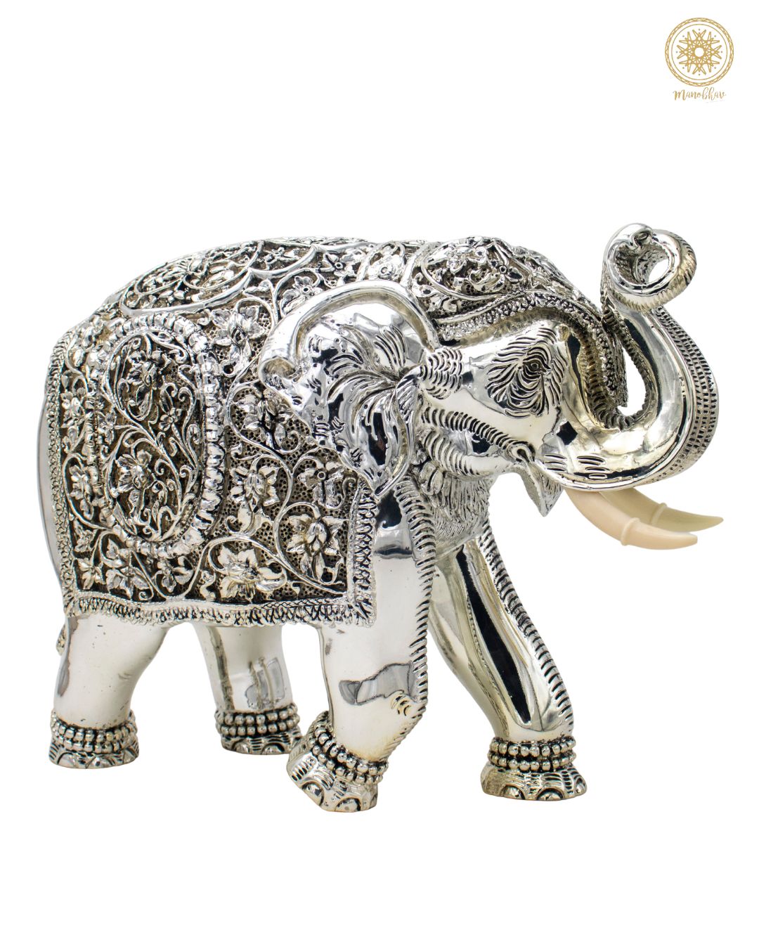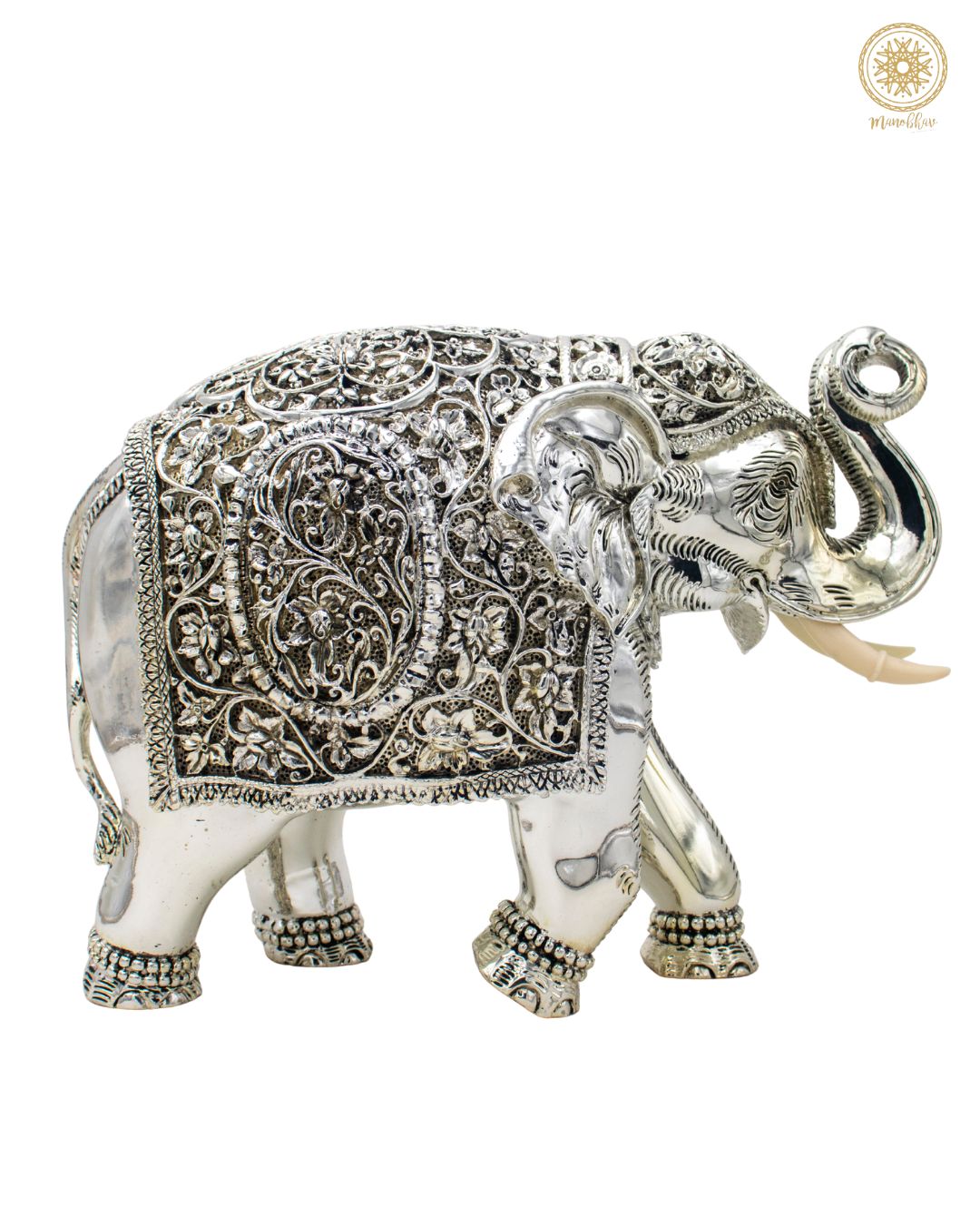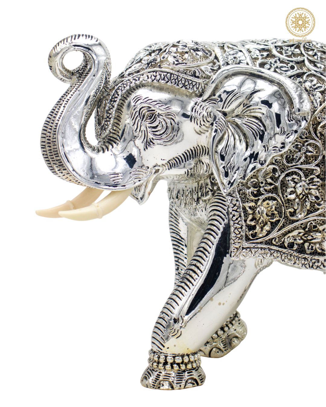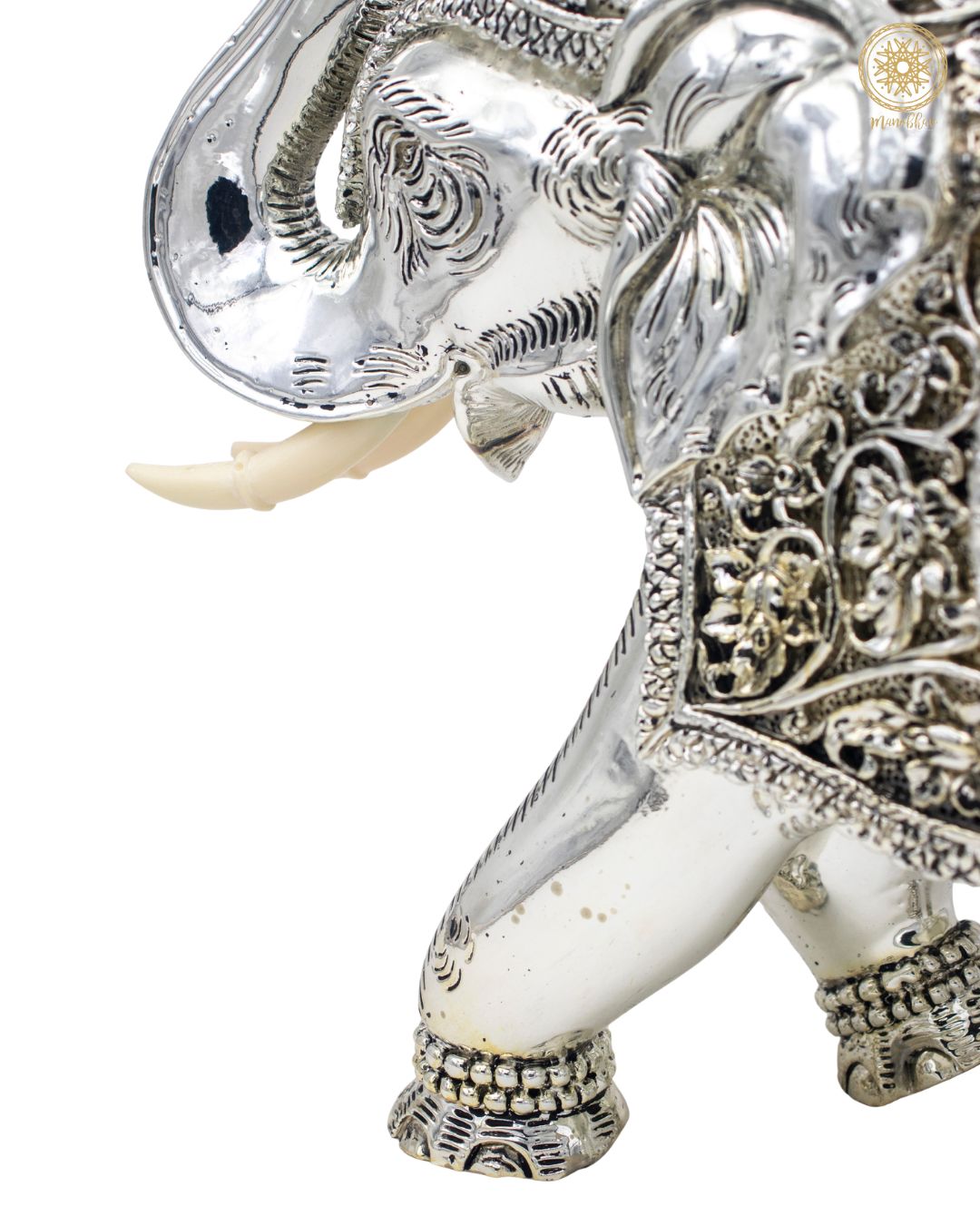 Dieses wunderschöne Elefanten-Dekostück ist handgefertigt und mit glänzender Versilberung überzogen. Hübsche Blumenmuster sind sorgfältig von Hand über den gesamten Körper geschnitzt, was ihm ein sehr besonderes und detailreiches Aussehen verleiht.