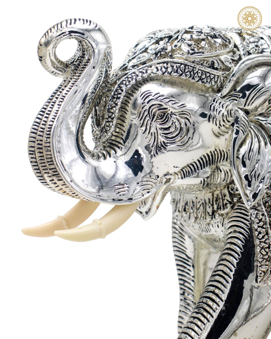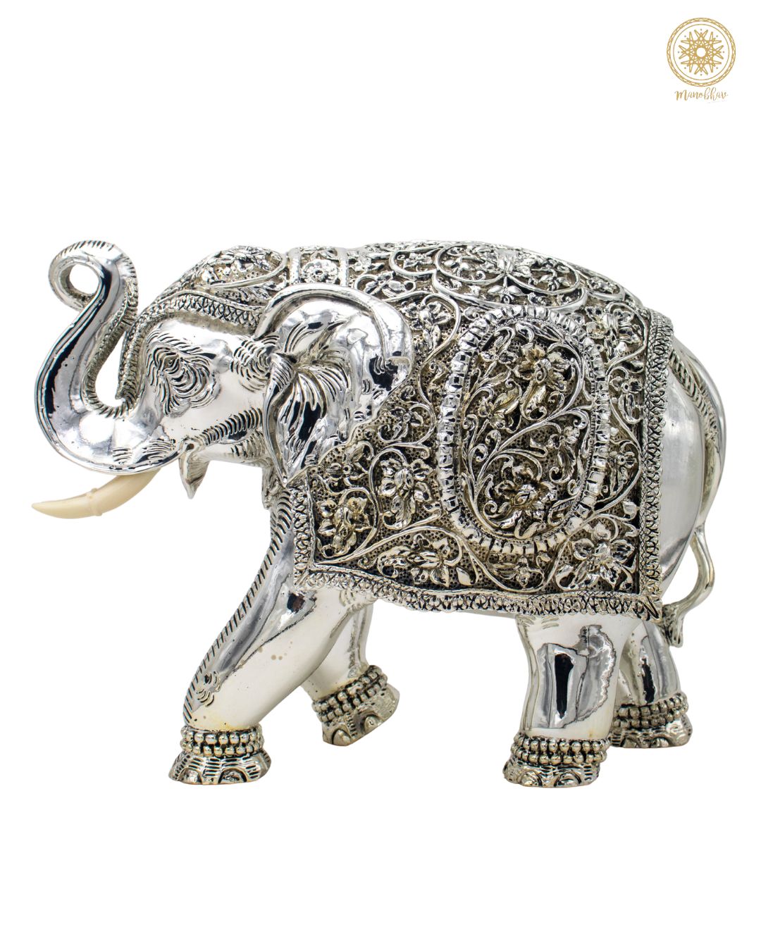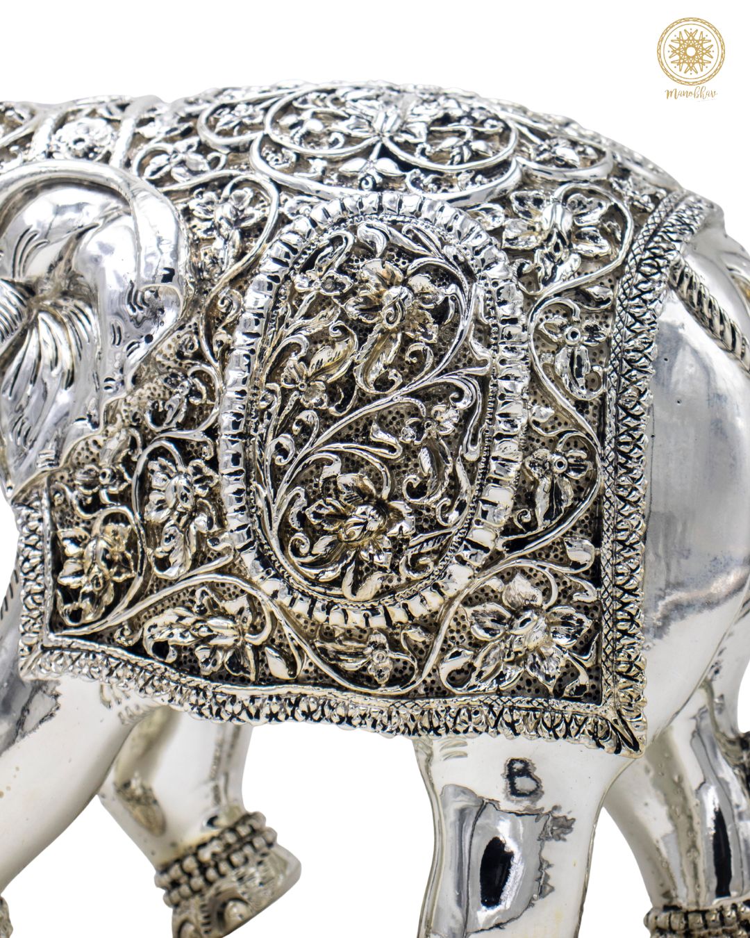 Dieses wunderschöne Elefanten-Dekostück ist handgefertigt und mit glänzender Versilberung überzogen. Hübsche Blumenmuster sind sorgfältig von Hand über den gesamten Körper geschnitzt, was ihm ein sehr besonderes und detailreiches Aussehen verleiht.