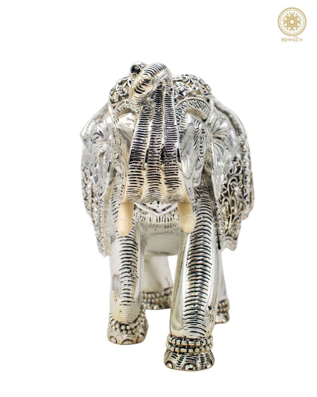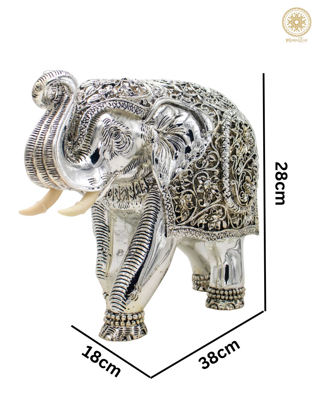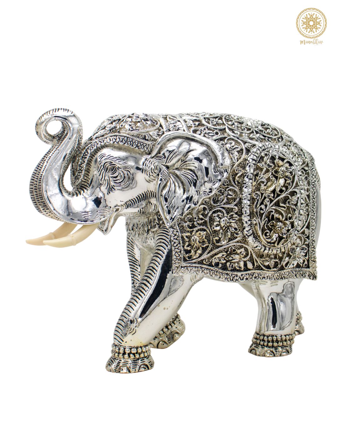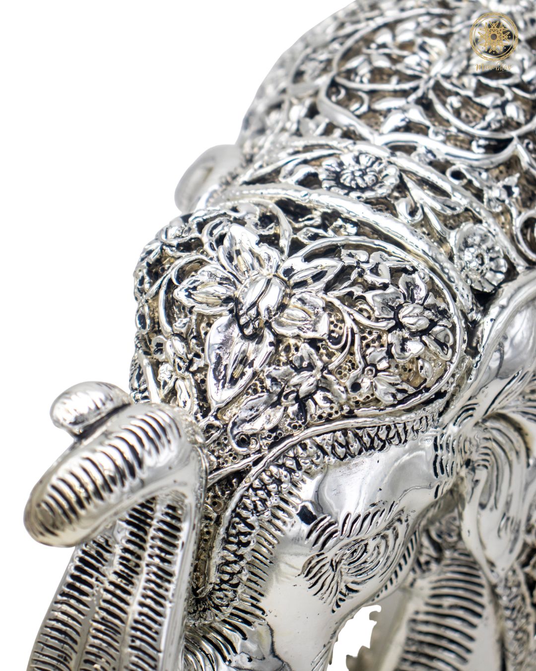Dieses wunderschöne Elefanten-Dekostück ist handgefertigt und mit glänzender Versilberung überzogen. Hübsche Blumenmuster sind sorgfältig von Hand über den gesamten Körper geschnitzt, was ihm ein sehr besonderes und detailreiches Aussehen verleiht.
