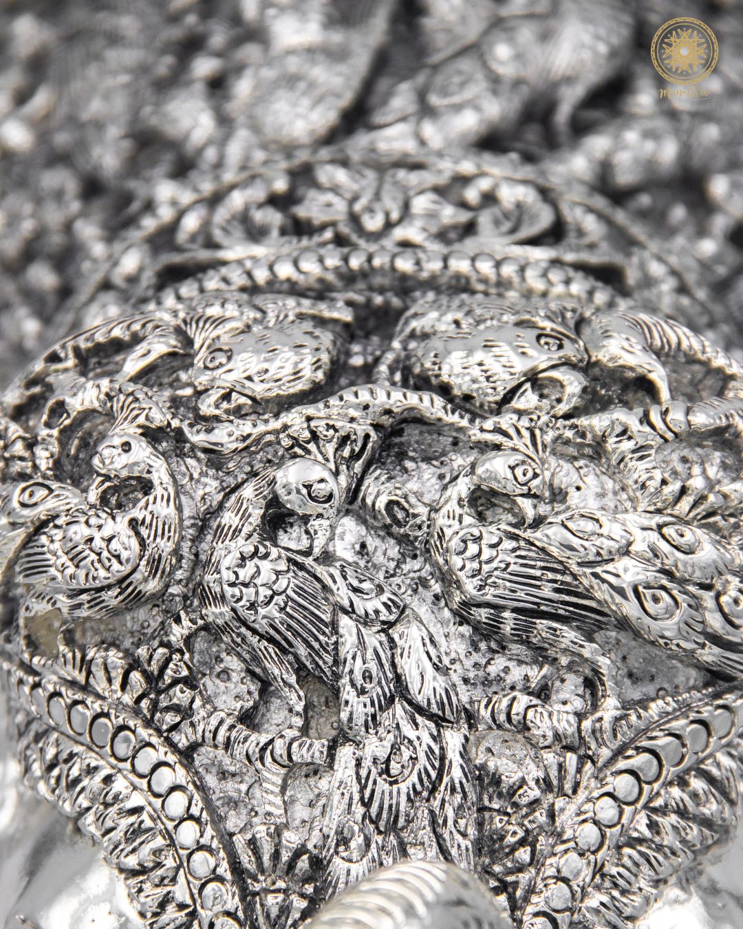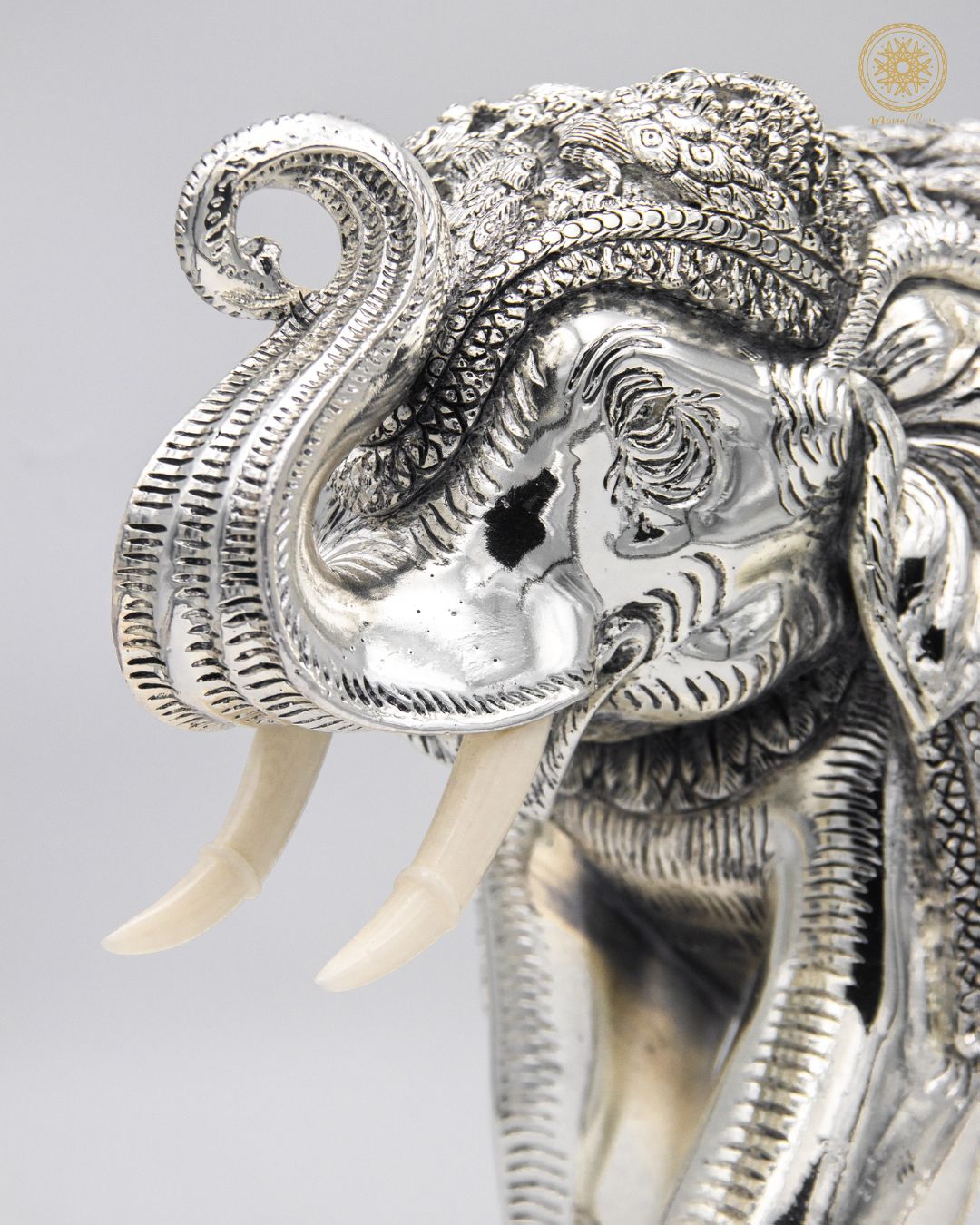 Diese klassische versilberte Elefantenfigur im Vintage-Stil stellt die perfekte Kombination aus traditioneller Kunst und modernem Stil dar. Der Elefant ist handgefertigt und gestaltet und mit allen möglichen künstlerischen Formen verziert, was das Produkt ideal für Liebhaber antiker Wohndekoration macht. Die exquisiten, detaillierten Versilberungsarbeiten an der silbernen Elefantenfigur tragen zu ihrer Üppigkeit bei, sodass sie kaum zu übersehen ist und in fast jedem Teil des Hauses gut aussieht. Ob als Ausstellungsstück oder als silbernes Dekorationsstück für den Tisch, sie bringt Schönheit und Stil mit sich. Die Elefanten repräsentieren ewige Weisheit und Stärke, daher ist diese Figur perfekt für jemanden, der bedeutungsvolle Deko-Geschenkideen braucht. Sie ist ideal als Einweihungsgeschenk, kann aber auch als seltenes Antiquitätengeschenk zu jedem Anlass überreicht werden.