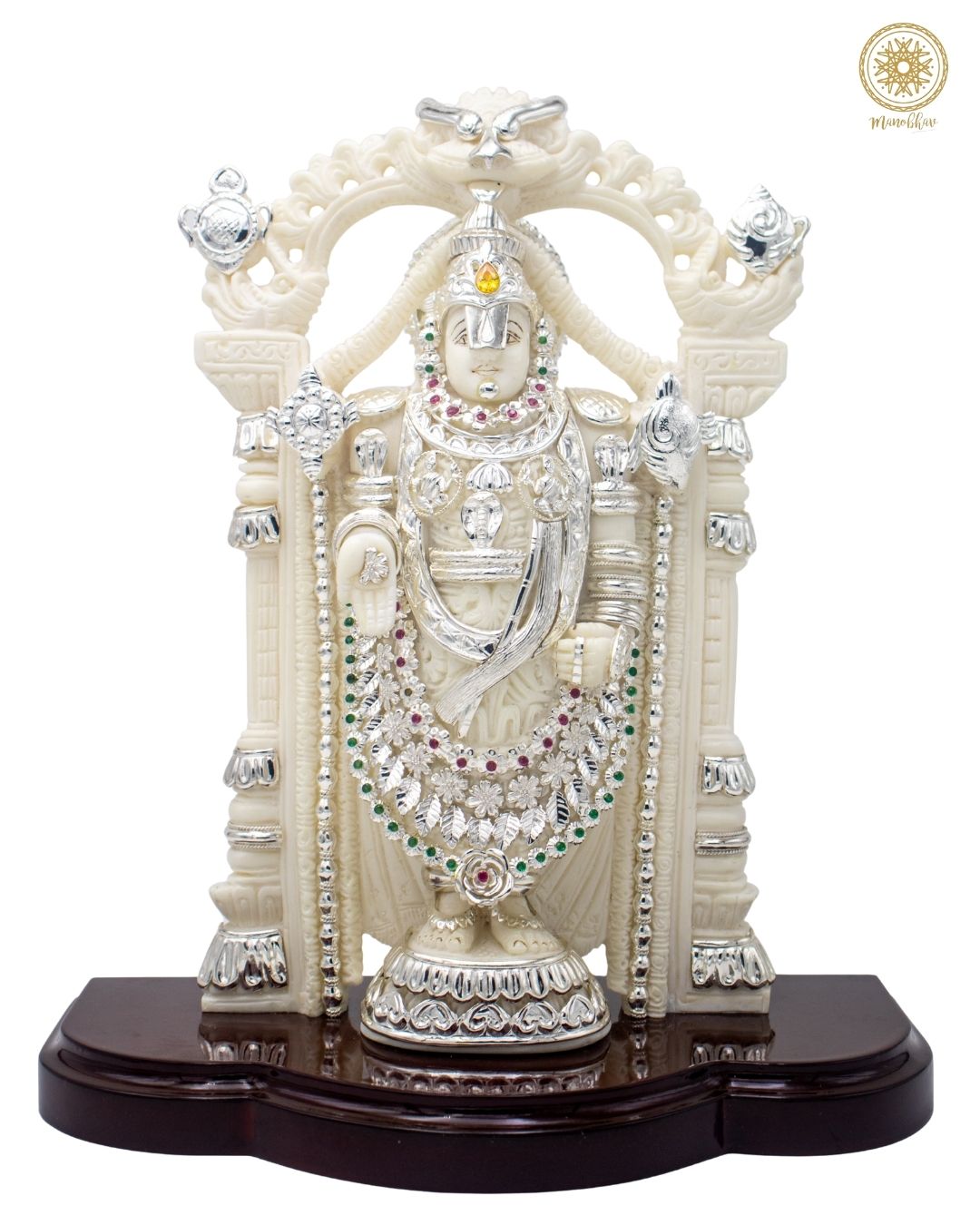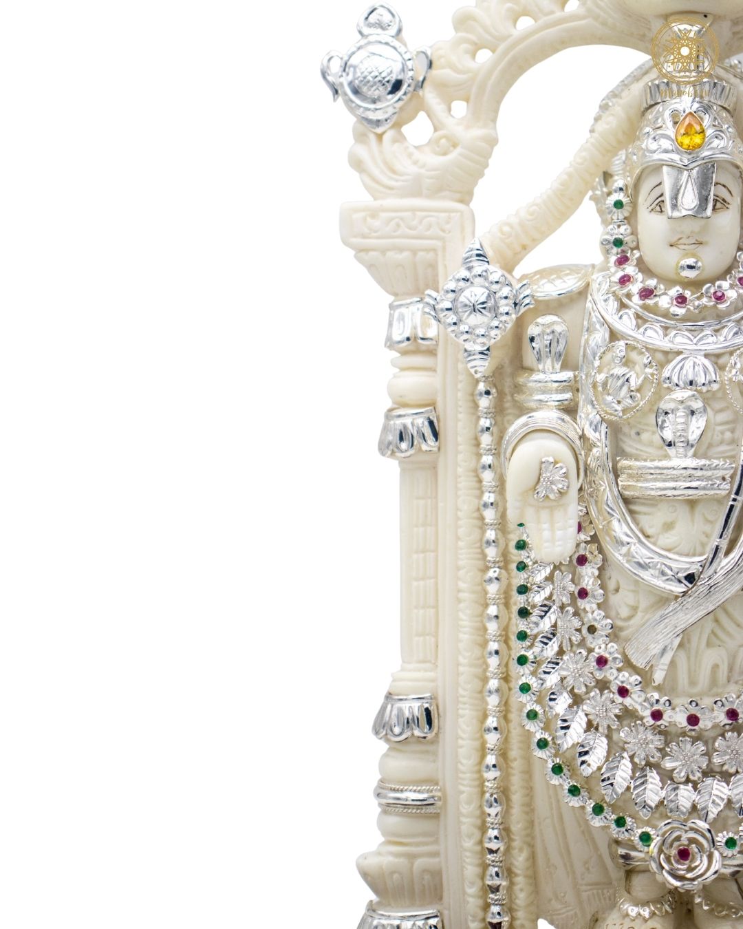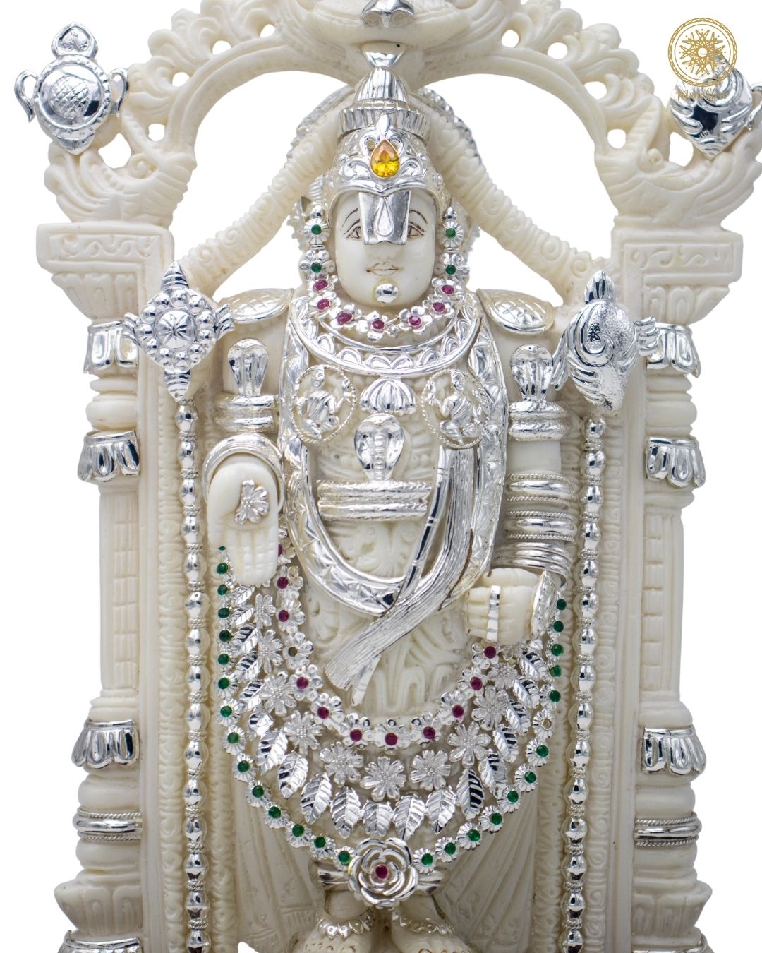 This handcrafted idol of Lord Venkateswara, also known as Balaji, is made from marble dust and decorated with silver-plated jewelry and colorful stones. The idol looks majestic, just like the one worshipped at the famous Tirupati temple. Lord Venkateswara is known as the preserver of wealth, peace, and happiness in life.