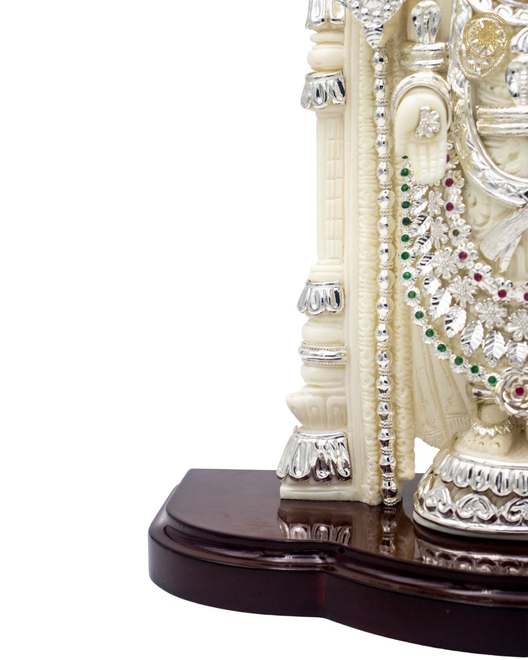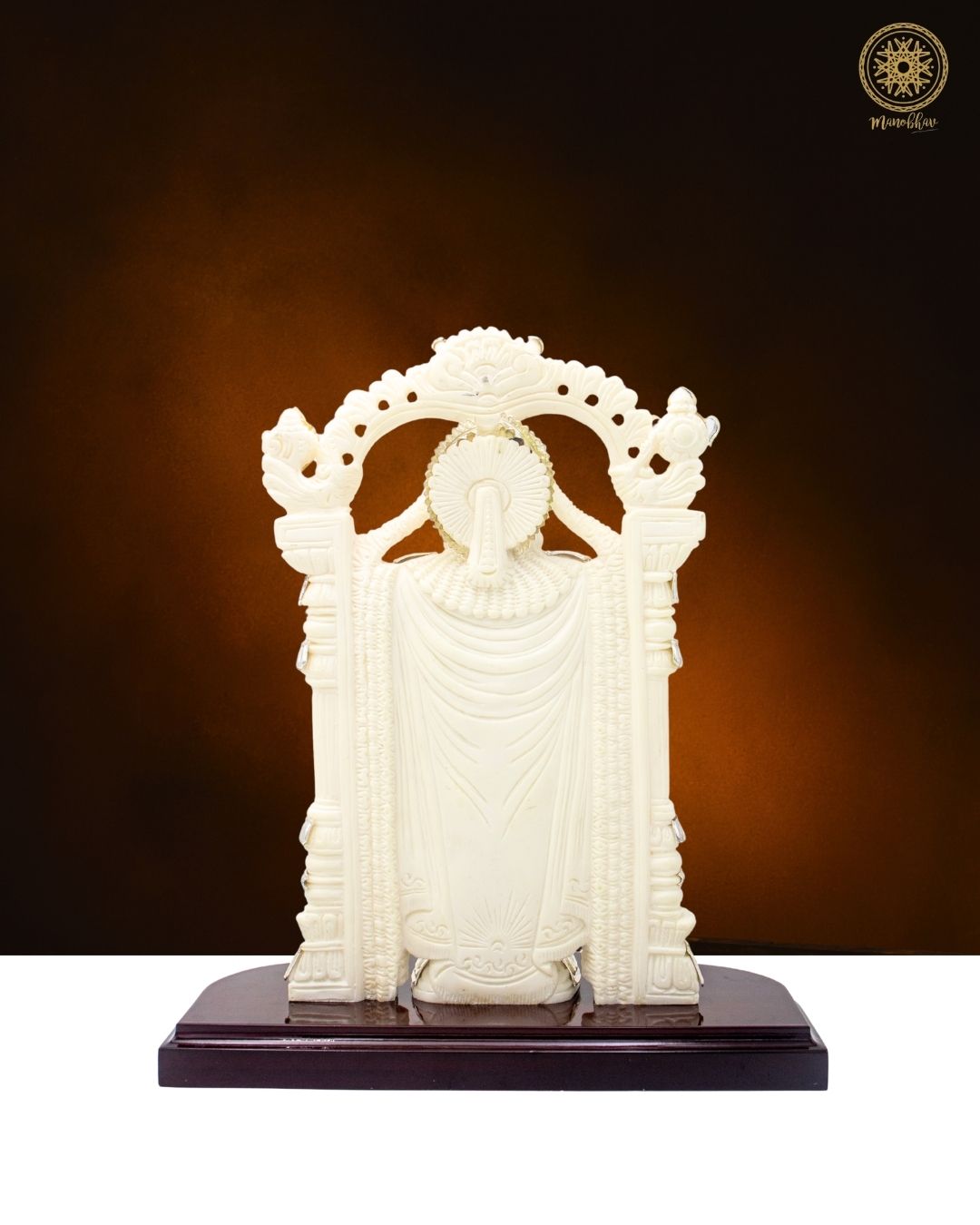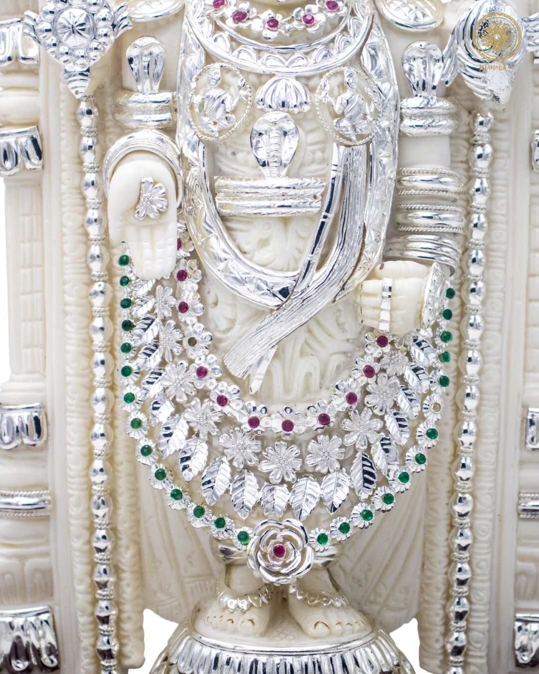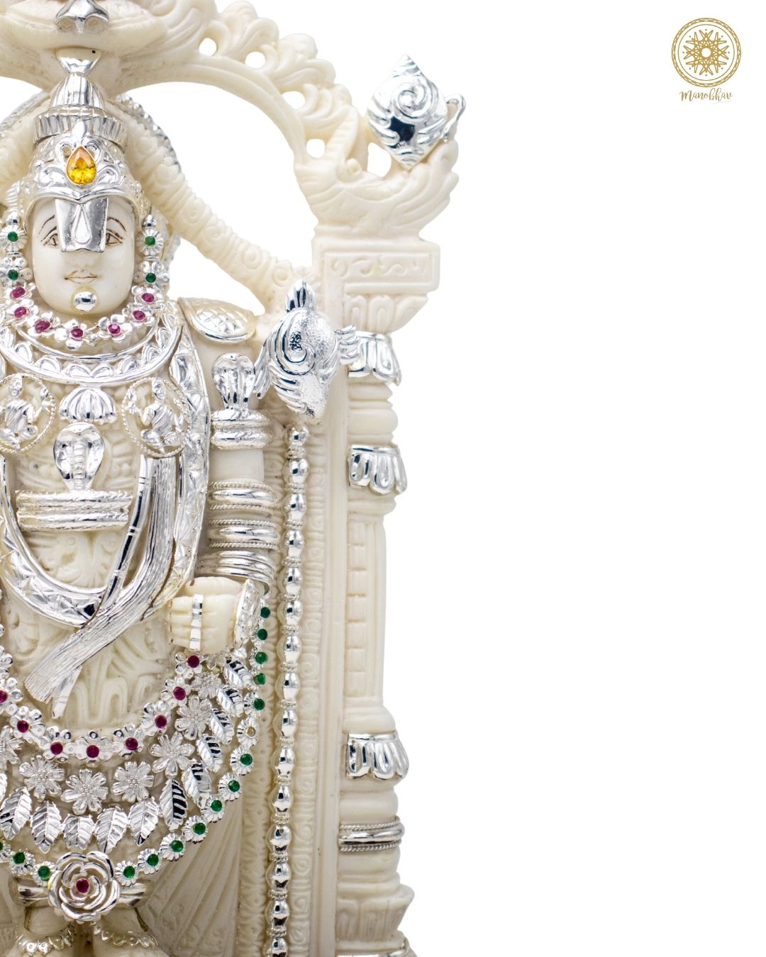 This handcrafted idol of Lord Venkateswara, also known as Balaji, is made from marble dust and decorated with silver-plated jewelry and colorful stones. The idol looks majestic, just like the one worshipped at the famous Tirupati temple. Lord Venkateswara is known as the preserver of wealth, peace, and happiness in life.