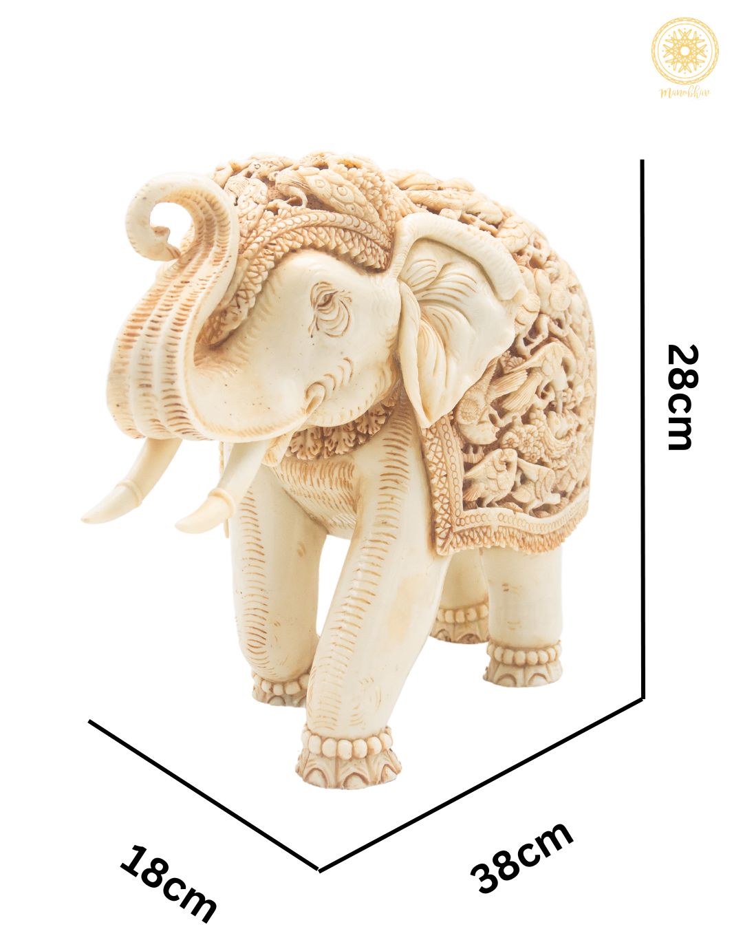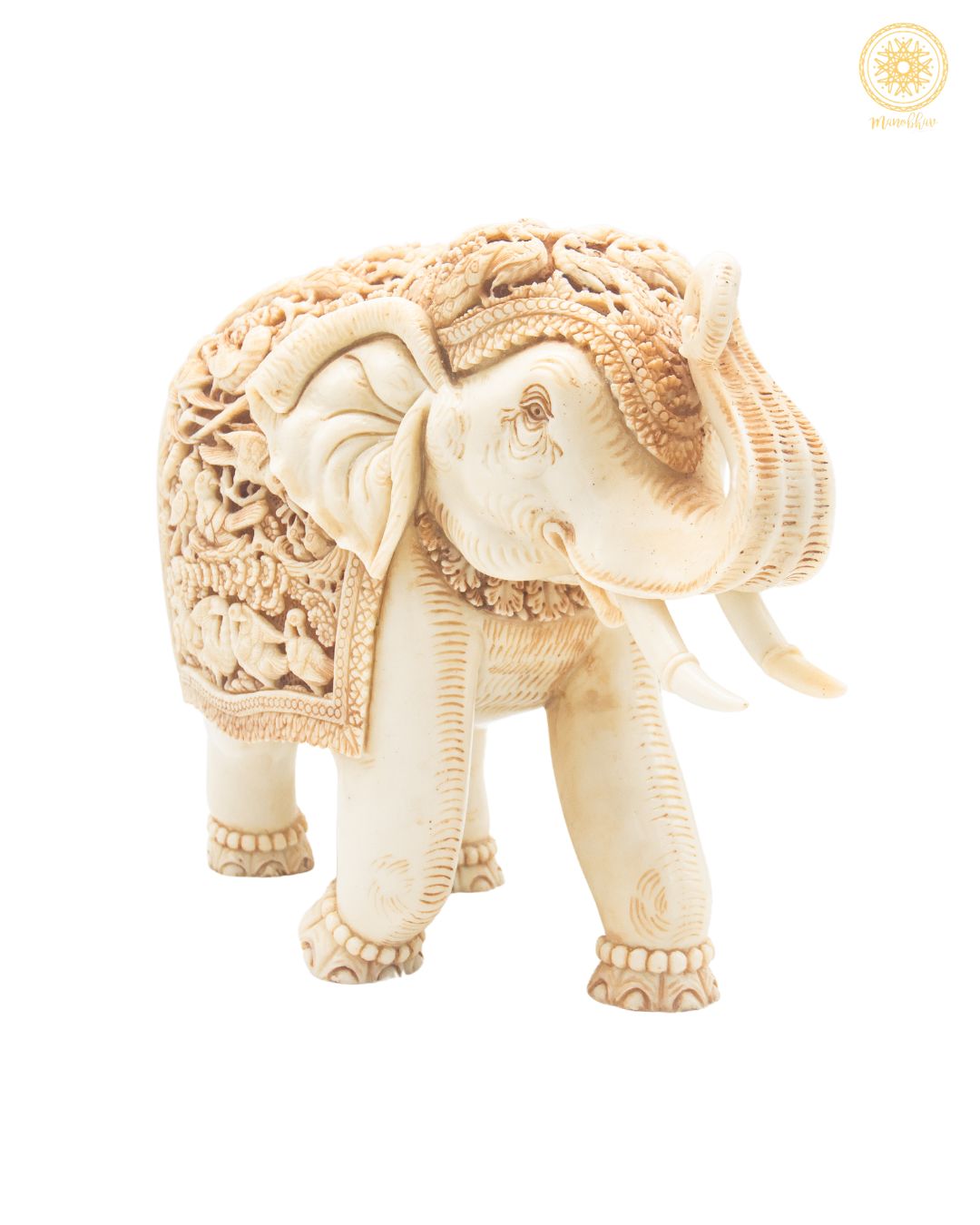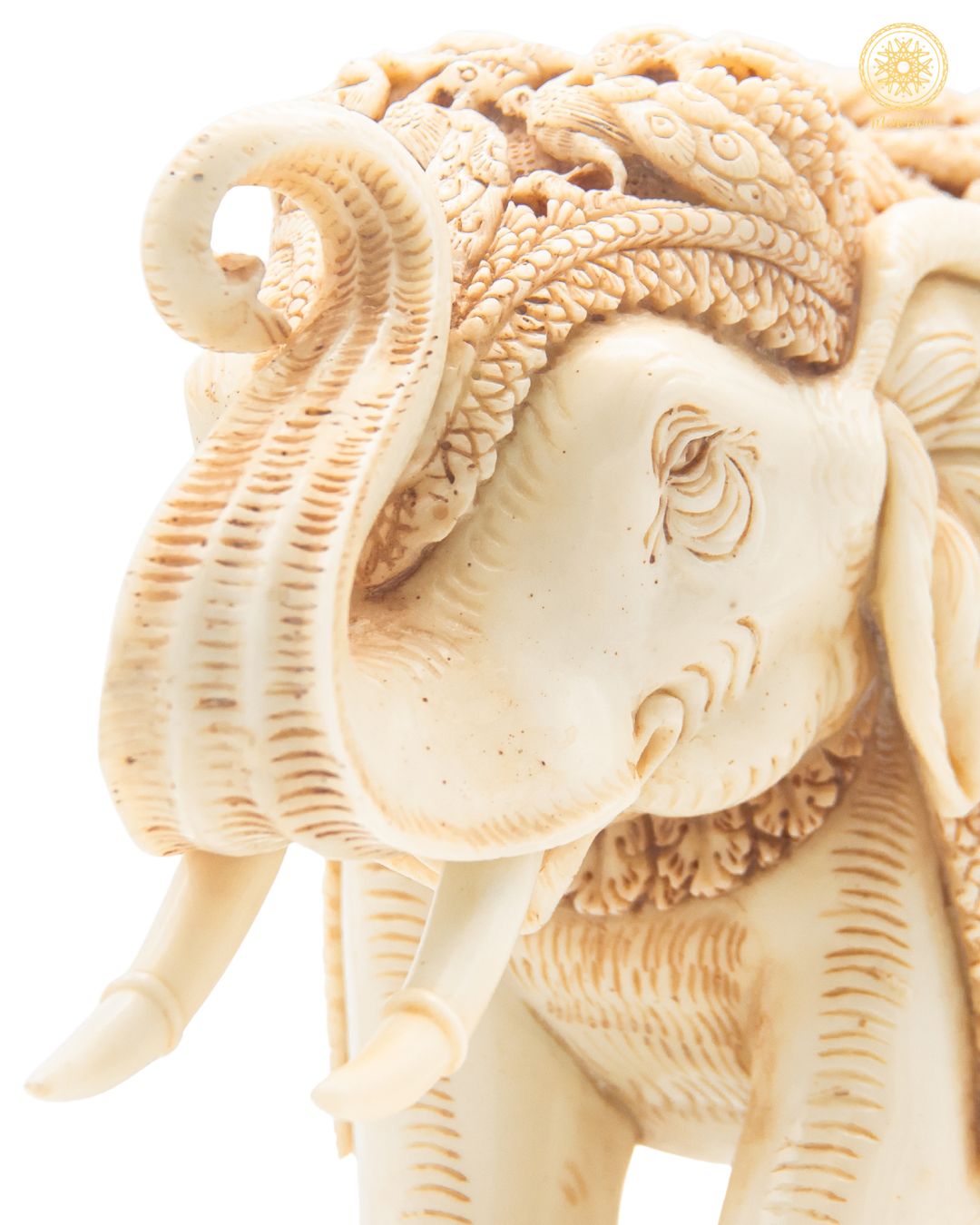 This intricately carved ivory statue of an elephant stands the test of time in artistry and craftsmanship pertaining to India, from delicate carvings to a structured posture. Every detail has been intricately hand-carved from high-quality resin into this imposing creature.