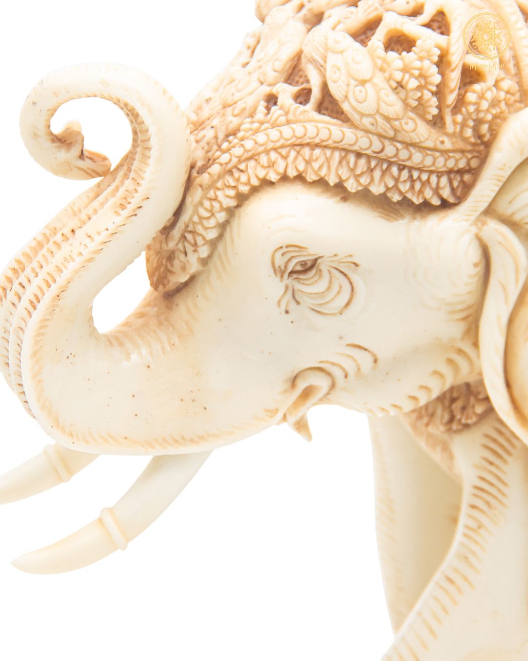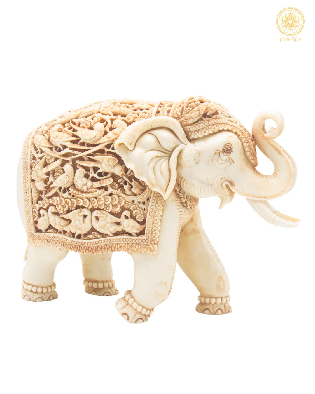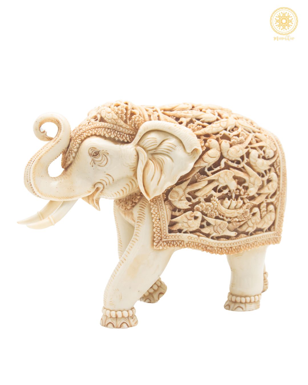 This intricately carved ivory statue of an elephant stands the test of time in artistry and craftsmanship pertaining to India, from delicate carvings to a structured posture. Every detail has been intricately hand-carved from high-quality resin into this imposing creature.