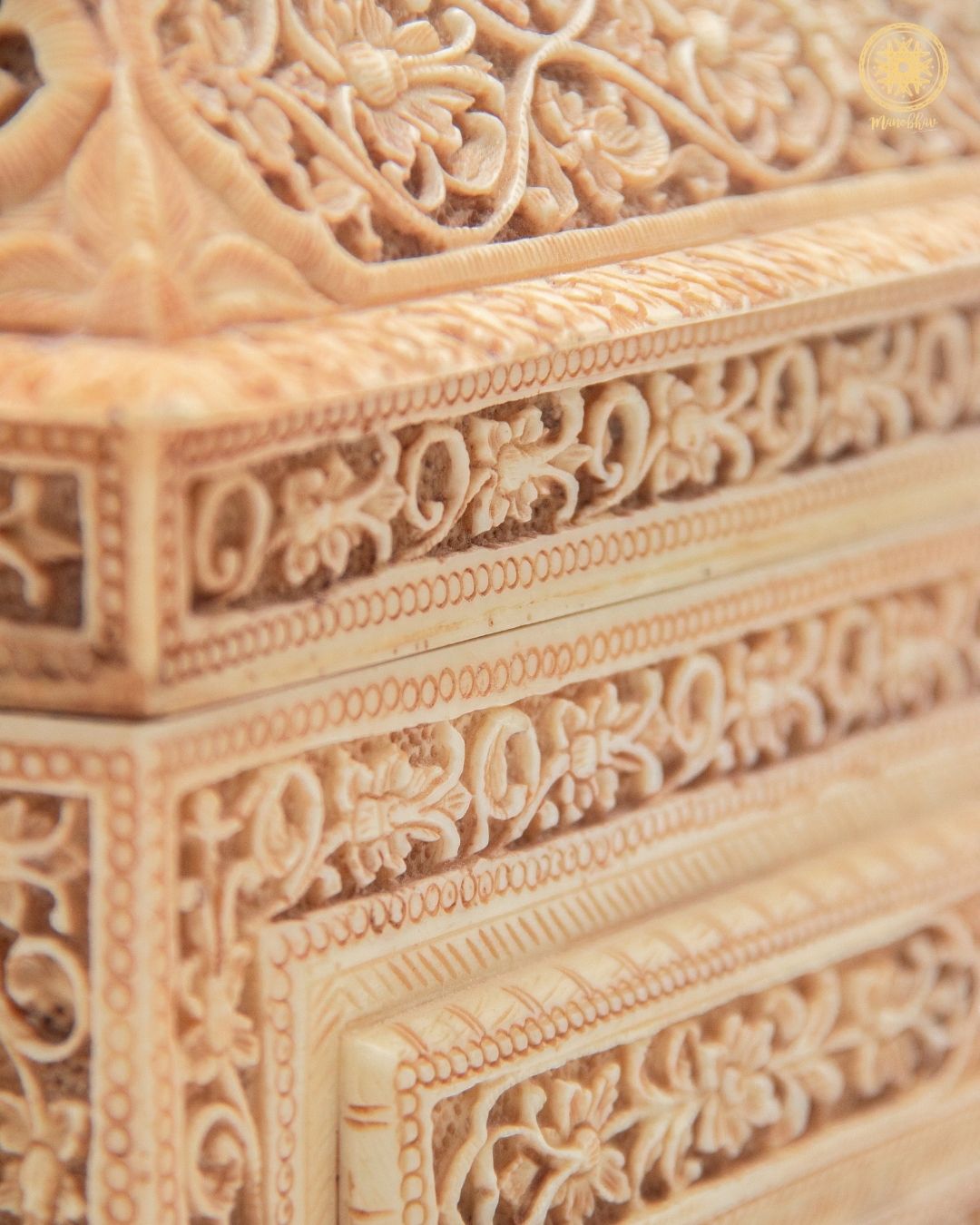 This Organizer box is crafted from high-quality resin, this vintage-inspired jewelry storage box represents the class of heirloom collectibles, offering a luxurious touch to your dressing table, vanity, or home decor. The delicate floral carvings, inspired by classic Mughal designs, increase its royal appeal, which makes it an ideal antique decor piece.