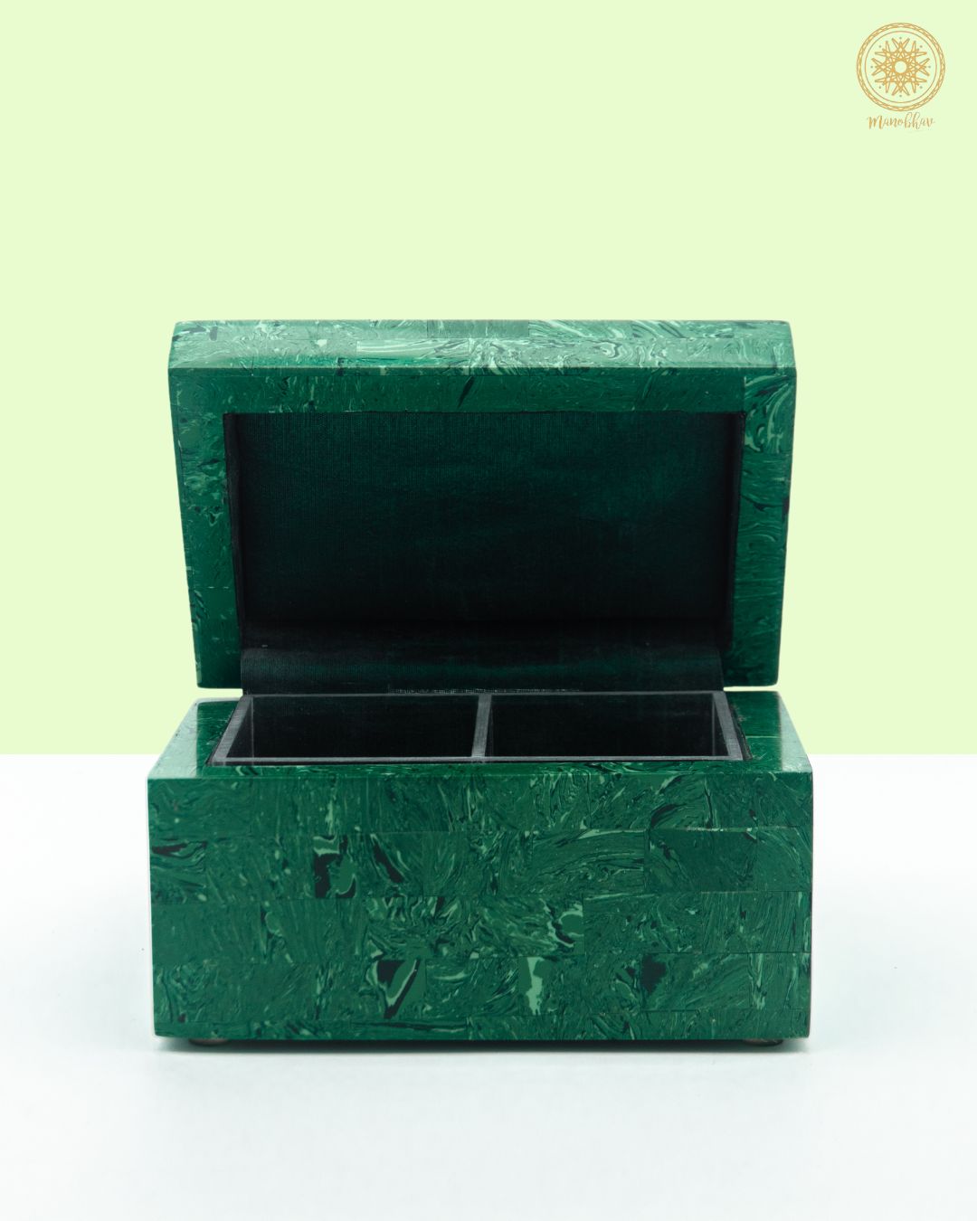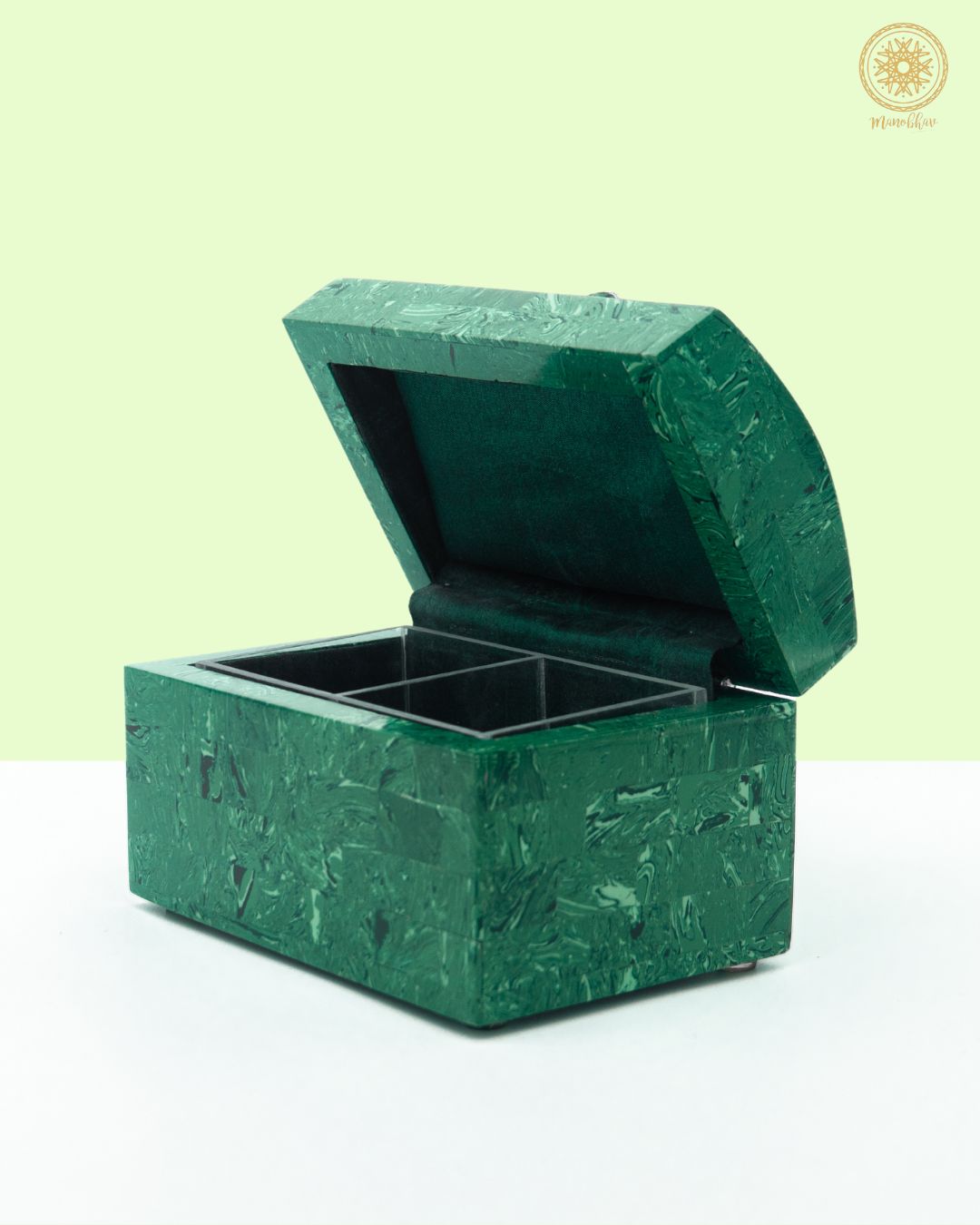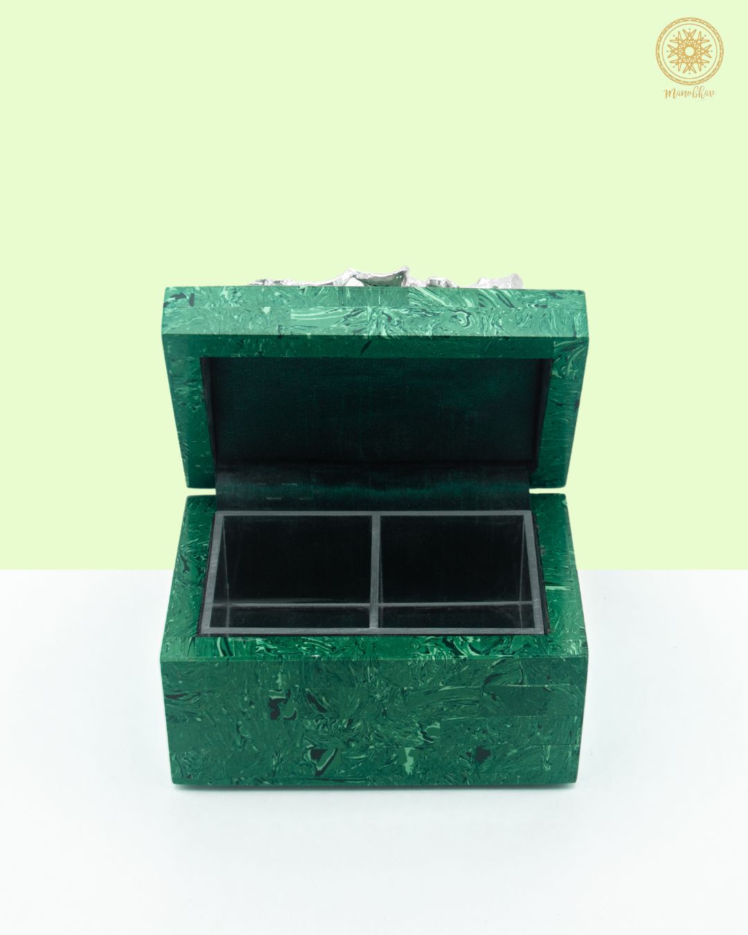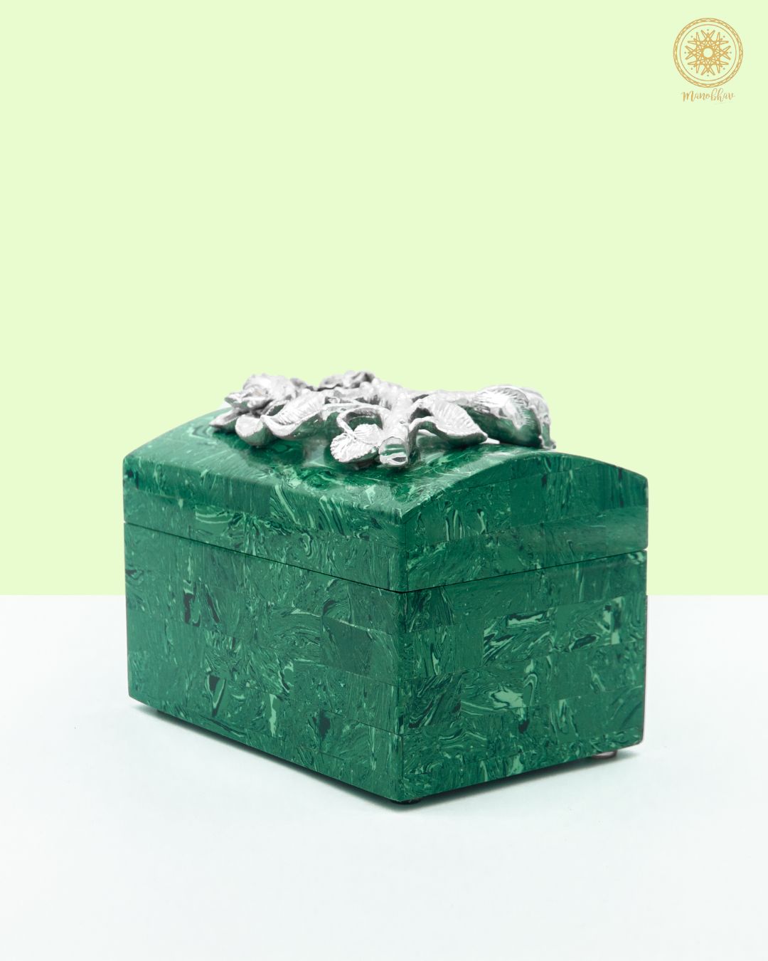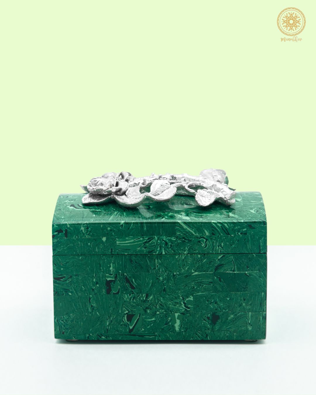 Explore our Malachite Jewelry Box, a piece where the deep green tones meet a handcrafted silver rose motif, offering not just storage but an art piece.