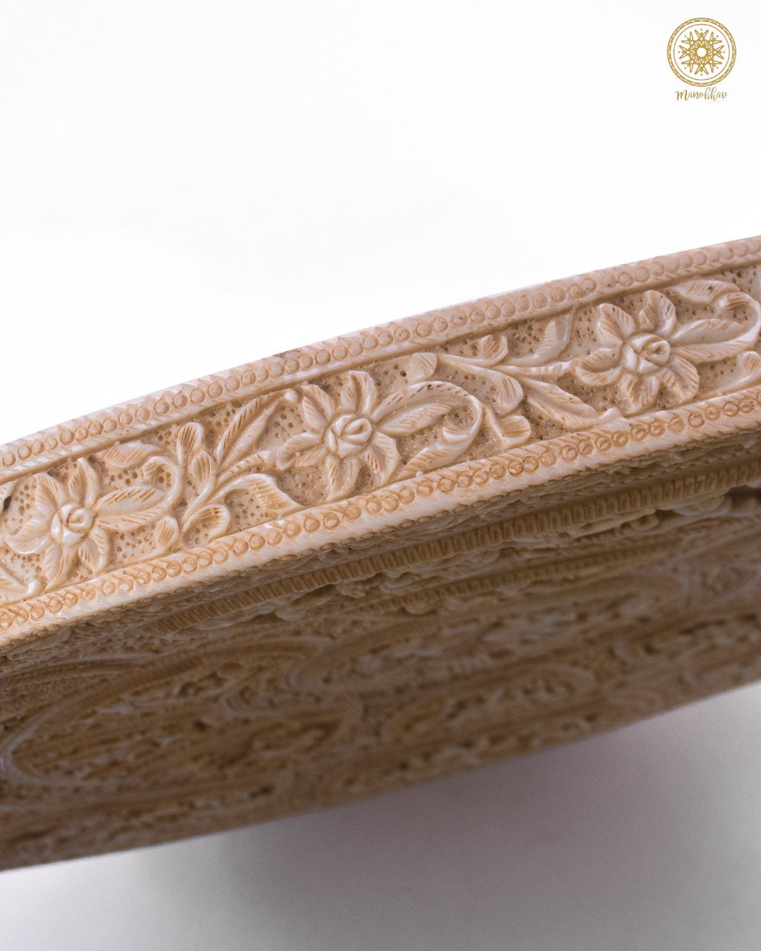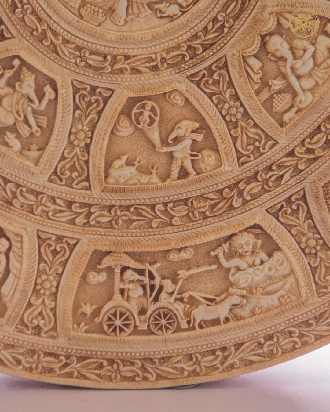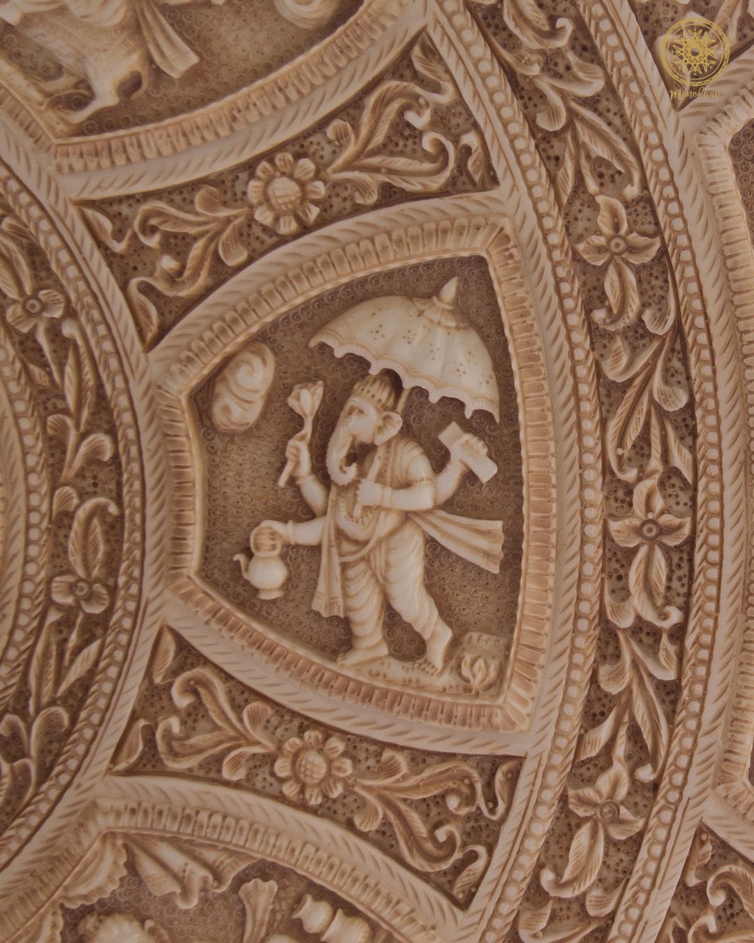 Des sculptures complexes faites à la main de différentes images décorent ses bords, fournissant des éléments importants à l'intérieur.