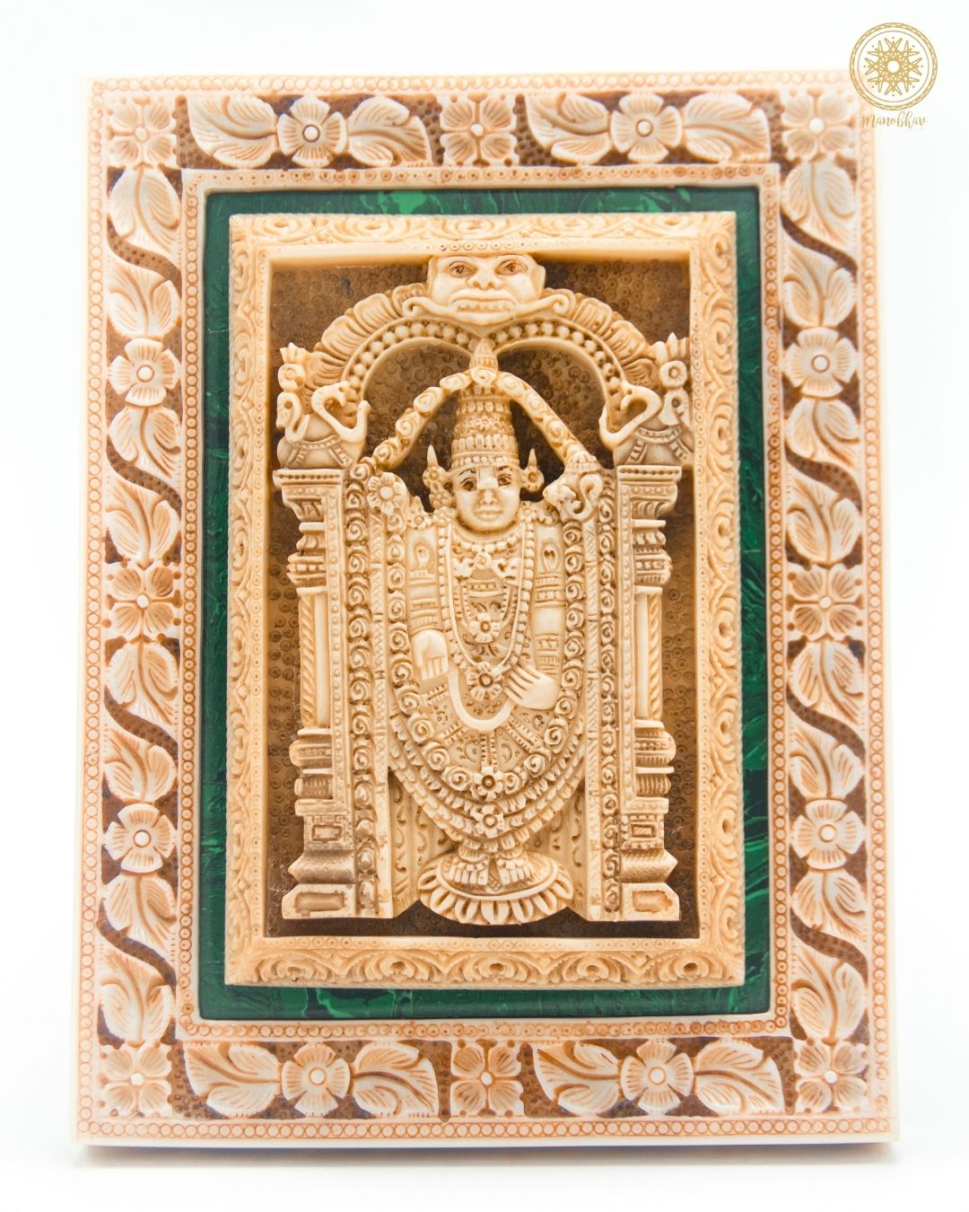 Ce cadre mural magnifiquement conçu Tirupati Balaji avec incrustation de malachite est la présence de la divinité qui illuminera n'importe quel endroit. Les belles sculptures et la finition riche capturent l'essence du Seigneur Balaji, apportant paix, protection et prospérité dans vos maisons. Tout en étant un bel ajout esthétique, il représente en même temps un symbole spirituel incroyablement puissant. Étant un objet de collection, c'est une beauté antique et en même temps, un investissement dans l'art et la spiritualité éternels. Cette tenture murale trouve le juste équilibre entre tradition et style en combinant la richesse unique du patrimoine indien avec un design moderne. C'est un cadeau qui devrait être offert à ses proches en toute occasion et précieusement conservé dans un foyer pour toujours.