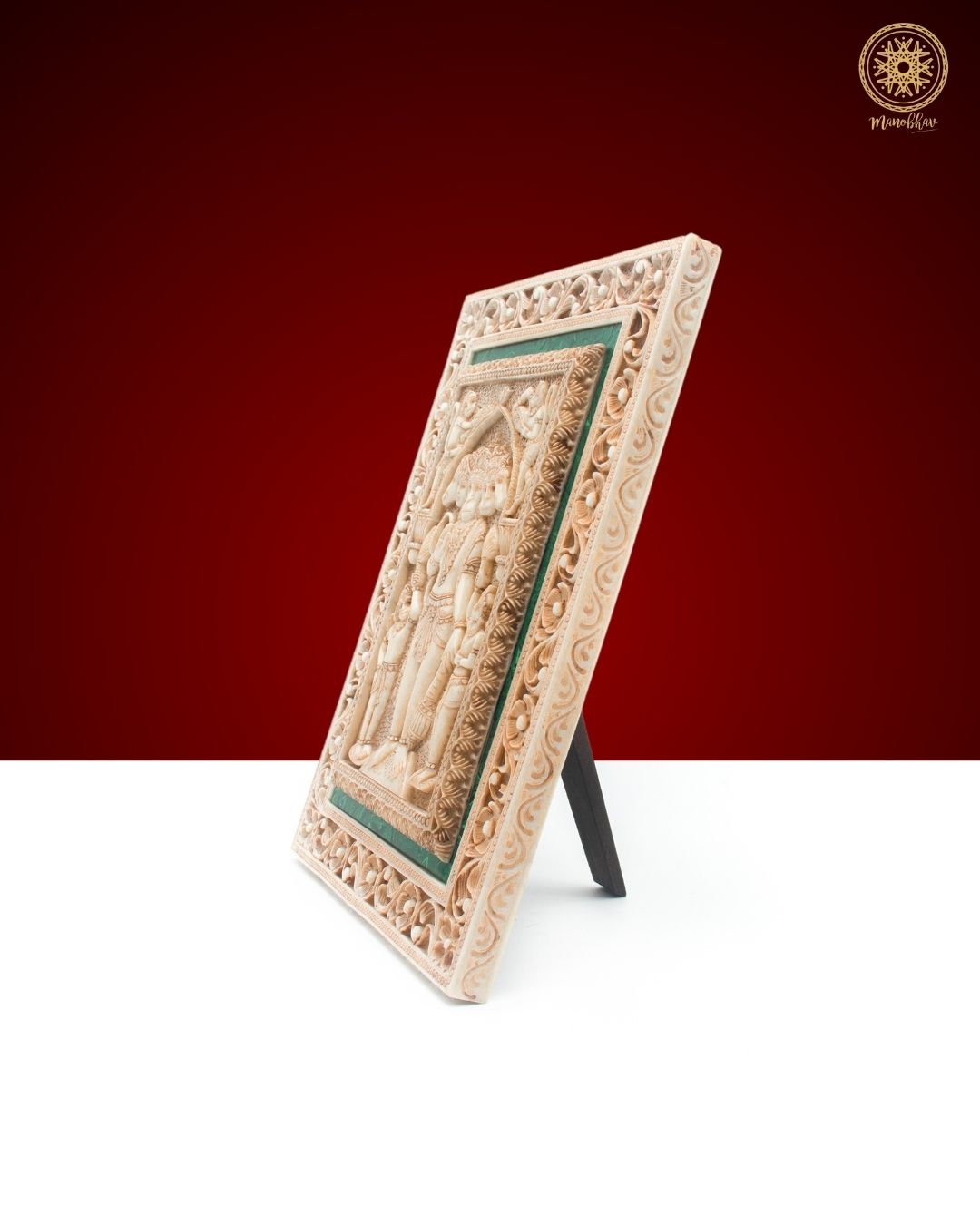 Ce magnifique cadre mural de Hanuman Ji avec incrustation de malachite est un art ainsi qu'une tapisserie divine qui embellira n'importe quel espace. Des sculptures complexes et une finition riche capturent l'essence du Seigneur Hanuman, le dieu singe, symbolisant la force, le courage et la dévotion. Cette pièce exquise est magnifiquement sculptée par des artisans qualifiés et talentueux, il faut des heures et même des jours pour la rendre parfaite.