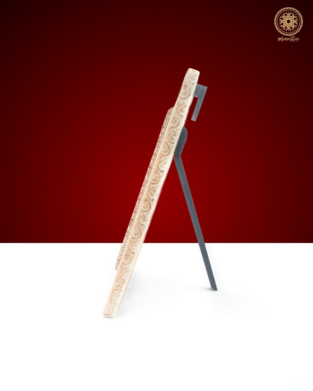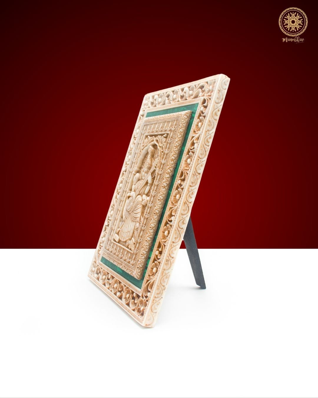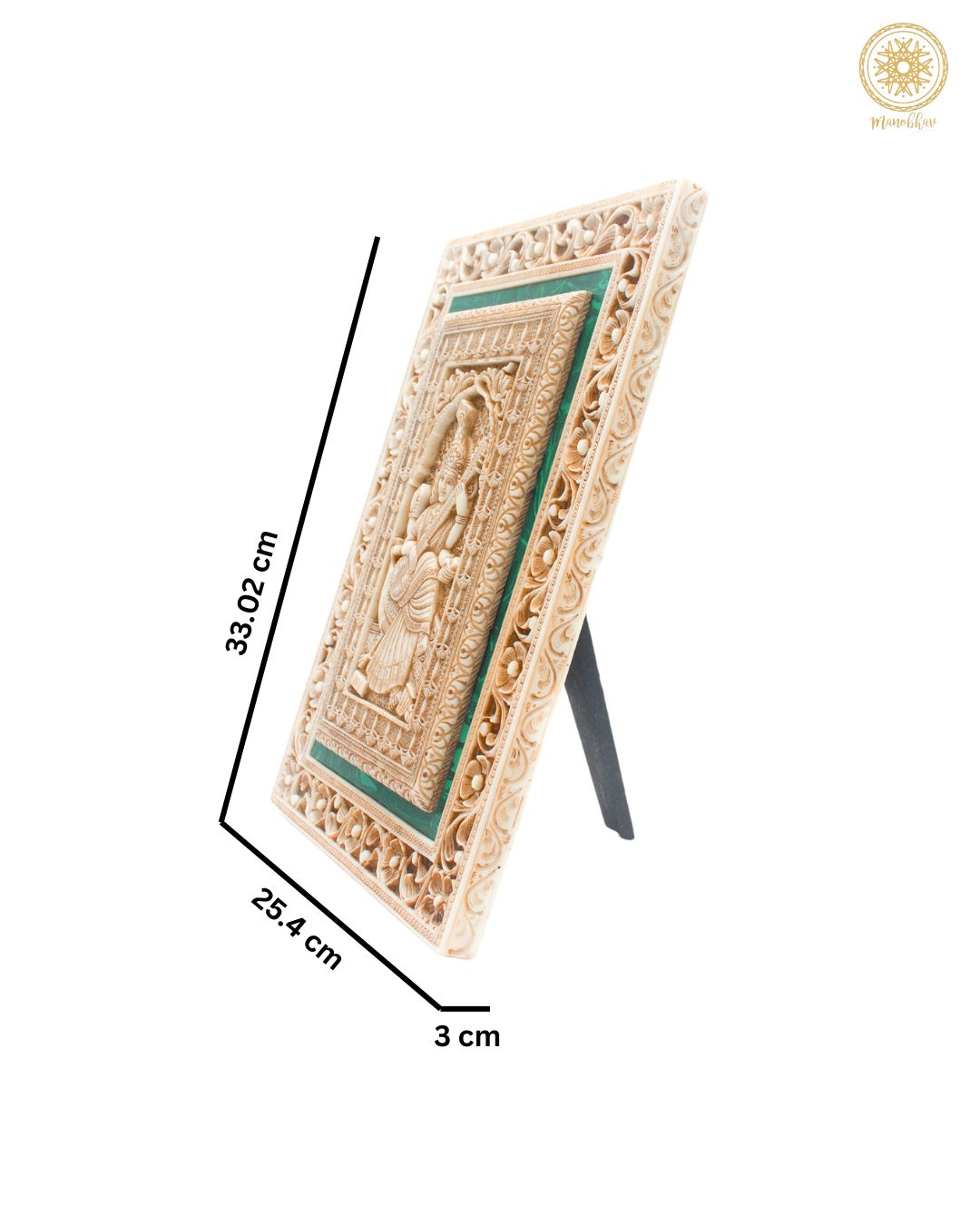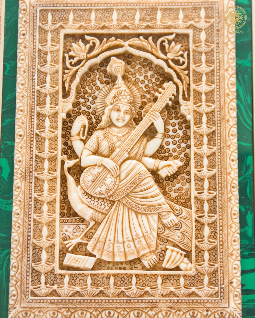 Ce magnifique cadre mural sculpté à la main est un hommage à la présence divine de la déesse Sarasvati. Le luxueux travail de malachite décore le cadre Saraswati ji, qui symbolise la sagesse, la musique et l'apprentissage. Cela en fait une pièce de décoration intérieure parfaite pour les érudits, les musiciens et les artistes. Les détails de la sculpture témoignent du savoir-faire et du dévouement de l'artisan qui a réalisé cette belle combinaison d'art et de spiritualité. Cette magnifique décoration d'intérieur de la déesse Sarasvati peut être un excellent ajout, que vous souhaitiez créer votre propre art mural ou construire un espace sacré dans votre maison. Placez-le dans votre salon, votre salle d'étude ou comme élément unique dans un cadre mural de galerie pour un signe de classe et d'énergie divine.