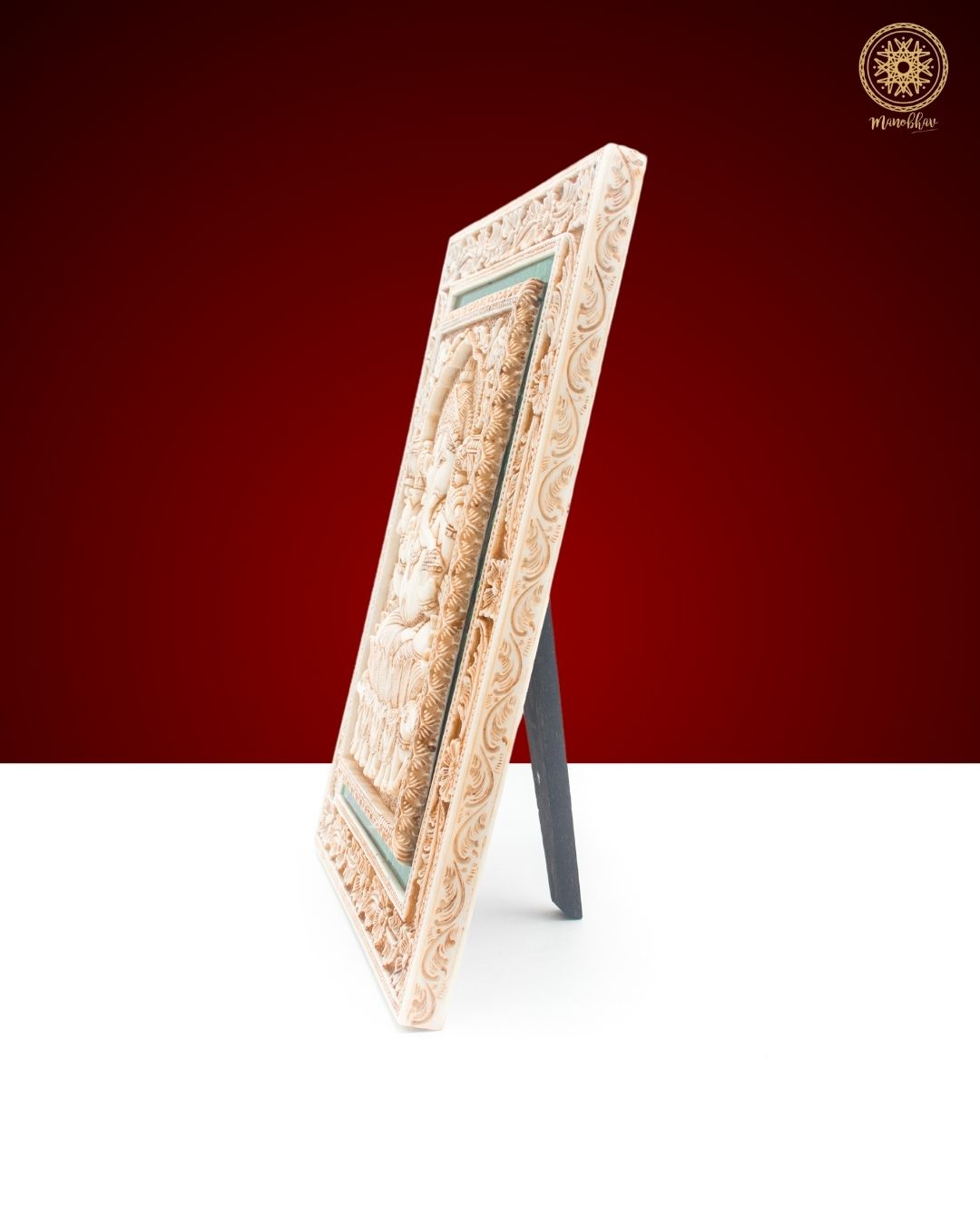 Ce cadre mural représentant Ganesh représente des sculptures complexes avec une finition antique qui imite parfaitement l'apparence de l'ivoire véritable. De plus, orné d'incrustations de malachite, ce cadre Ganpati représente le Seigneur Ganesh, la divinité de la sagesse et de l'élimination des obstacles.