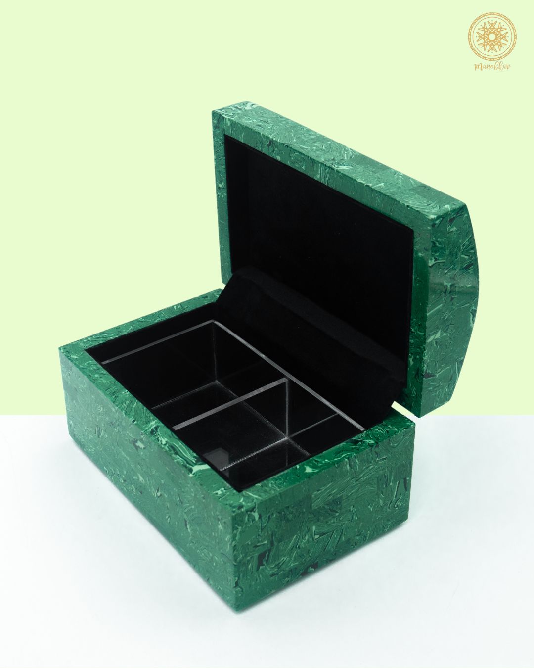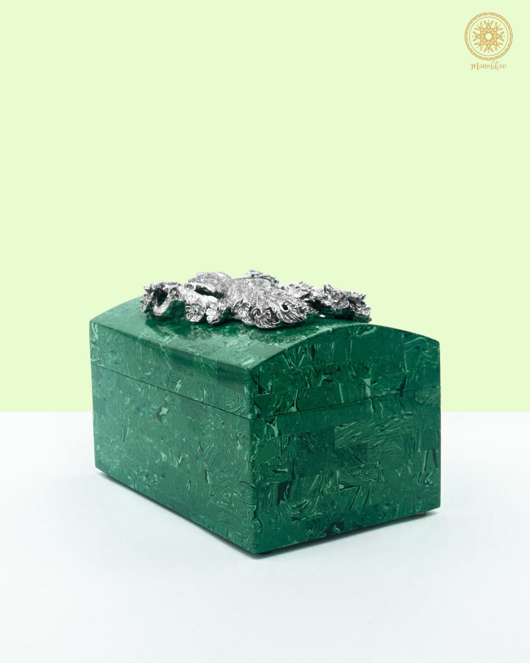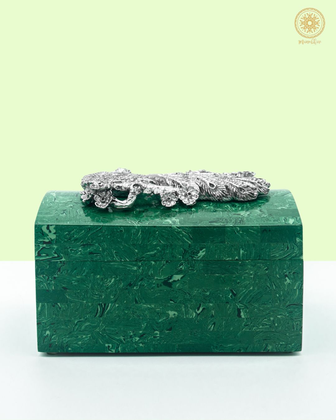 Ce coffret à bijoux en malachite est fabriqué par des mains expertes et présente des profondeurs vertes soigneusement polies. À l'intérieur, un paon en argent est ajouté, ce qui augmente sa beauté et préserve l'attrait esthétique de vos bijoux.