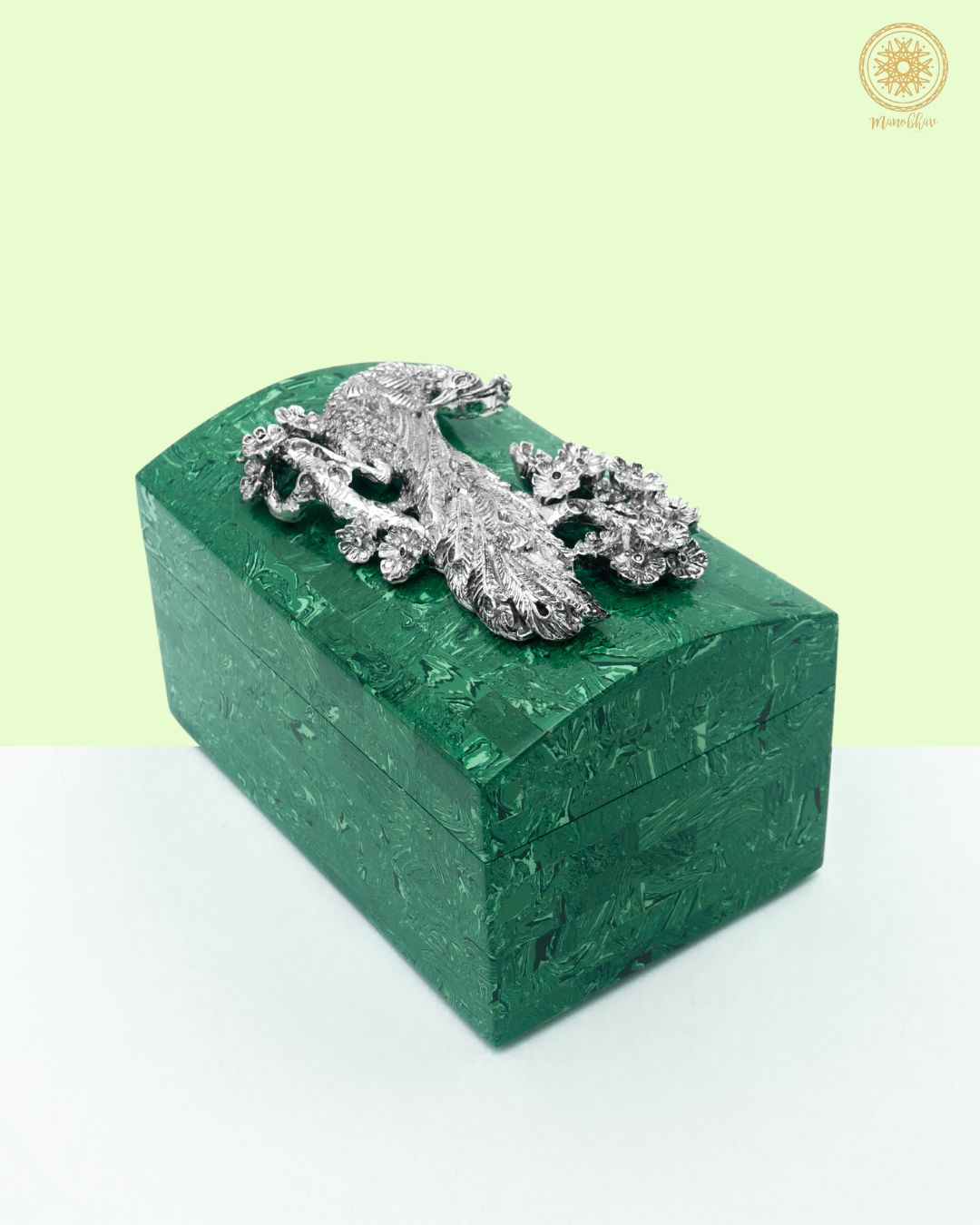 Coffret à bijoux en malachite orné d'un paon argenté