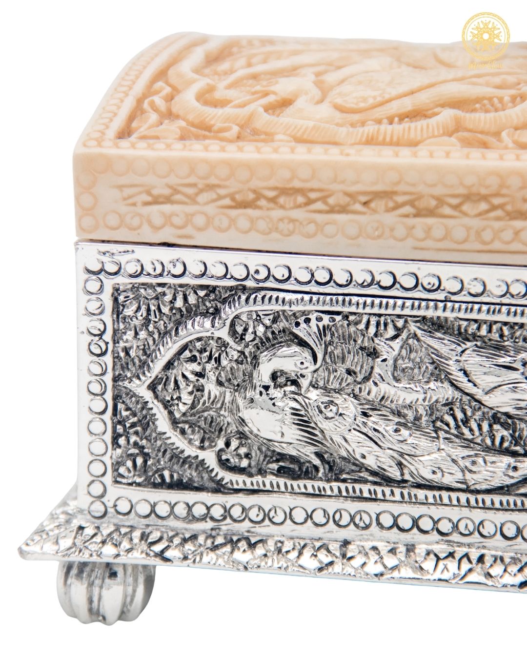 This dual-tone silver and resin decorative jewelry storage box is designed to be both attractive and useful. It has broad sections for different kinds of jewelry such as earrings, rings, and chains. From necklaces to earrings, storage solutions are available in this well designed box. The outer surface of the box is embellished with beautiful peacock patterns which makes the box look old-fashioned, which suits people who are fond of antique jewelry boxes. Safekeep your valuables with some panache. This jewelry case is more than an organizer; it is also a stunning piece of art suitable for any interior design.