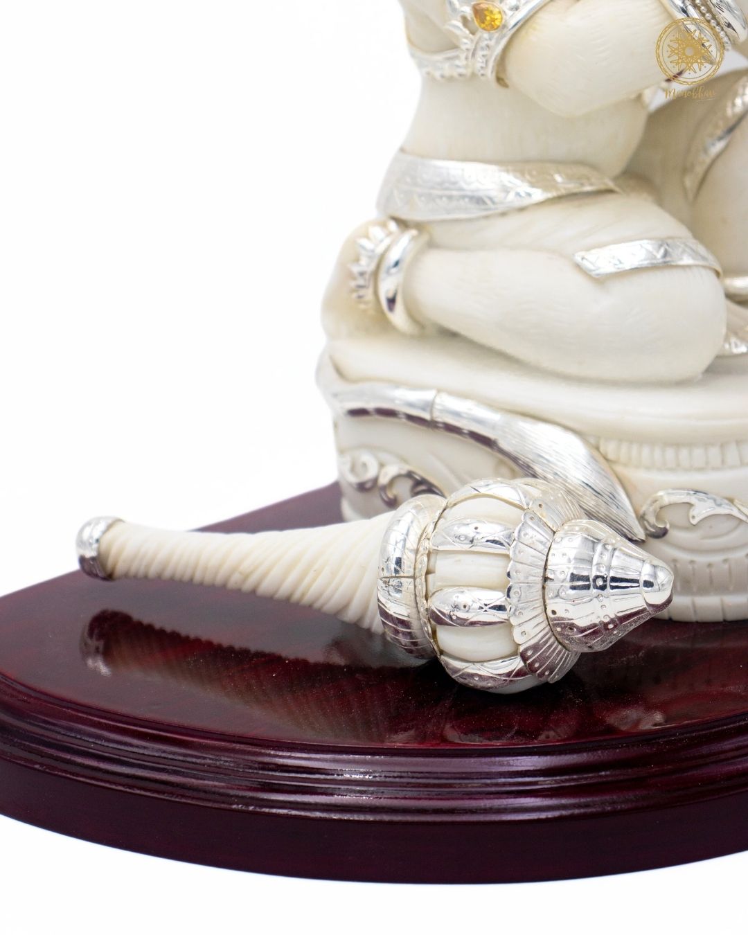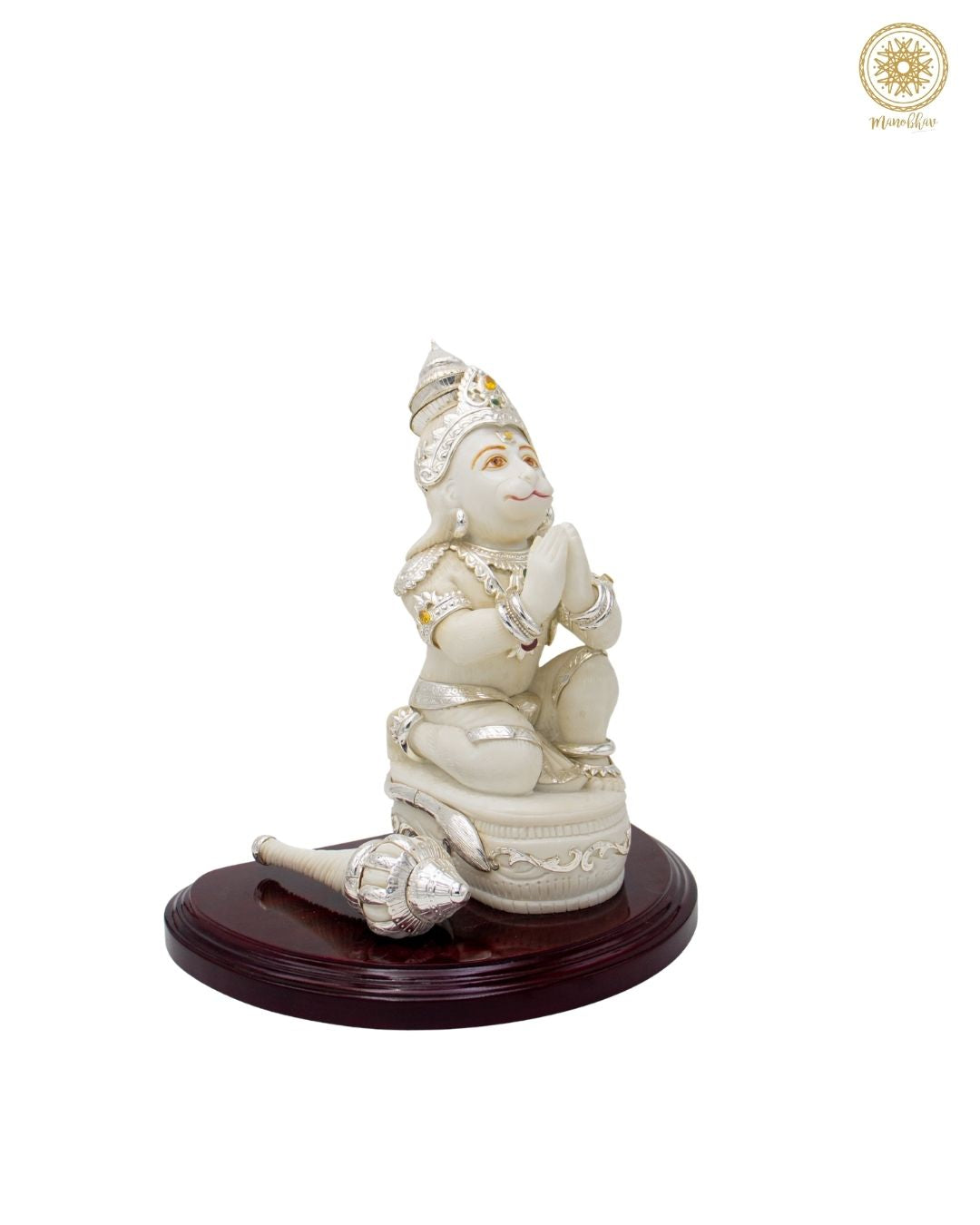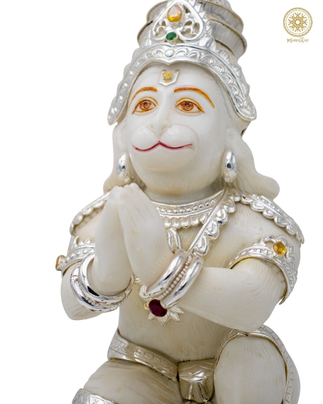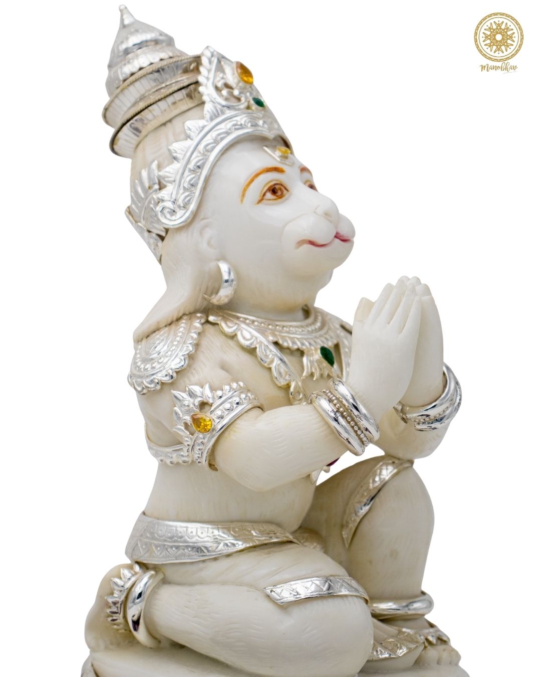 This lovely Hanuman idol is carefully made by hand using strong marble dust. It is painted neatly and decorated with shiny silver finish jewelry that makes it look bright and special. Hanuman ji is shown sitting in a calm pose, blessing everyone with peace and courage. His gada placed beside him shows his power and bravery.