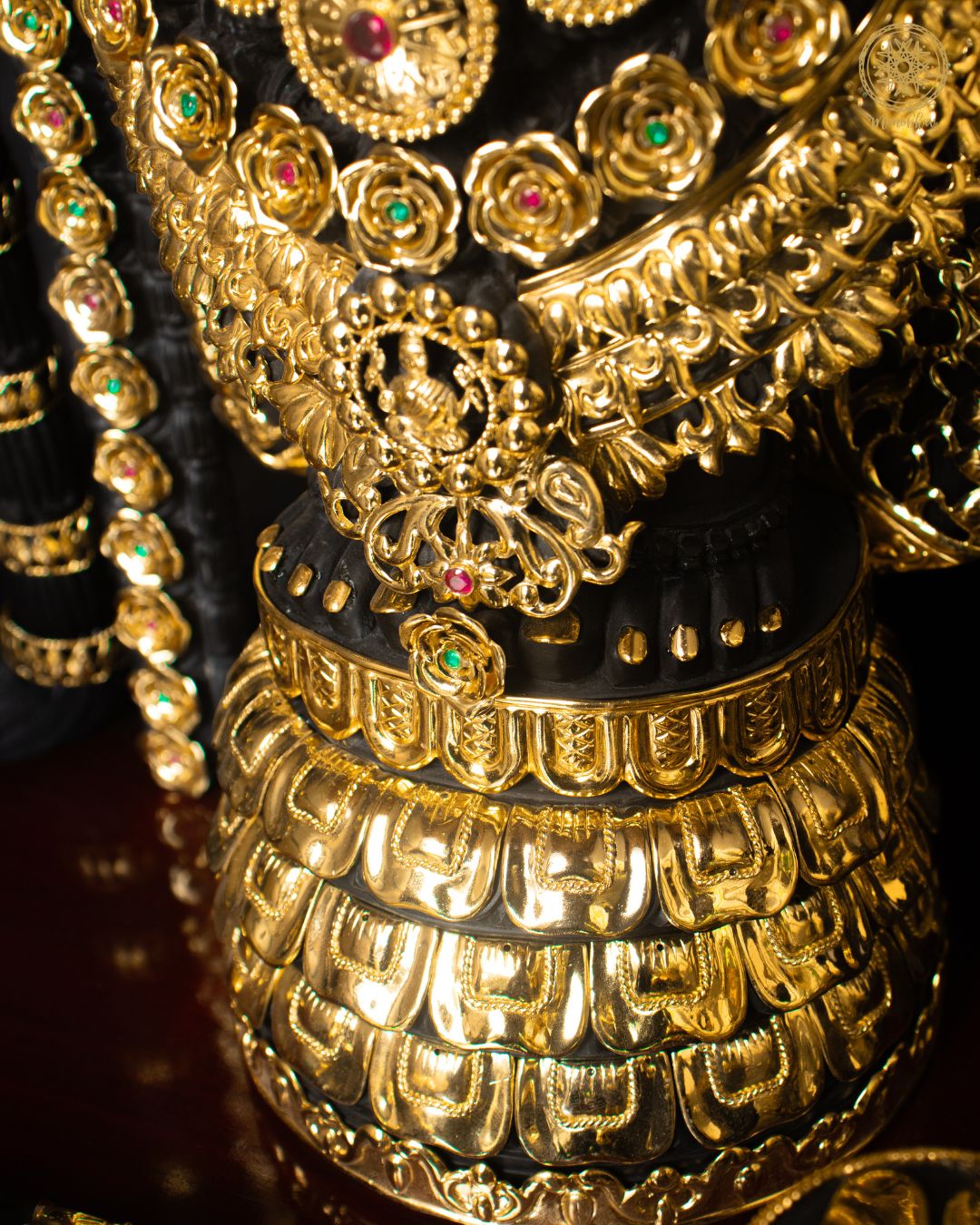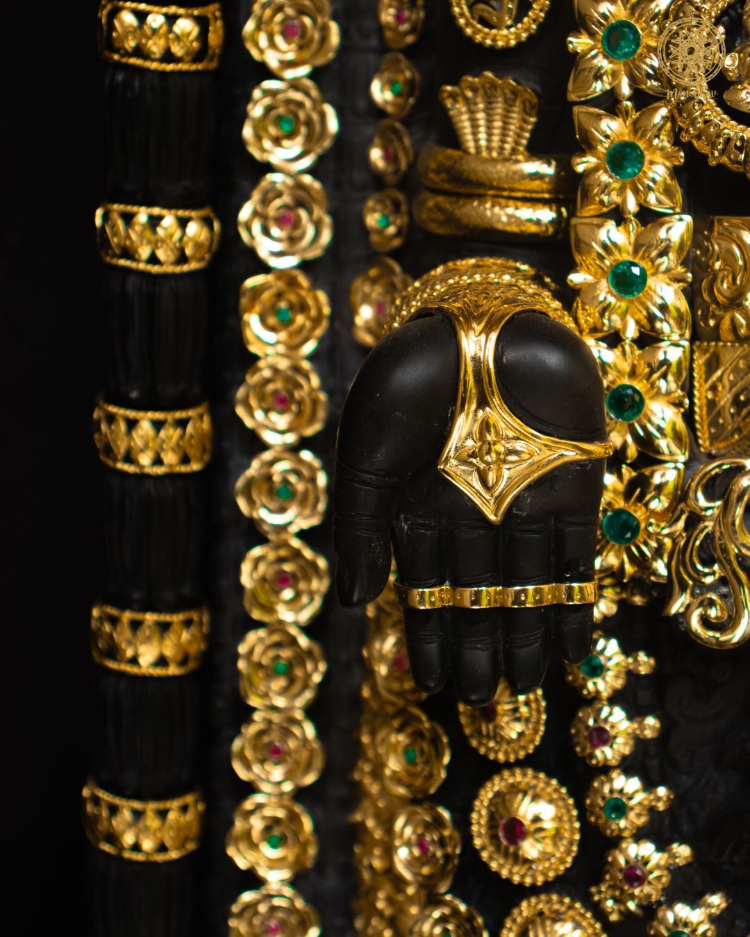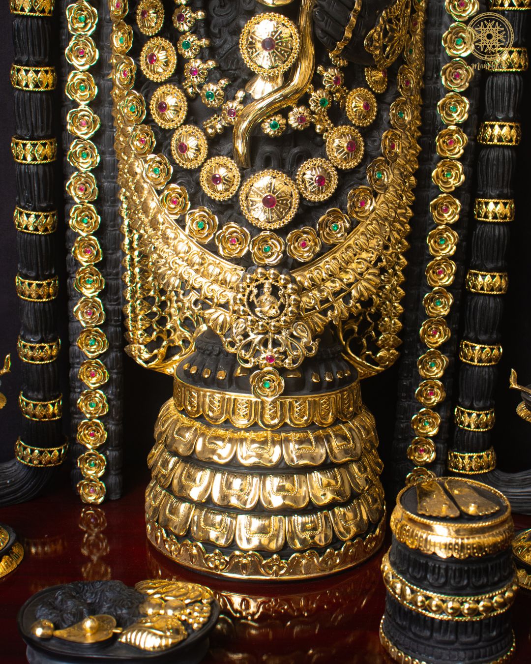 This statue shows Balaji in his sacred standing posture. His crown, ornaments, and traditional design are carefully crafted by hand. The gold-plated jewelry highlights the fine details and makes the idol look grand yet divine. The black base color and golden shine together create a powerful and elegant appearance.