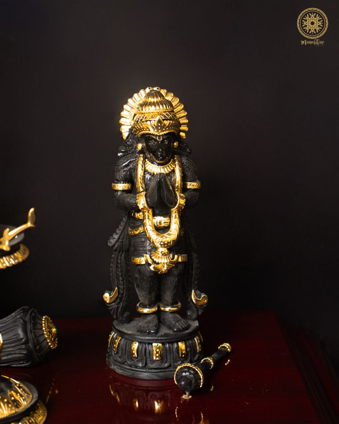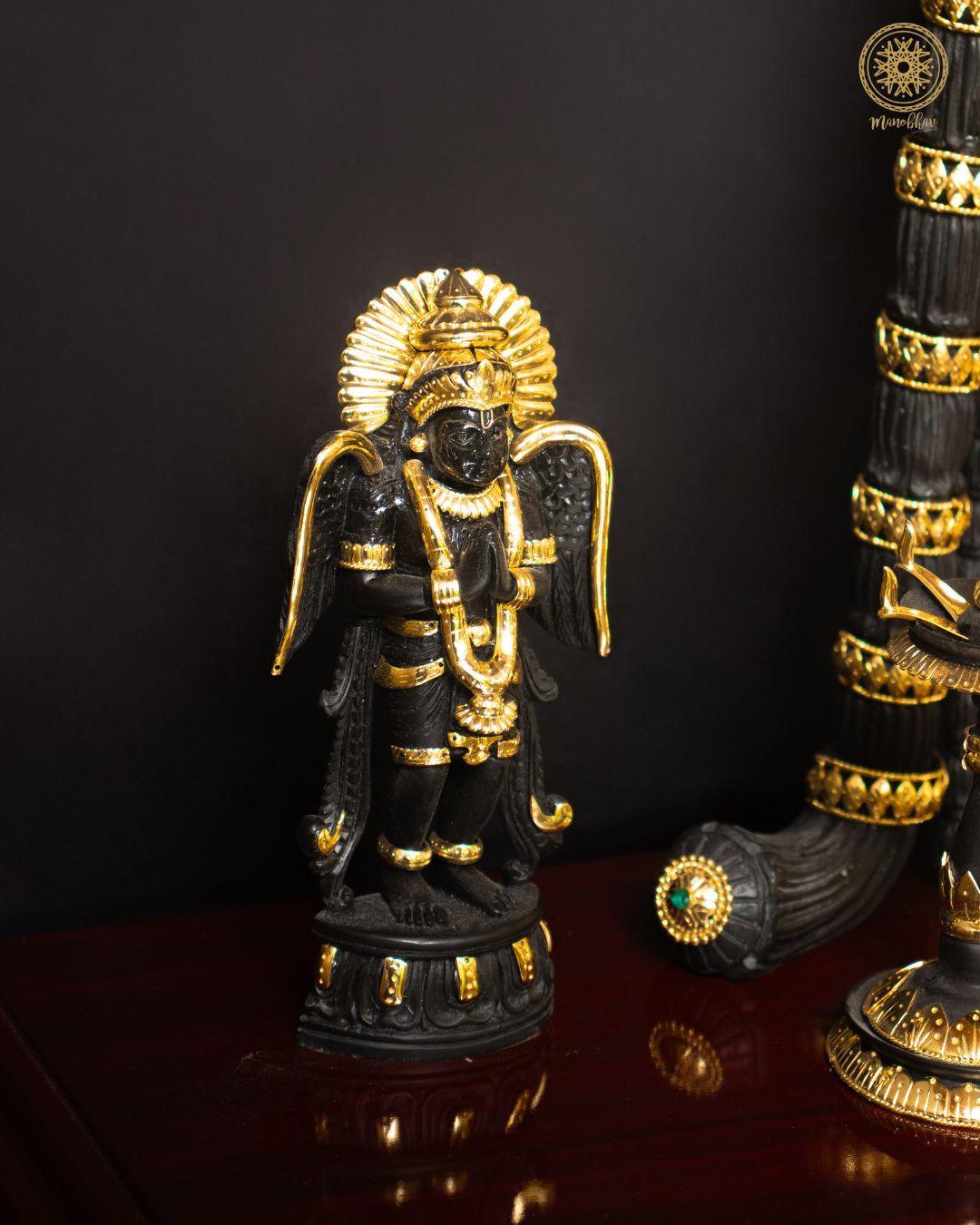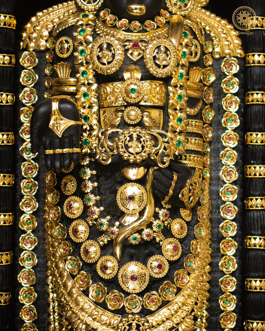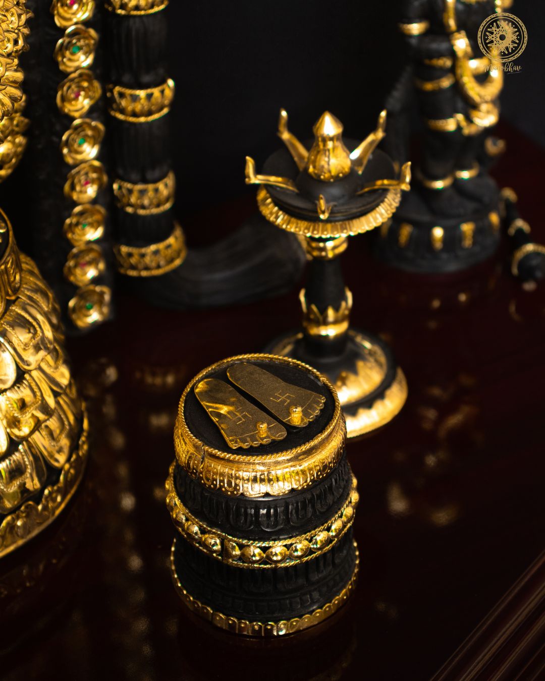 This statue shows Balaji in his sacred standing posture. His crown, ornaments, and traditional design are carefully crafted by hand. The gold-plated jewelry highlights the fine details and makes the idol look grand yet divine. The black base color and golden shine together create a powerful and elegant appearance.