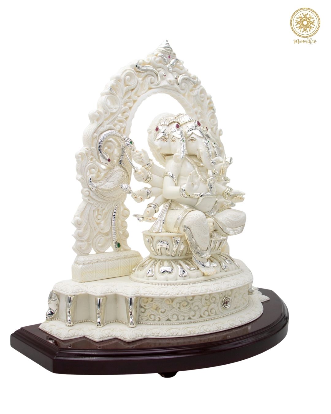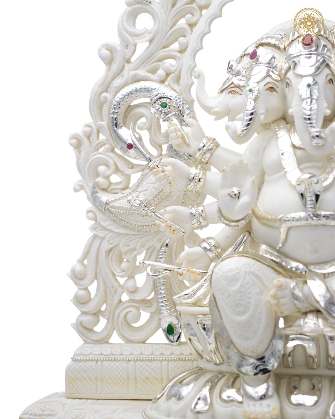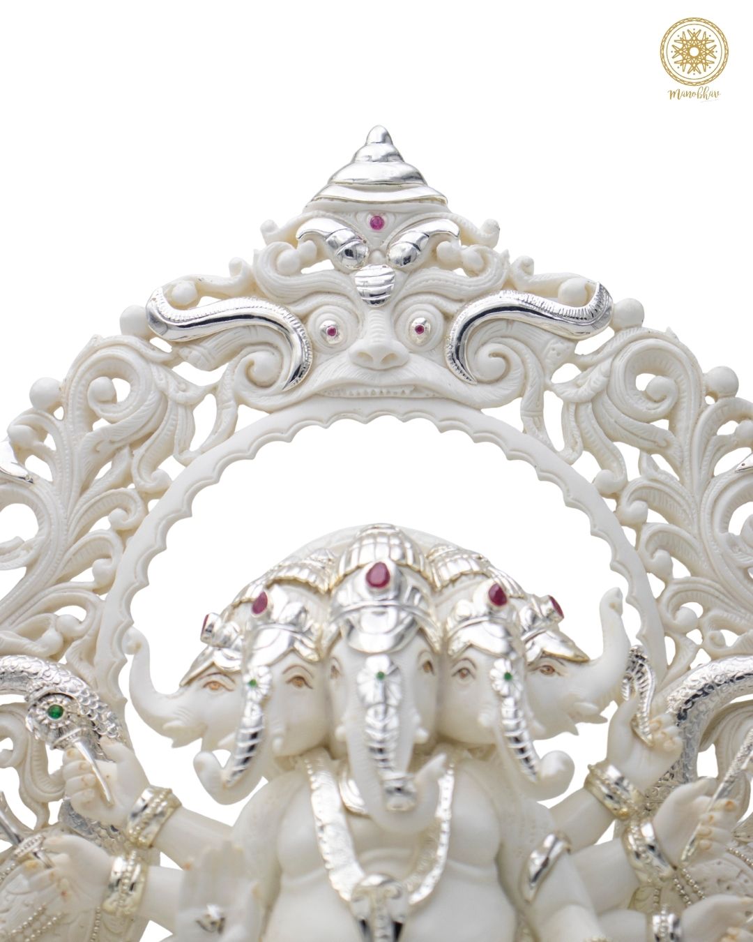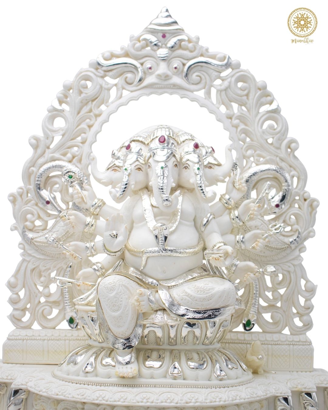 This beautiful white Panchmukhi Ganesha idol is made with fine marble dust and decorated with shining silver-plated jewelry. The clean white color gives it a pure and peaceful look, while the silver ornaments add a soft royal touch.