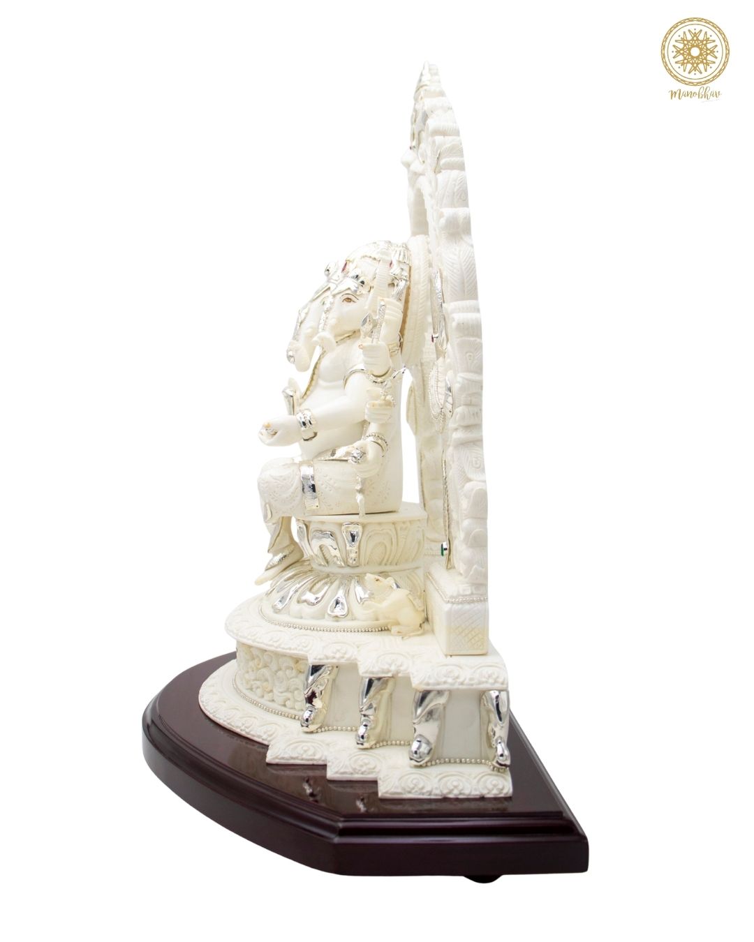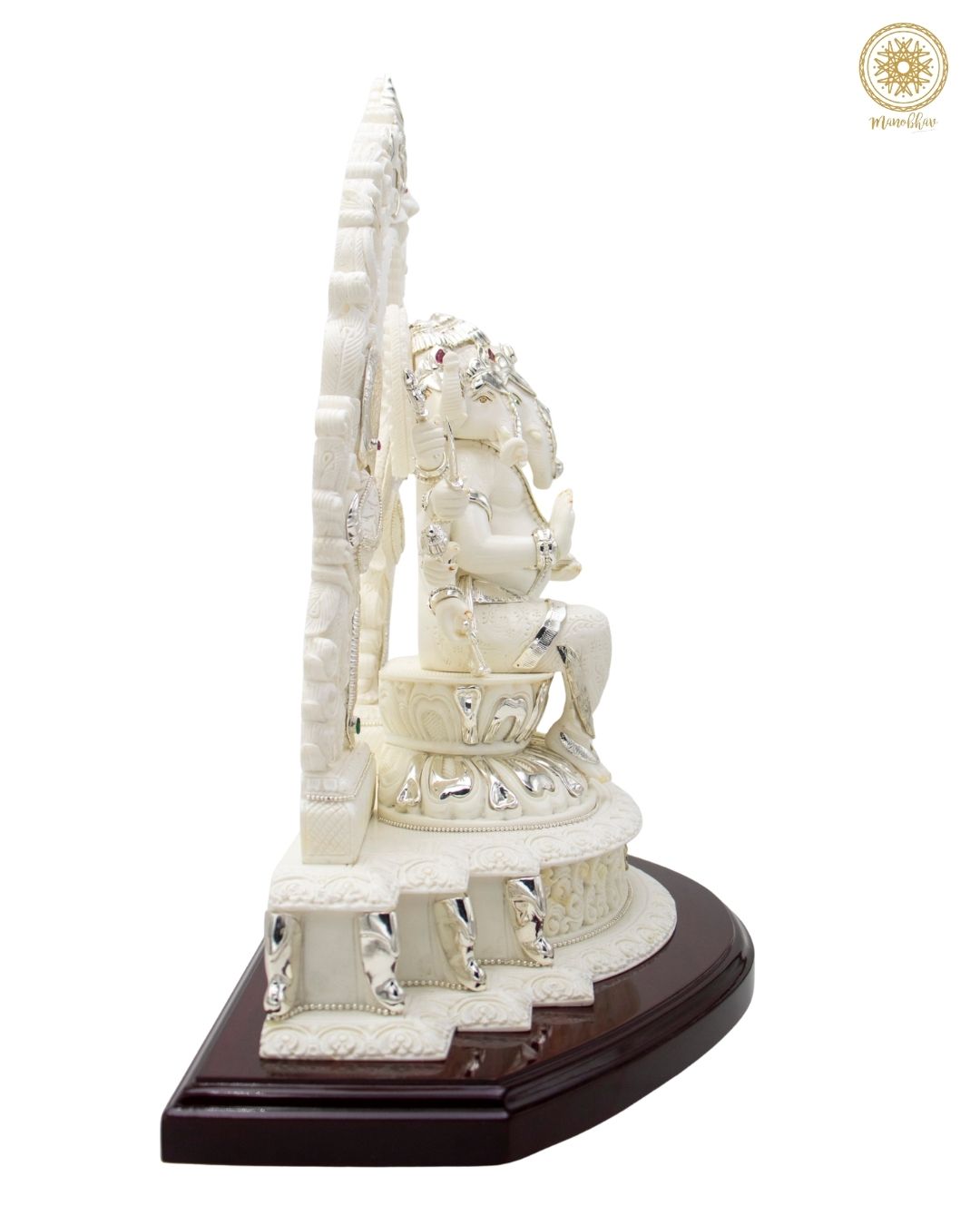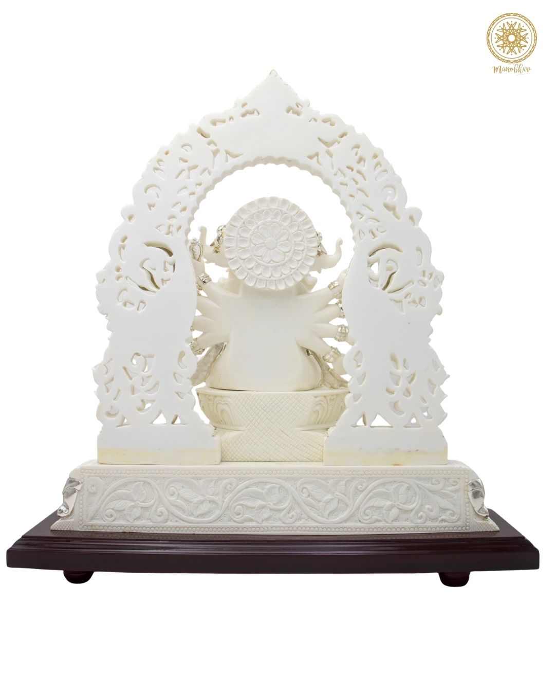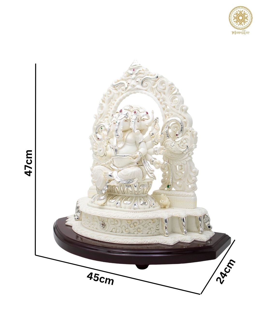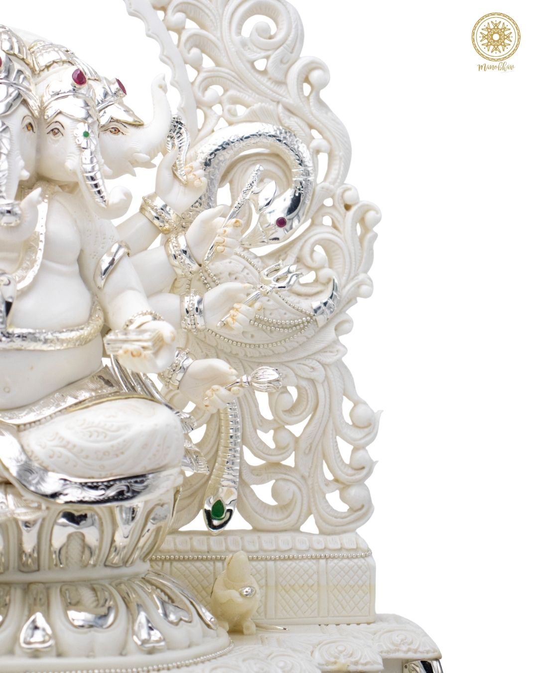 This beautiful white Panchmukhi Ganesha idol is made with fine marble dust and decorated with shining silver-plated jewelry. The clean white color gives it a pure and peaceful look, while the silver ornaments add a soft royal touch.