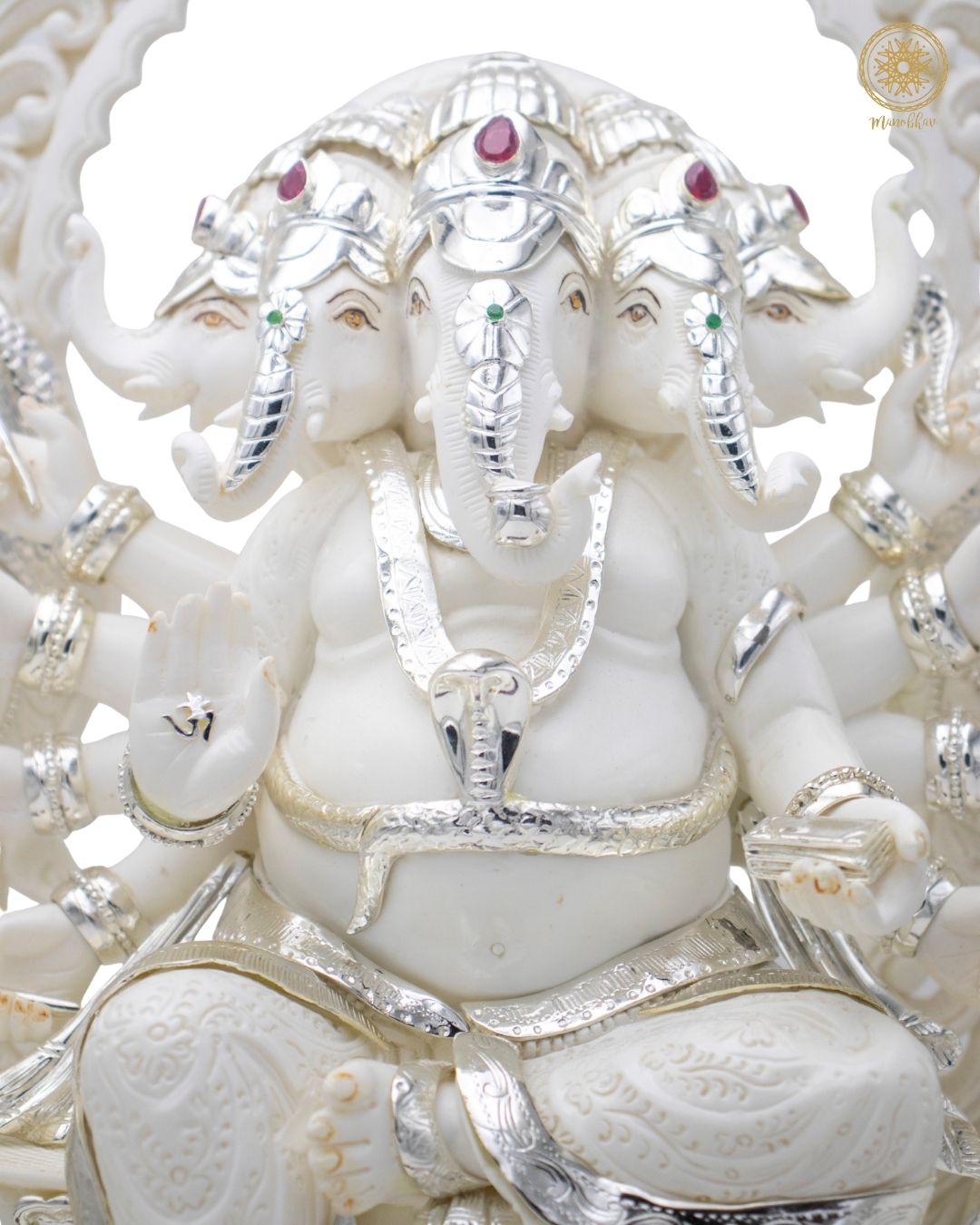 White Panchmukhi Ganesha Idol with Silver-Plated Jewelry for Home Temple